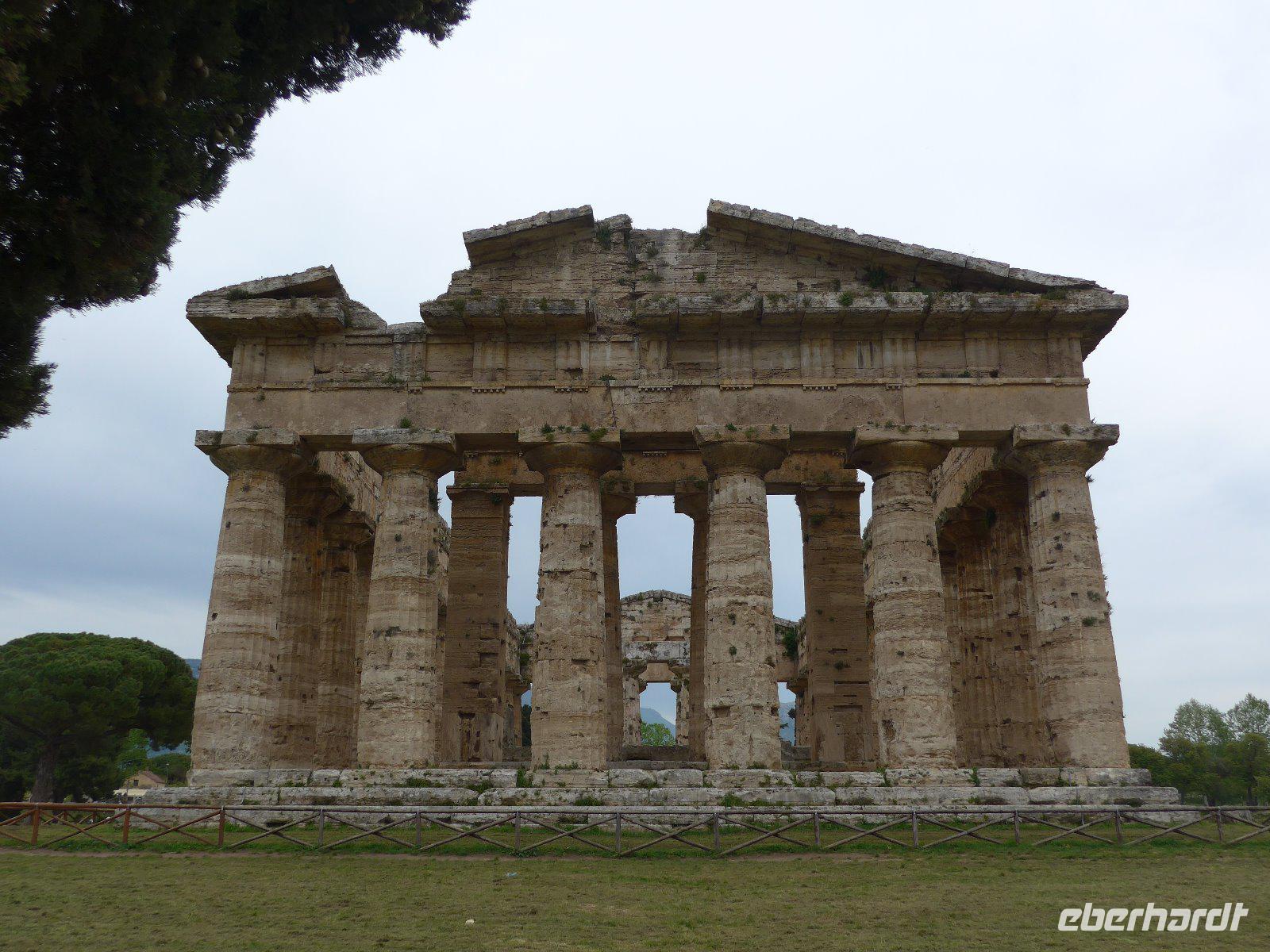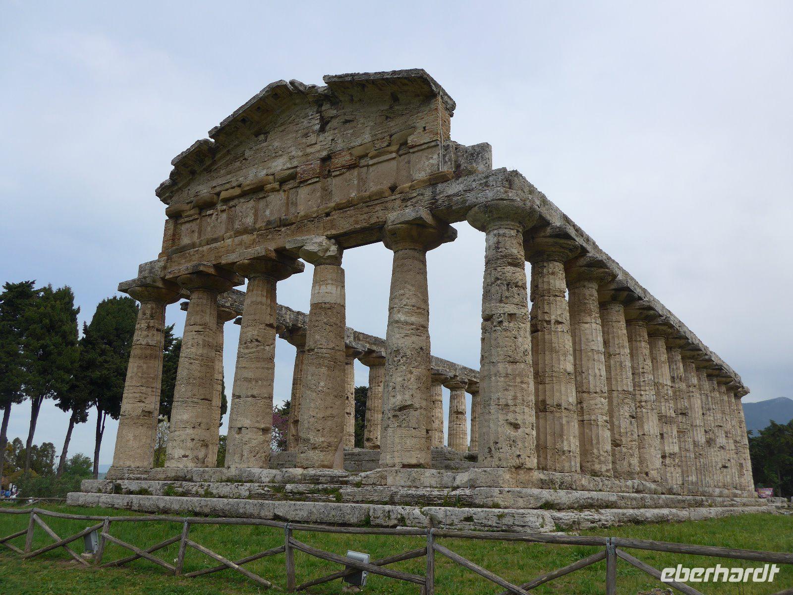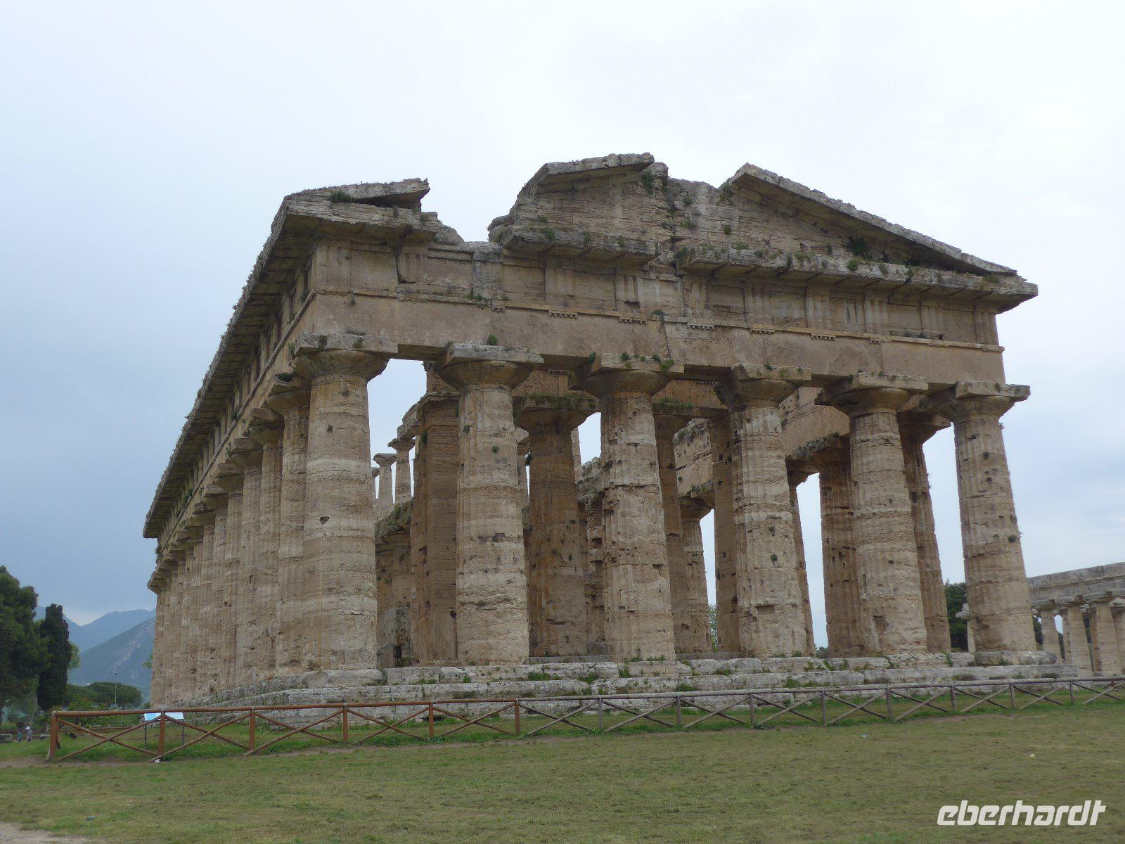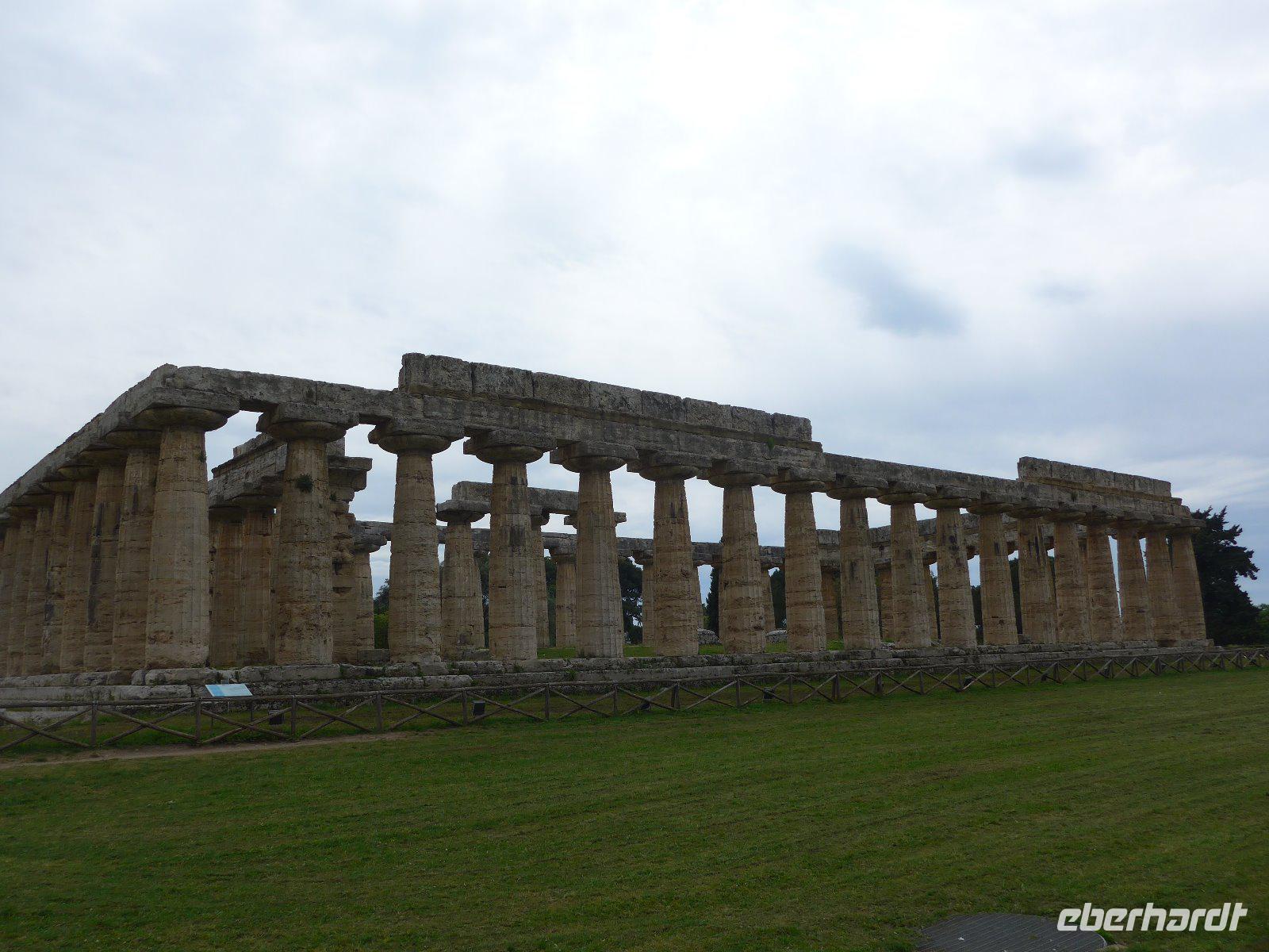 Man muss nicht unbedingt auf die Akropolis fahren um griechische Tempel zu sehen. In Paestum findet man auch ein Stück „Griechenland" auf italienischen Boden. Schon Goethe hat diesen Ort bei seiner Italienreise besucht. Griechische Siedler gründeten den Ort und gaben ihm den Namen Poseidonia. Erst mit der römischen Herrschaft erhielt er den heutigen Namen Paestum. Sprichwörtlich im Sumpf versunken war er für 900 Jahre vergessen. Erst zufällig bei Straßenbauarbeiten wurde er im 18. Jahrhundert entdeckt. Für jeden Bildungsbeflissenen durfte dieser Ort auf seiner Reise nicht fehlen. So hat sich auch die Eberhardt- Reisegruppe aufgemacht ihre Eindrücke zu sammeln. Bei einem Rundgang unter fachkundiger Führung machten wir an den Tempeln aber auch an den für das Alltagsleben der Antike wichtigen Orten halt. Natürlich beeindruckte der gut erhaltenen Neptuntempel, aber auch der Cerestempel sowie die Basilica. Goethe hielt in seinen Aufzeichnungen auch seine Begegnung mit den Büffeln der Region fest. Es beschrieb sie als nilpferdartig mit blutroten Augen. Ob Übertreibung oder doch ein wenig Wahrheit. Bei einer Besichtigung auf einer Büffelfarm Vannulo konnten wir diesem auf den Grund gehen. Selbstverständlich war dies nicht der Hauptgrund des Besuches, vielmehr wollten wir alles um einen der vielen bekannten Käse Italiens erfahren - den Büffelmozzarella. Bei einer Führung erfuhren wir einiges zur Herstellung und im Anschluss konnten wir uns selbst von der Köstlichkeit des Käses überzeugen.