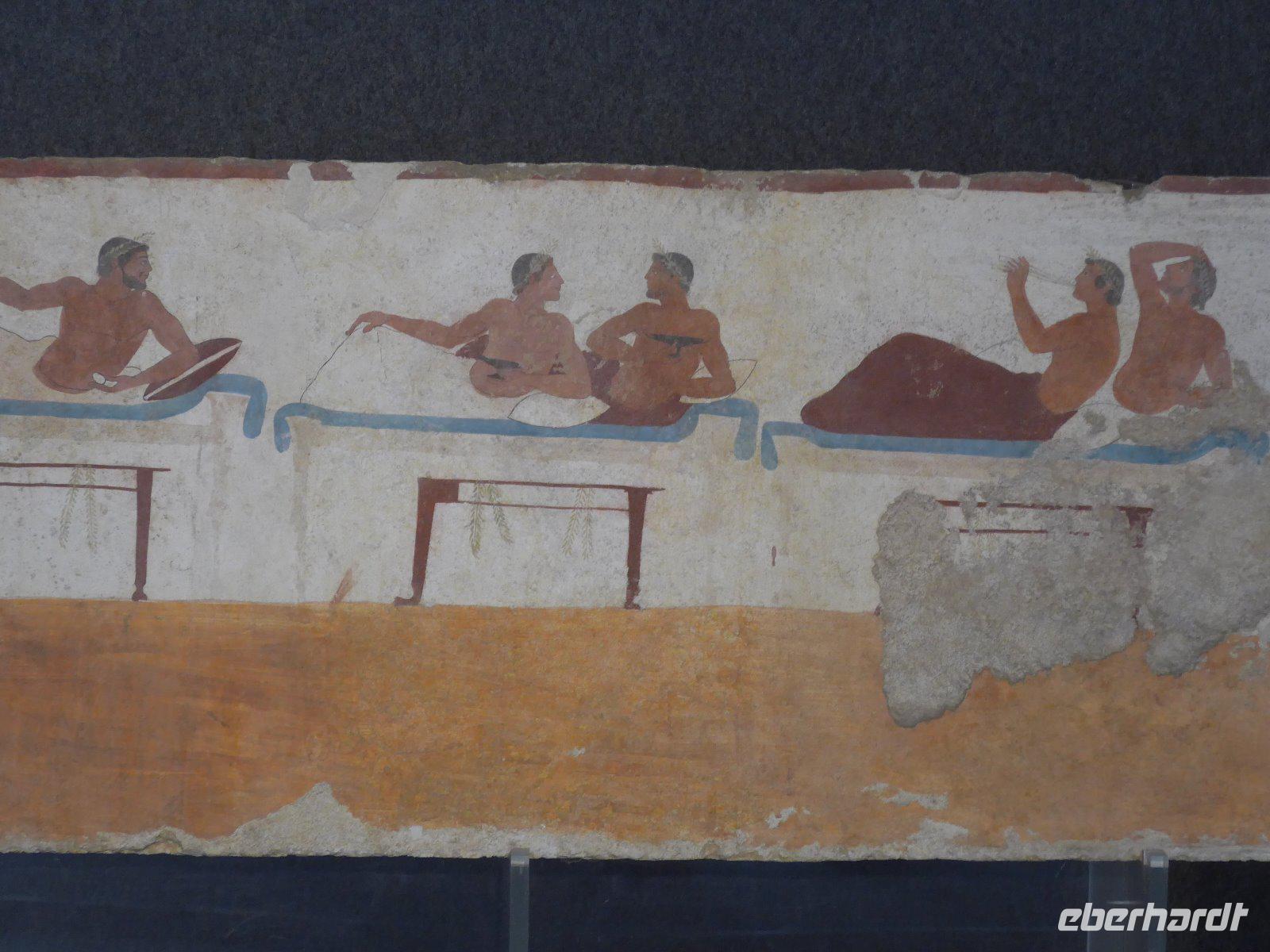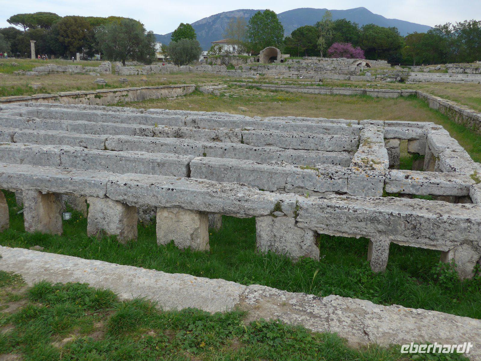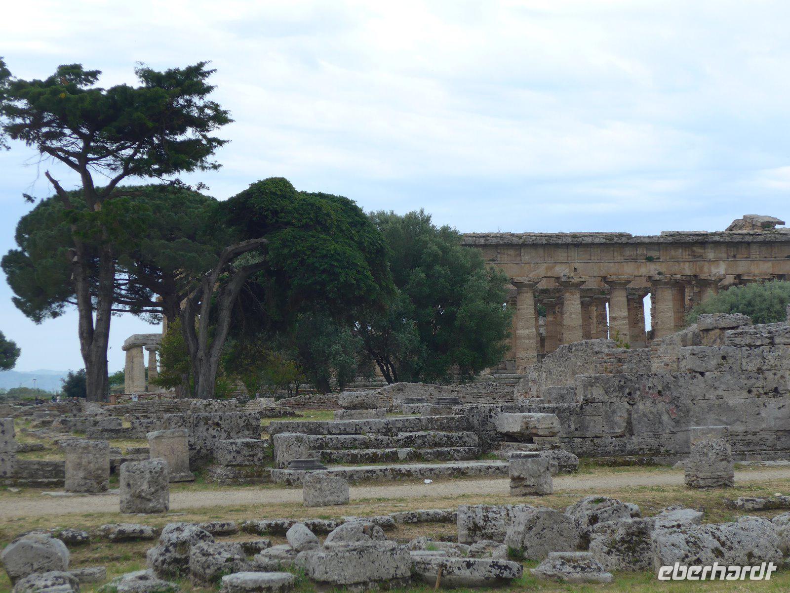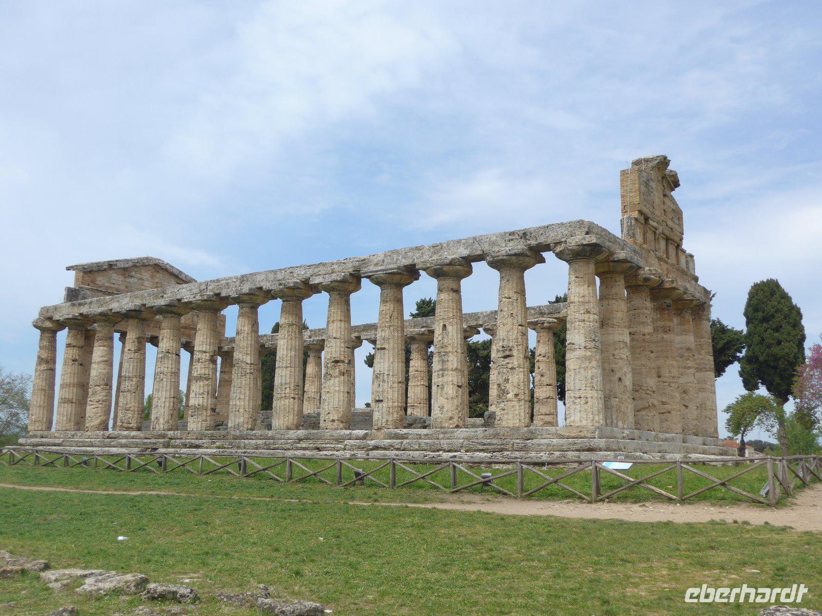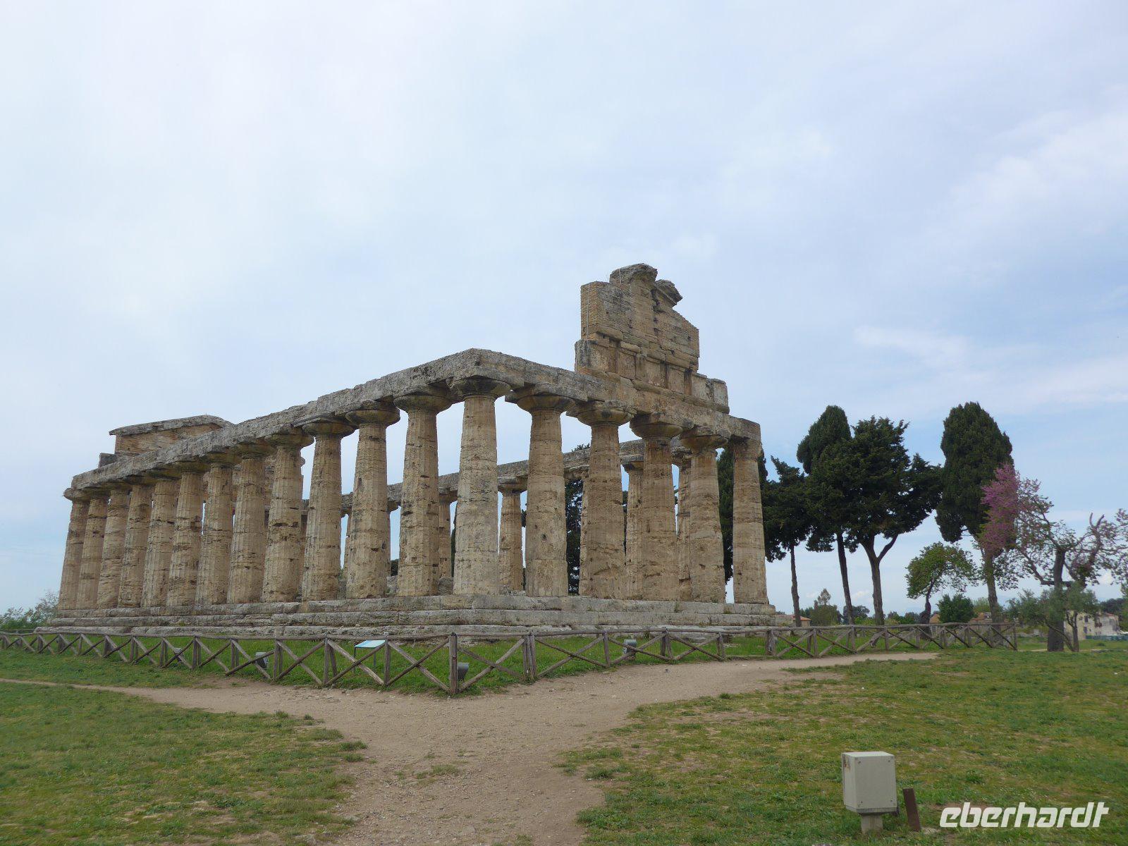 Man muss nicht unbedingt auf die Akropolis fahren um griechische Tempel zu sehen. In Paestum findet man auch ein Stück „Griechenland" auf italienischen Boden. Schon Goethe hat diesen Ort bei seiner Italienreise besucht. Griechische Siedler gründeten den Ort und gaben ihm den Namen Poseidonia. Erst mit der römischen Herrschaft erhielt er den heutigen Namen Paestum. Sprichwörtlich im Sumpf versunken war er für 900 Jahre vergessen. Erst zufällig bei Straßenbauarbeiten wurde er im 18. Jahrhundert entdeckt. Für jeden Bildungsbeflissenen durfte dieser Ort auf seiner Reise nicht fehlen. So hat sich auch die Eberhardt- Reisegruppe aufgemacht ihre Eindrücke zu sammeln. Bei einem Rundgang unter fachkundiger Führung machten wir an den Tempeln aber auch an den für das Alltagsleben der Antike wichtigen Orten halt. Natürlich beeindruckte der gut erhaltenen Neptuntempel, aber auch der Cerestempel sowie die Basilica. Goethe hielt in seinen Aufzeichnungen auch seine Begegnung mit den Büffeln der Region fest. Es beschrieb sie als nilpferdartig mit blutroten Augen. Ob Übertreibung oder doch ein wenig Wahrheit. Bei einer Besichtigung auf einer Büffelfarm Vannulo konnten wir diesem auf den Grund gehen. Selbstverständlich war dies nicht der Hauptgrund des Besuches, vielmehr wollten wir alles um einen der vielen bekannten Käse Italiens erfahren - den Büffelmozzarella. Bei einer Führung erfuhren wir einiges zur Herstellung und im Anschluss konnten wir uns selbst von der Köstlichkeit des Käses überzeugen.