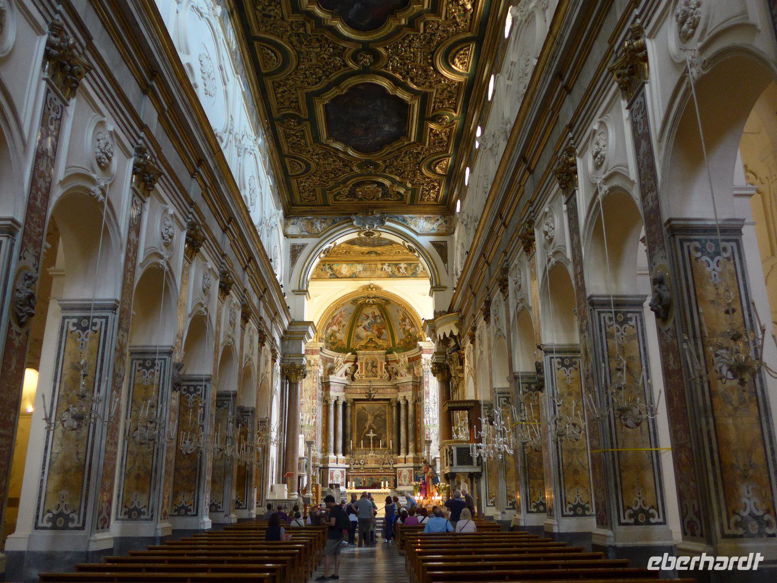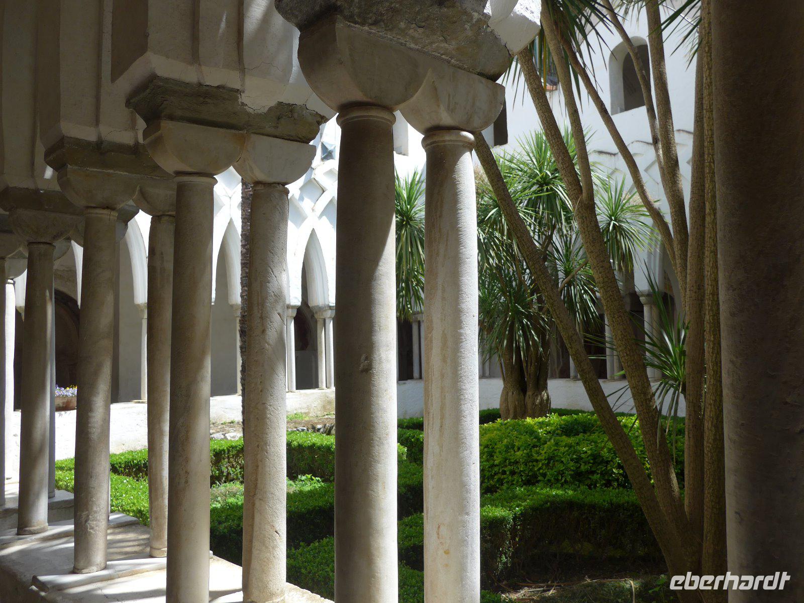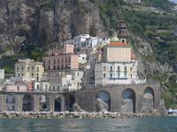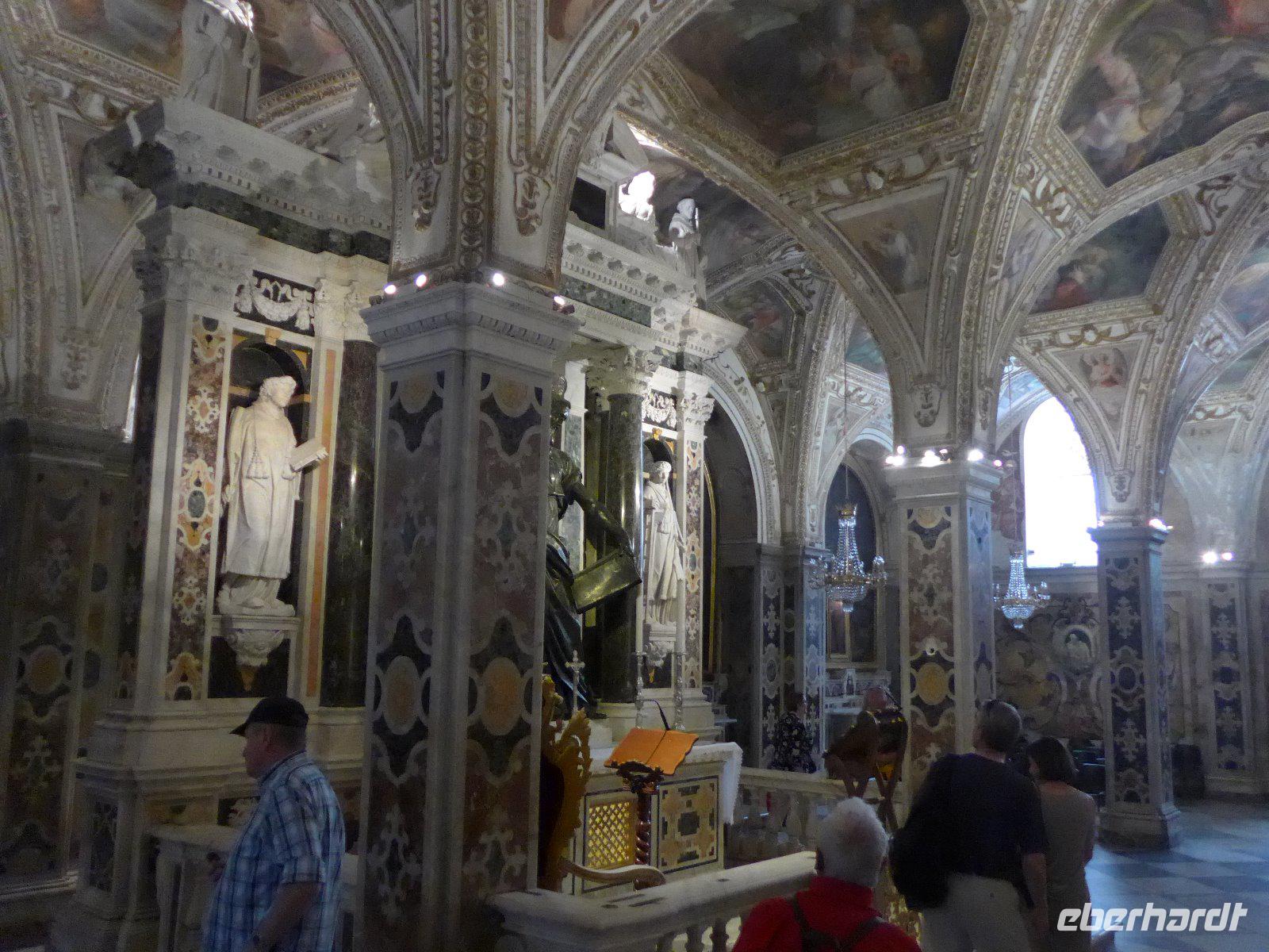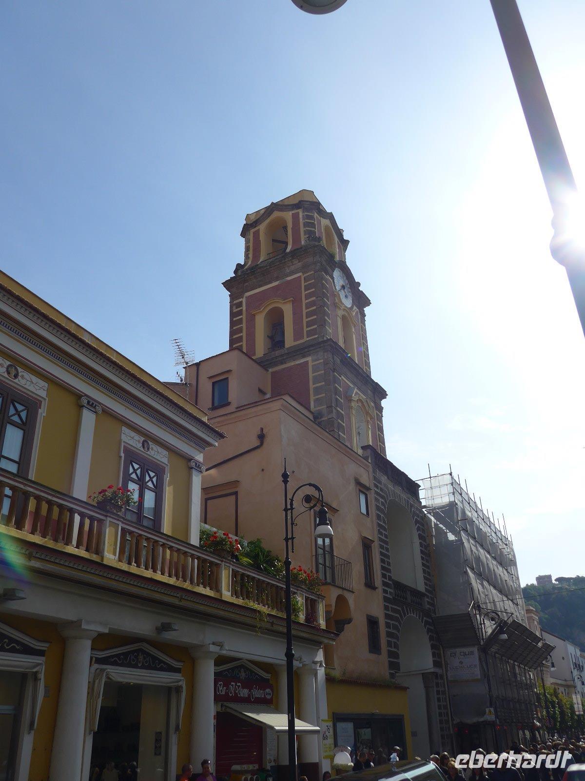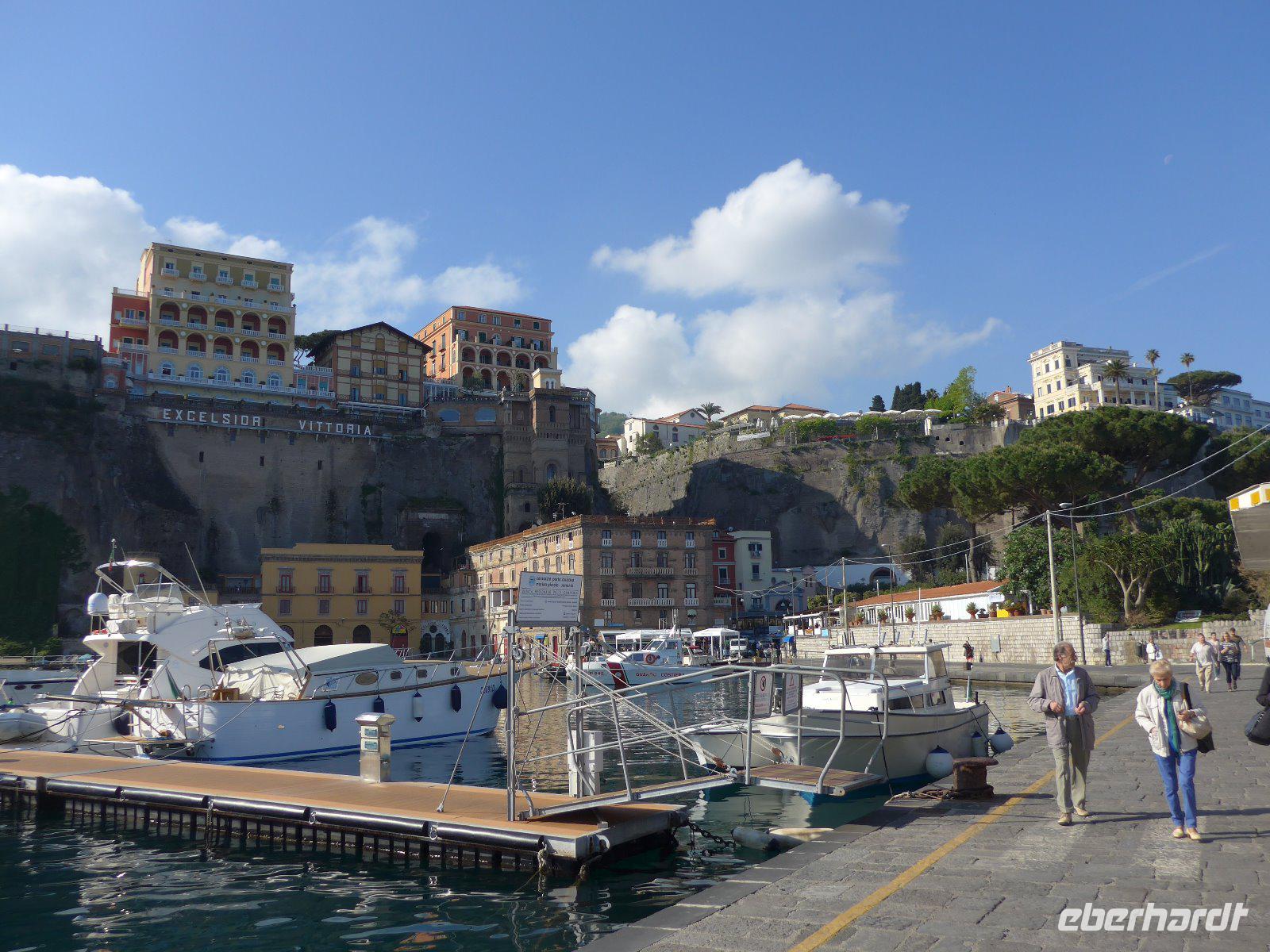Die Amalfiküste, der Ort wo die Zitronen blühen, sei die schönste Küste der Welt. Unsere Gruppe wollte sich heute selbst ein Bild davon machen. Senkrecht aufragende Felswände am glitzernden Tyrrhenischen Meer. So stellte sich uns dieser Ort vor. Man hatte das Gefühl zwischen Himmel und dem Abgrund zu sein. Hier wurde in abenteuerlicher Weise eine der schönsten Küstenstraßen gebaut. An jeder Ecke ein interessantes Fotomotiv. Und einige der schönsten Dörfer Italiens scheinen fast wie an den Felsabhängen zu kleben. Positano war unser erster Stopp. Schon John Steinbeck nannte ihn „der einizige senkrechte Ort der Welt". Alle steilen Gassen laufen auf den kleinen Strand zu. Kurve für Kurve, Serpentine für Serpentine steuerten wir unser nächstes Ziel Amalfi an. Nun wird dem letzten Bewusst, warum man hier nur mit einem einheimischen Busfahrer unterwegs sein kann. Geübt und mit der nötigen Gelassenheit umfährt er jede noch so kleine „Klippe". Ob Tourist mit großen Wohnmobil oder der sonstige Gegenverkehr ist für unseren italienischen Fahrer kein Problem. Im Gegensatz zu Positano bietet Amalfi einen majestätischen Dom. Mit seiner pinsittoresk-bunten Fassade - ein kunstgeschichtliches Highlight - manifestiert er die Seerepublik Amalfis aus dem 11. Jahrhundert. Doch vorher erlebten wir die atemberaubende Küste wie sie die Seefahrer vom Wasser aus erleben. So manche Villa prominenter Persönlichkeiten konnte vom Boot aus ausgemacht werden. Am Ende hatte jeder auf seine Weise Gelegenheit diesen Ort zu entdecken. So mancher stellte auch fest, dass Schönheit seinen Preis hat. Über viele Kurven ging es übers Gebirge und am Ort Ravello vorbei zur Autobahn bis nach Sorrent. Dort noch einen kleinen Stadtbummel im Zentrum und dann ging es zum Hotel zurück. Kurz vor dem Ziel erlebten wir noch ein Naturschauspiel. Wolkenformationen gepaart mit strahlendem Sonnenschein und das direkt an einem Ort, an dem man beide Golfe (Golf von Sorrent u. Golf von Amalfi sehen konnte).