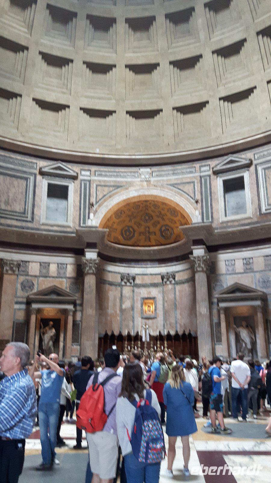 Nach dem Frühstück fuhren wir gemeinsam mit öffentlichen Verkehrsmitteln in die Stadt hinein. Nach einer Fahrt mit dem Linienbus bzw. einem kleinen Spaziergang kamen wir am Petersplatz, dem Zentrum der katholischen Christenheit, an. Ach so, wir waren ja jetzt eigentlich gar nicht mehr in Rom, sondern im Vatikan. Wenn man von hier nach ganz rechts oben schaut, sieht man das Arbeitszimmer des Papstes, letzter Stock des Apostolischen Palastes, zweites Fenster von rechts. Sonntags um zwölf spricht er hier das Angelus-Gebet. Unter den Kolonnaden des Bernini erspäht man die Schweizergarde - jawohl, immer noch echte Schweizer, und die Uniform ist noch die, welche Michelangelo entworfen hat. Am anderen Ende der Piazza, majestätisch wie ein ruhender Löwe - die Peterskirche, die wir nunmehr besichtigten. Allein der Baldachin über dem Petrus-Grab ist genauso hoch wie der Palazzo Farnese, einfach gigantisch! Aber die größte Kirche der Christenheit befindet sich im kleinsten Staat der Welt, denn der Vatikan ist mit 44 Hektar Staatsgebiet nicht gewaltiger als ein mittlerer Bauernhof. Seine knapp 500 Einwohner bilden das, was man andernorts eine Dorfgemeinschaft nennen würde. Eine Kaffeebar gibt es nicht, dagegen hält der Vatikan zu 170 Staaten diplomatische Beziehungen und der Papst empfängt weitaus mehr Staatsmänner zur Audienz als die italienische Regierung zu offiziellen Unterredungen. Die katholische Kirche ist übrigens die einzige Weltreligion, deren Oberhaupt gleichzeitig unumschränkte Autorität eines souveränen Staates ist. Nach dem Passieren der Sicherheitskontrolle war es dann soweit - man ist einfach überwältigt! Der Petersdom ist die größte christliche Kirche der Welt und fasst 60.000 Menschen. Im Petersdom ist nach christlichem Glauben der Apostel Petrus begraben. Obwohl sie nicht offizieller Sitz des Papstes ist (diesen stellt die Lateranbasilika/San Giovanni in Laterano dar), hält der Papst hier fast alle seiner Messen. Die Kirche beherbergt zahlreiche Kunstwerke, zum Beispiel die „Pietà" von Michelangelo, die hinter Glas steht, da sie 1972 von einem Kirchenbesucher mit einer Axt beschädigt wurde. Im nordwestlichen Teil befindet sich die Statue des heiligen Petrus, deren Füße traditionell von den Pilgern geküsst werden. Über den Hauptaltar, dem Grab Petris, erstreckt sich ein 30 Meter hoher Baldachin aus Bronze, der von Bernini entworfen wurde. Wir trafen uns alle nach etwas Freizeit am Petersplatz wieder und schlenderten gemeinsam mit unserer liebenswerten Stadtführerin Agnieszka weiter in Richtung Engelsburg, einem ursprünglichen Grab-Bau für Kaiser Hadrian (117-138 n. Chr.). Den heutigen Namen erhielt das ehemalige Hadrianeum, als im Jahre 590 Papst Gregor der Große eine göttliche Vision hatte: ein Engel erschien ihm über dem Mausoleum und kündigte das Ende der damals herrschenden Pest an, indem er sein Schwert in die Scheide steckte - heute so dargestellt in der bronzenen Engelsstatue aus dem Jahre 1753 auf der Spitze des Kastells. Anschließend ging es über den Tiber bzw. die berühmte Engelsbrücke zur Piazza Navona, einem herrlichen Platz inmitten der Stadt! Gian Lorenzo Bernini schuf hier im 17. Jahrhundert einen der schönsten Brunnen des Barocks, den Vier-Ströme-Brunnen (Fontana dei Quattro Fiumi). Die vier riesenhaften Flussgötter symbolisieren die vier großen Ströme: Donau, Nil, Ganges und Rio de la Plata. Hier verbrachten wir übrigens auch unsere heutige Mittagspause und gut gestärkt flanierten wir am Nachmittag durch die engen Gassen der Altstadt zum Pantheon - ein Zylinder mit einer Kuppel drauf, so einfach-genial ist die Konstruktion des Pantheons! Markus Agrippa, Schwiegersohn von Augustus, ließ das Pantheon 27 v. Chr. den Göttern bauen. Ein paar Minuten später erreichten wir nunmehr den berühmten Trevi-Brunnen. Roms beliebteste Wasserorgel steht auf einem kleinen Platz, umgeben von sechsstöckigen Palazzi. Mit dem Bau schufen sich die Barockpäpste 1750 ein letztes großes Denkmal, denn ihre Macht im Kirchenstaat schwand dahin. Meeresgott Ozeanus braust mit zwei Pferden durch einen Triumphbogen heran. Viele Gäste warfen Münzen in den Brunnen, um nach Rom zurückzukehren. Abschließend gelangten wir zur berühmten Spanischen Treppe. Die beschwingten Balustraden der Spanischen Treppe unter der französischen Kirche Trinita dei Monti sind das harmonische Ergebnis eines jahrzehntelangen Streits zwischen den Päpsten und der französischen Krone. Die Franzosen finanzierten den Aufgang zu ihrer Nationalkirche, und der Sonnenkönig Ludwig XIV. hätte sich am liebsten selbst auf der Piazza di Spagna ein Denkmal gesetzt. Aber die Päpste brachten schließlich ihre Version durch und ließen 1723 die elegante Treppenanlage schaffen. Nach dieser eindrucksvollen Besichtigung verabschiedeten wir uns von Agnieszka, die uns in den letzten zwei Tagen durch „IHR" Rom geführt hat - DANKE, es war SPITZE! Die anschließende Freizeit nutzten die meisten Gäste schließlich für Shopping-Touren oder zu schönen Spaziergängen in der Umgebung der Spanischen Treppe. Nach einem schmackhaften Pasta-Abendessen in der Nähe der Engelsburg ging es am Abend mit öffentlichen Verkehrsmitteln zum Hotel zurück.
