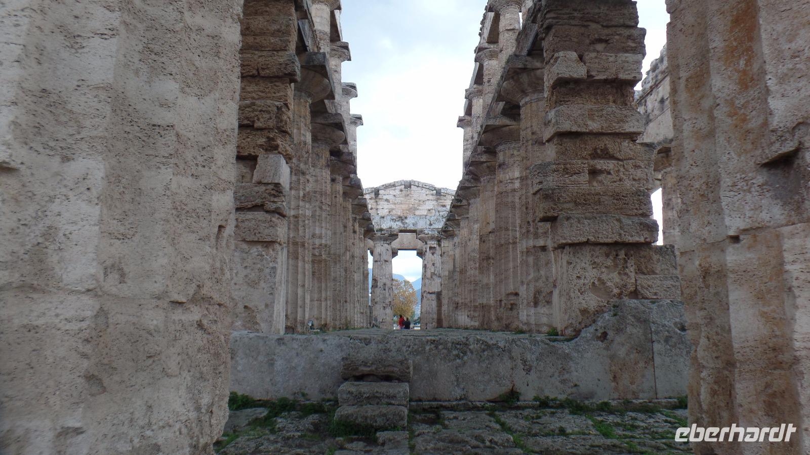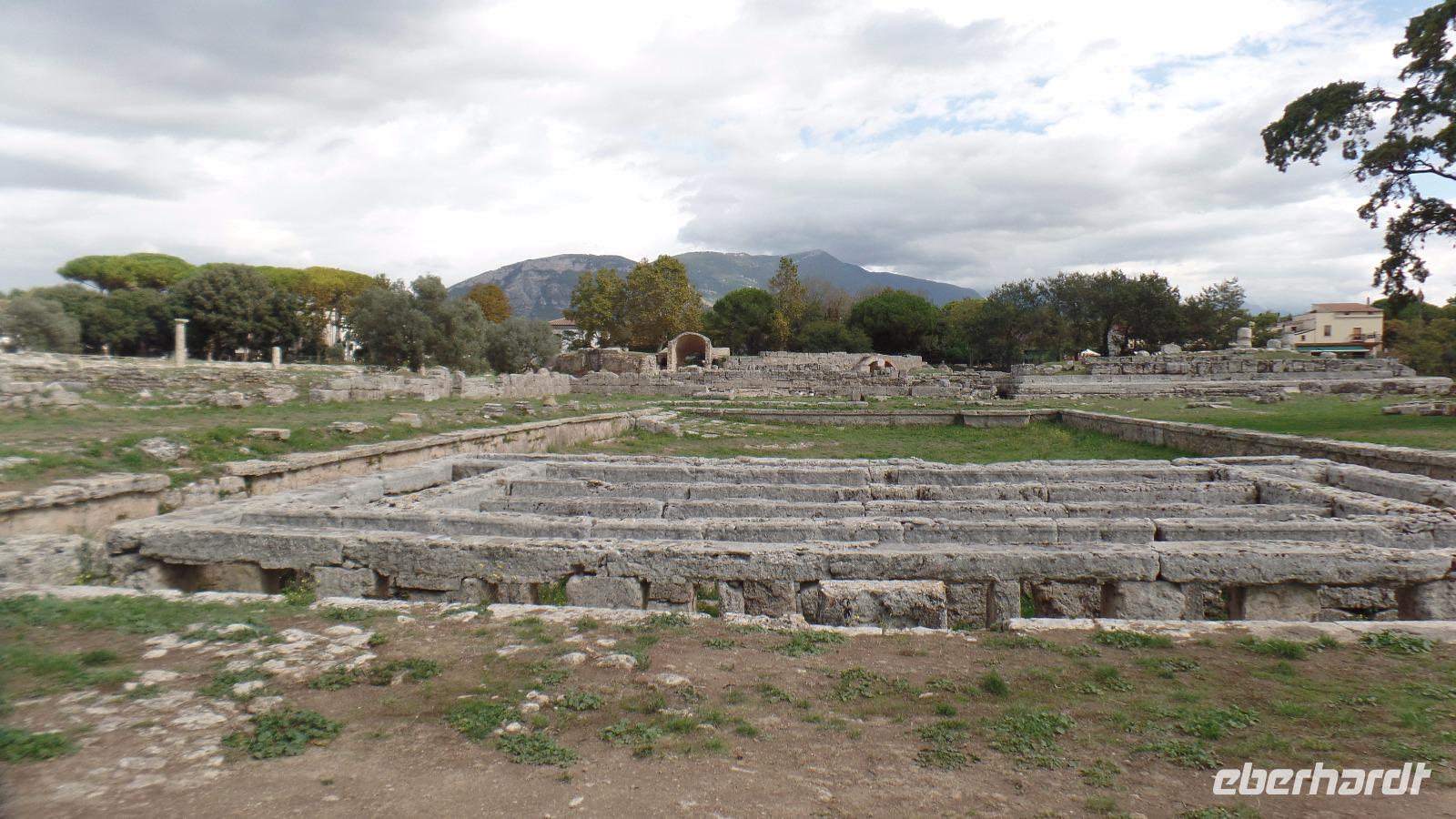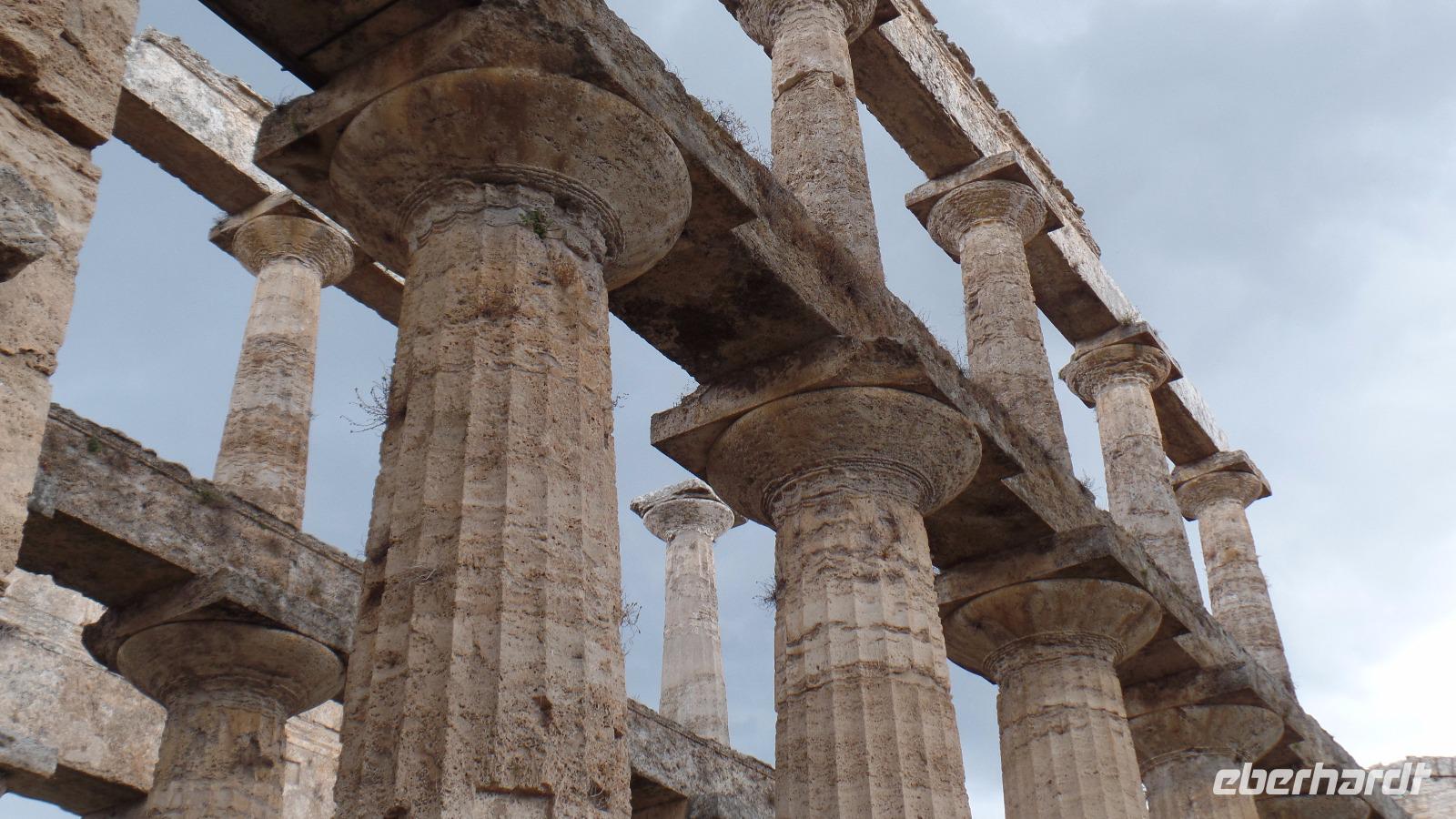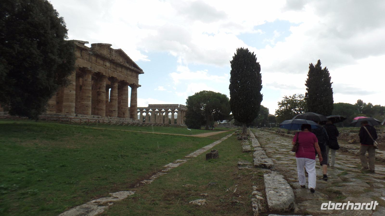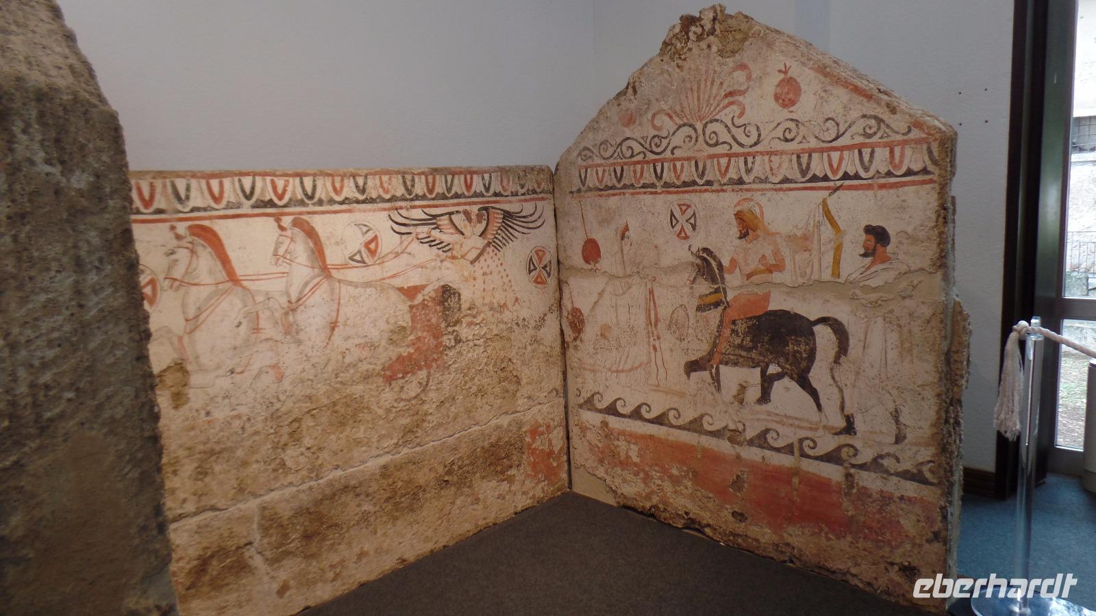 Anschließend besuchen wir die Weltkulturerbestätte Paestum, die Ruinen von drei großen dorischen Tempeln. Angelo führte uns zuerst ins Museum, das eine bedeutende Sammlung griechischer Altertümer zeigt. Beeindruckend sind die bemalten Steinplatten, die als Sargdeckel oder -seitenwände dienten.