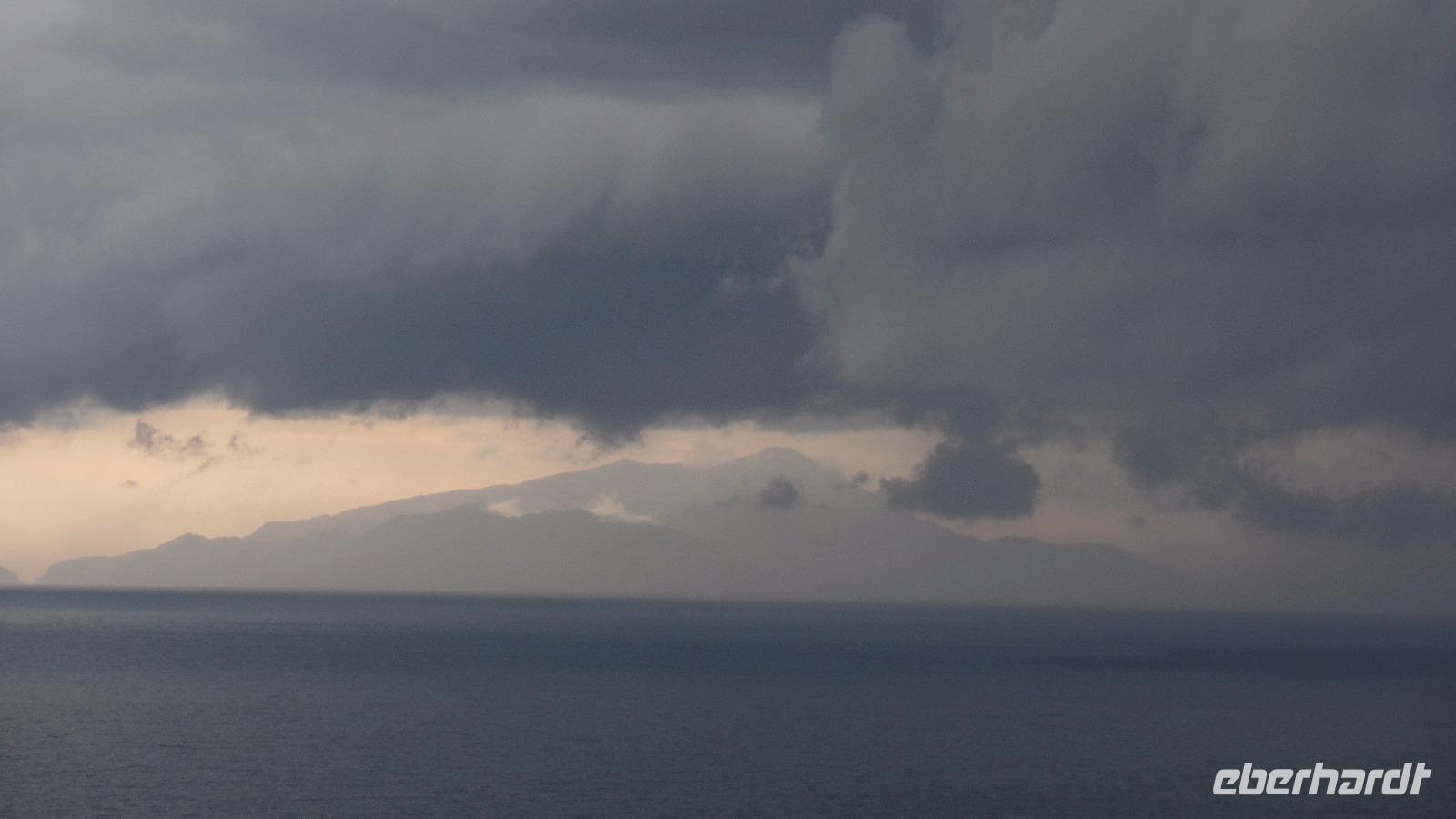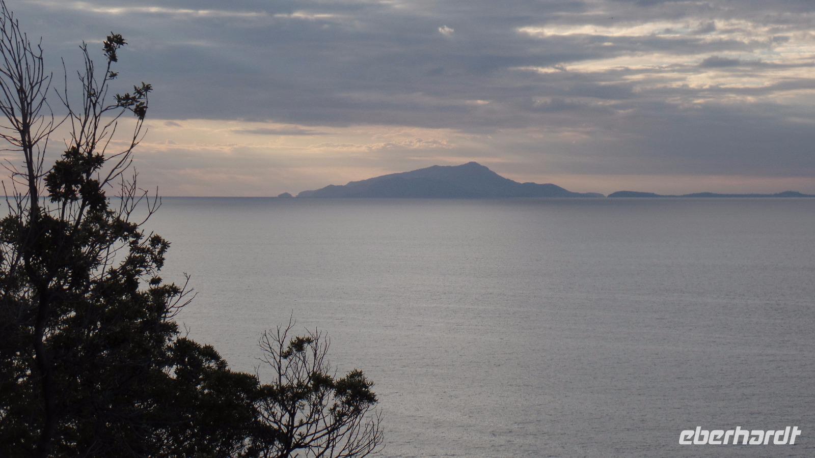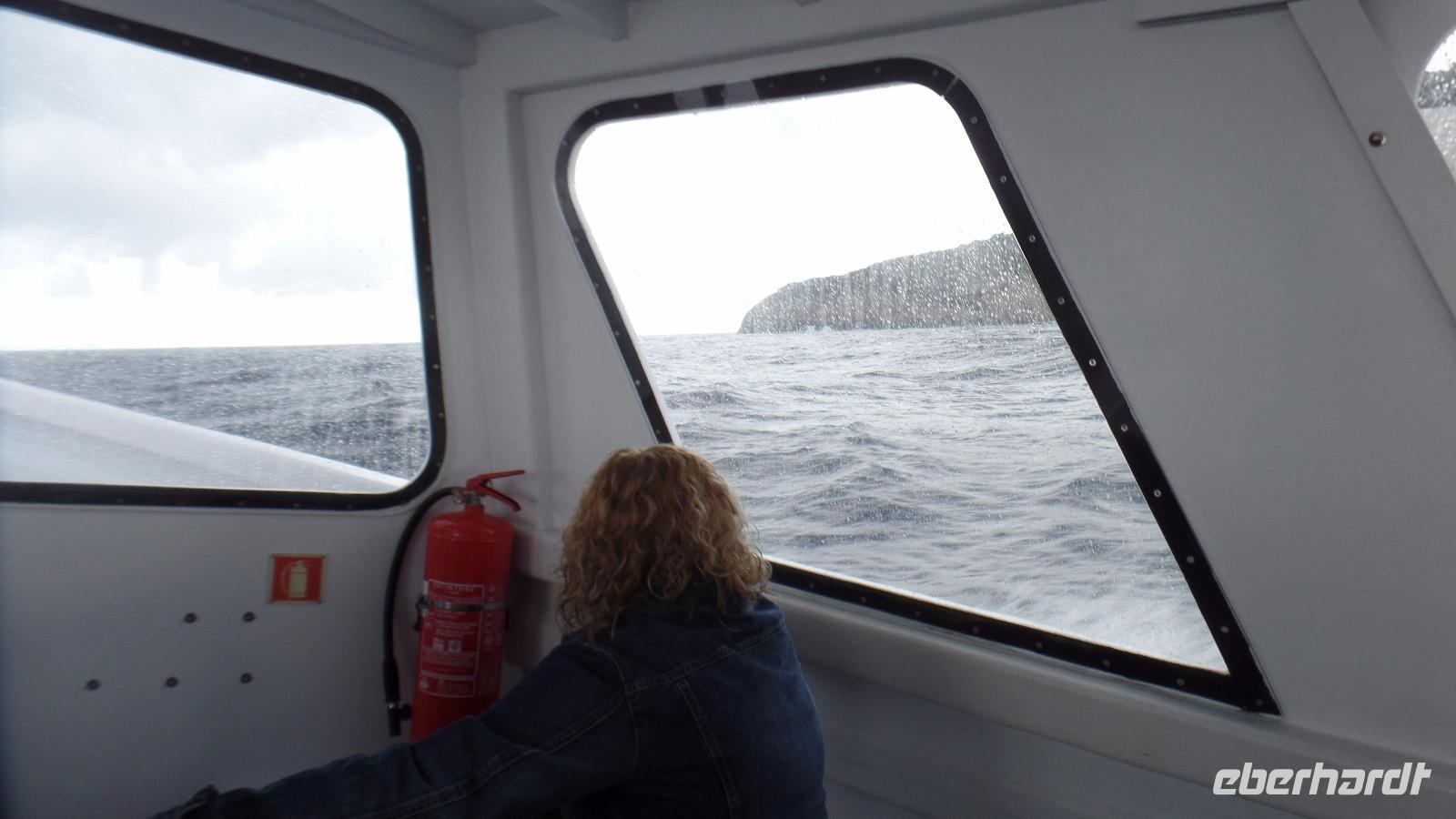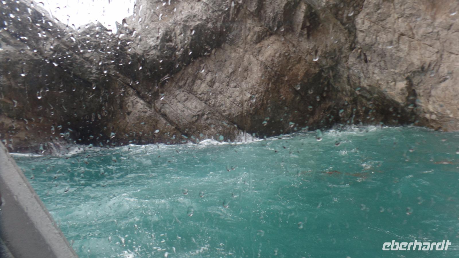 Wir umfahren die Insel und bereuen es nicht. Wir sitzen ja im Trockenen (fast!). Vom Meer aus kann man erst so richtig die Schönheit der Insel entdecken, die Kalksteinfelsen, die Grotten mit ihren orangefarbenen Korallen (es sind wohl eher Schwämme). Wir bewunderten trotzdem die verschiedenfarbigen Blautöne des Meeres, auch wenn die Sonne nicht scheint.