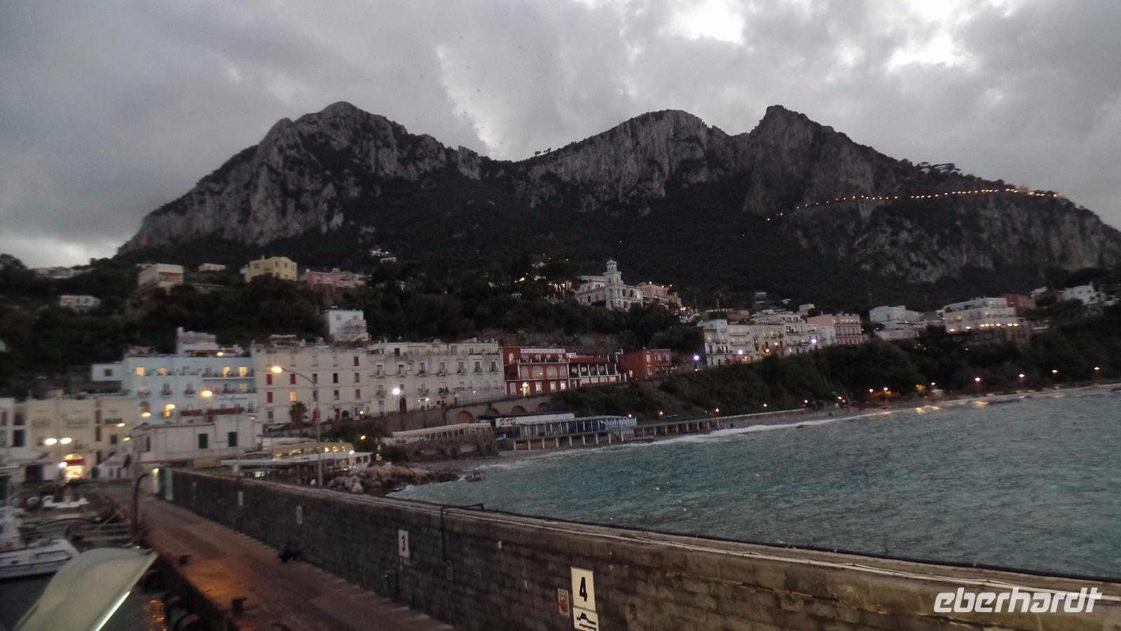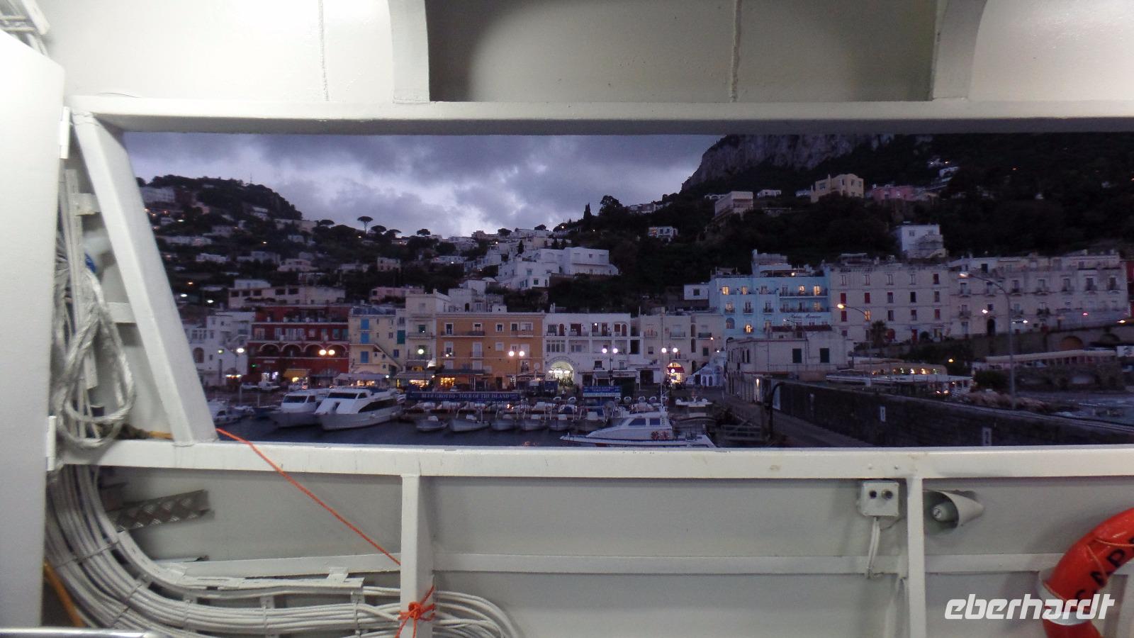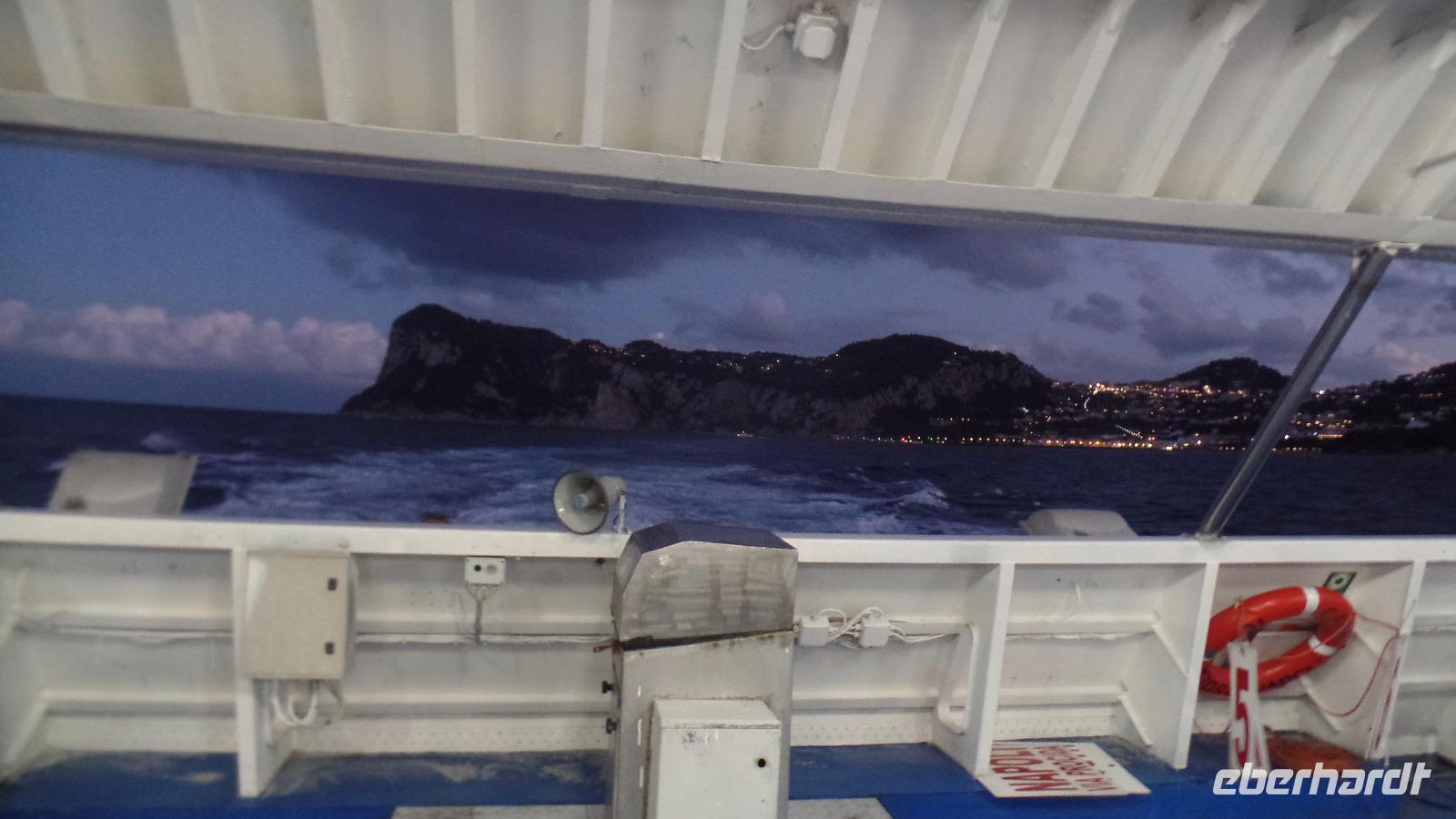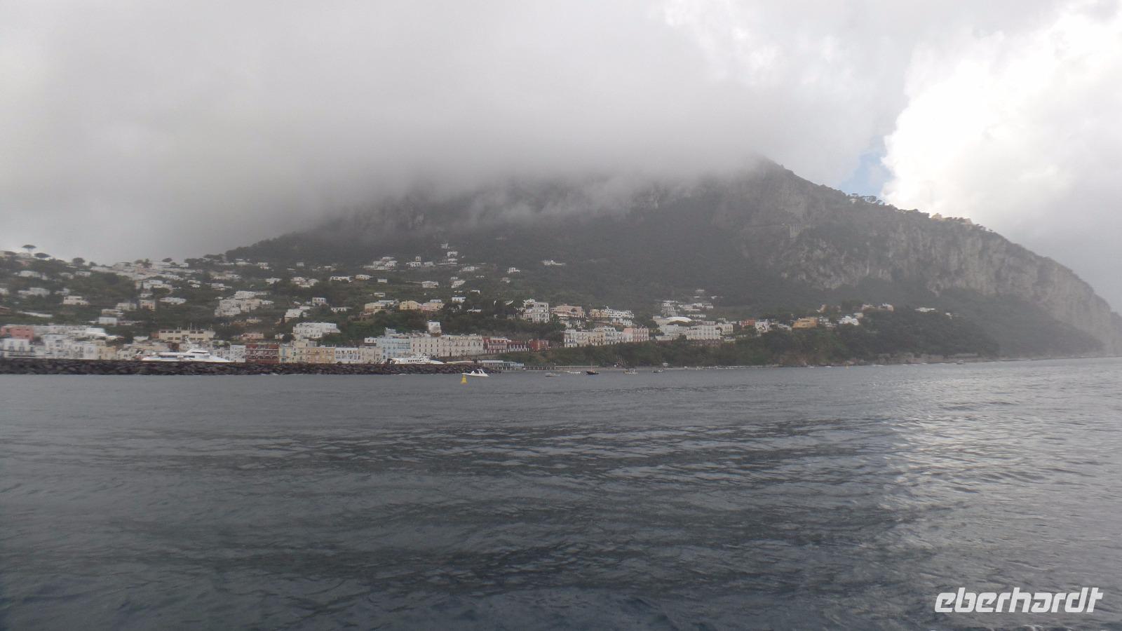 Fast alle Gäste nehmen daran teil. Karl-Heinz bringt uns nach Sorrent. Zuerst ein Fotostopp über Meta mit Blick auf den Golf von Sorrent. Es sind nur wenige Kilometer, aber wir brauchen eine Stunde und müssen uns beeilen, das Schiff zu bekommen. Andreana erwartet uns im Hafen und mit der Fähre fahren wir nach Capri. Einige Gäste haben die Überfahrt bei Wellengang nicht so gut überstanden und verzichten auf die geplante Rundfahrt um die Insel. Es regnet auch noch stark. Schade! Aber acht Mutige wagen es trotzdem. Wenn man schon mal auf Capri ist!
