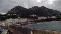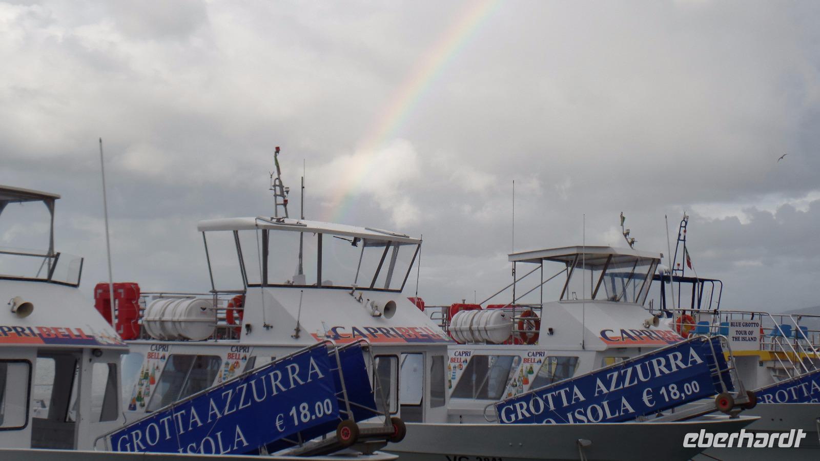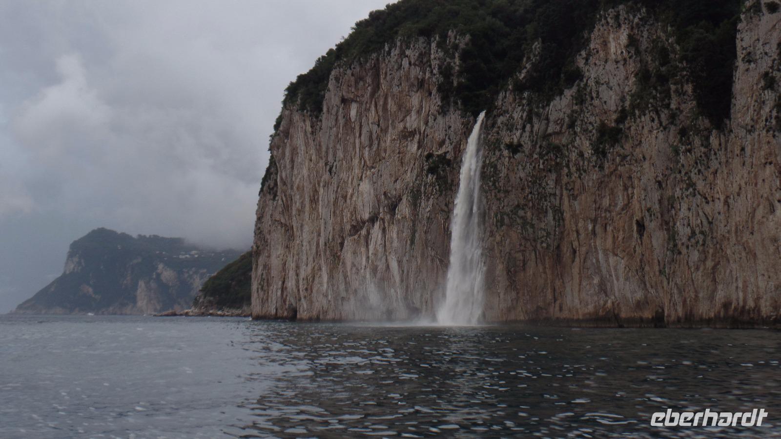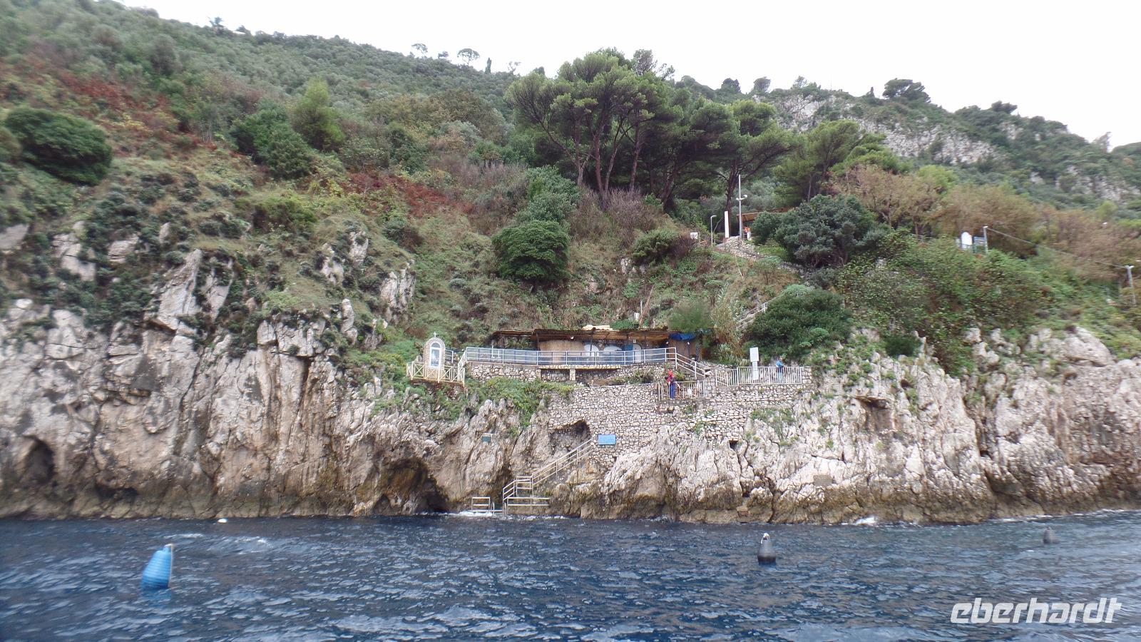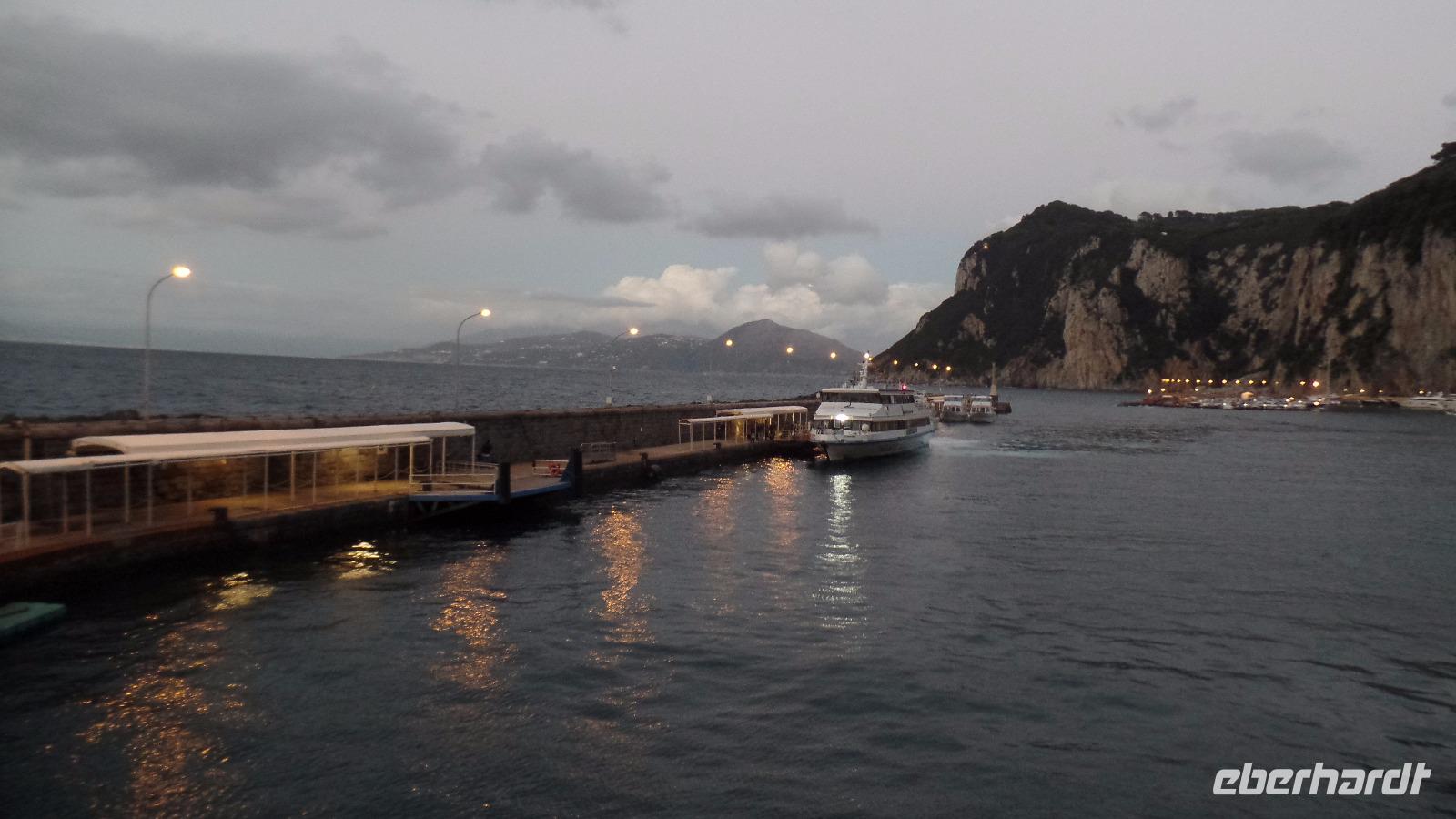 Fast alle Gäste nehmen daran teil. Karl-Heinz bringt uns nach Sorrent. Zuerst ein Fotostopp über Meta mit Blick auf den Golf von Sorrent. Es sind nur wenige Kilometer, aber wir brauchen eine Stunde und müssen uns beeilen, das Schiff zu bekommen. Andreana erwartet uns im Hafen und mit der Fähre fahren wir nach Capri. Einige Gäste haben die Überfahrt bei Wellengang nicht so gut überstanden und verzichten auf die geplante Rundfahrt um die Insel. Es regnet auch noch stark. Schade! Aber acht Mutige wagen es trotzdem. Wenn man schon mal auf Capri ist!
