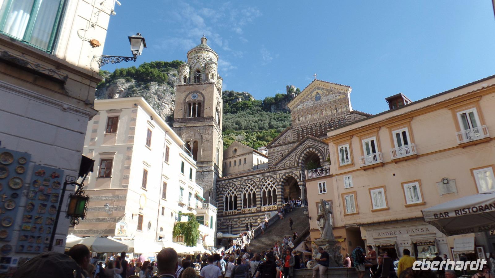 Mit einem italienischen Bus und Reiseleitung Chiara fahren wir an die Amalfiküste. Auf einer engen Straße geht es zwischen Meer und Berg an die Costa Divina, die Göttliche Küste, auf einer der bekanntesten Traumstraßen der Welt. Wir schauen auf die Galli-Inseln und auf das berühmte idyllische Örtchen Positano. In Amalfi können wir den Dom Sant Andrea mit seinem schönen Kreuzgang und den Gebeinen des Heiligen Andreas besichtigen. Oder wir bummeln durch die Gassen und essen in einem kleinen Straßencafe eine Kleinigkeit. Wir unternehmen eine Bootstour entlang der Küste von Amalfi bis Maiori. Vom Meer aus können wir die Steilküste erst so richtig bewundern. Die Höhlen, die Vegetation, architektonische Kostbarkeiten, Villen berühmter Leute, das bekannte Ravello, alles zeigt uns Chiara.