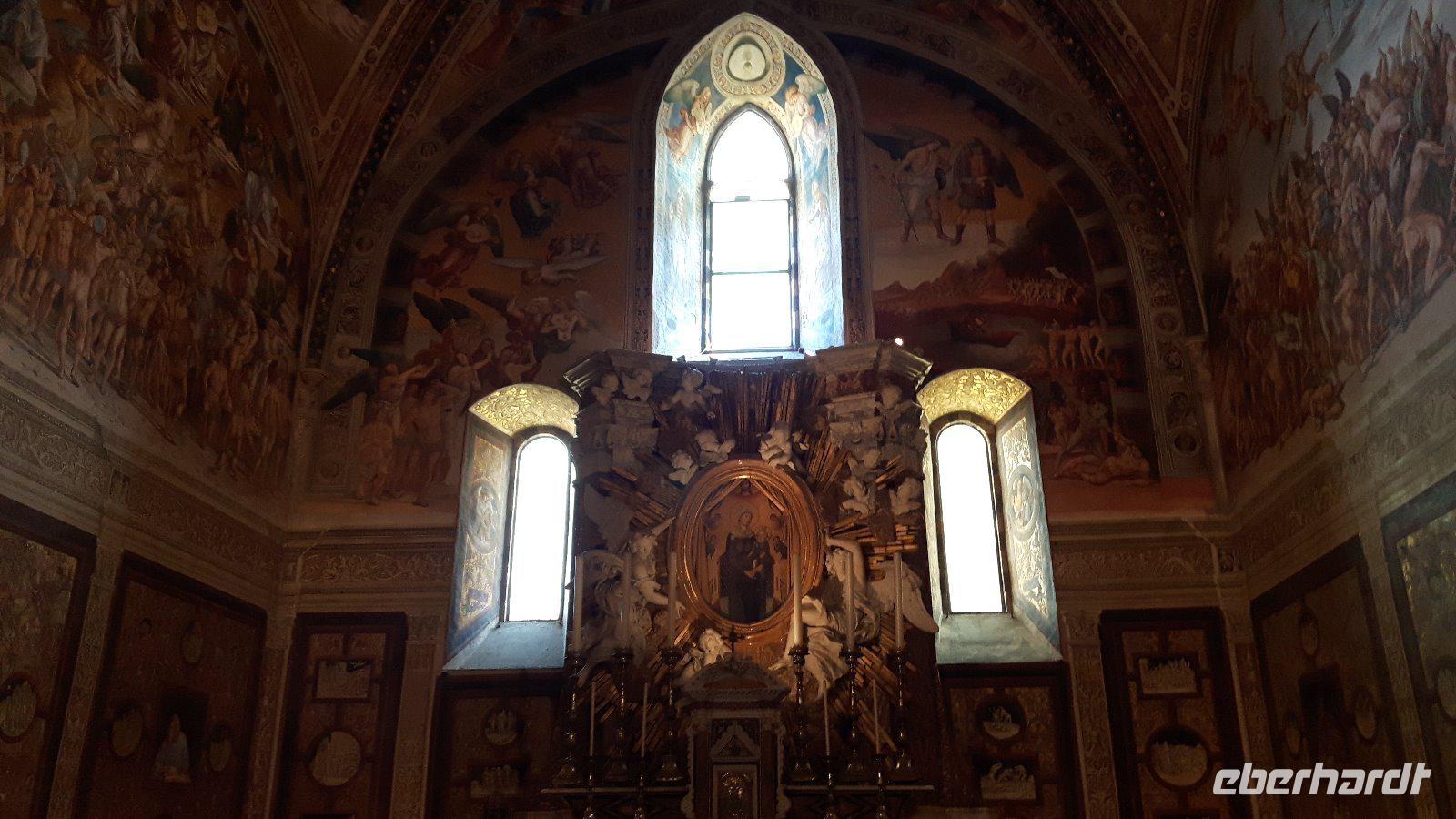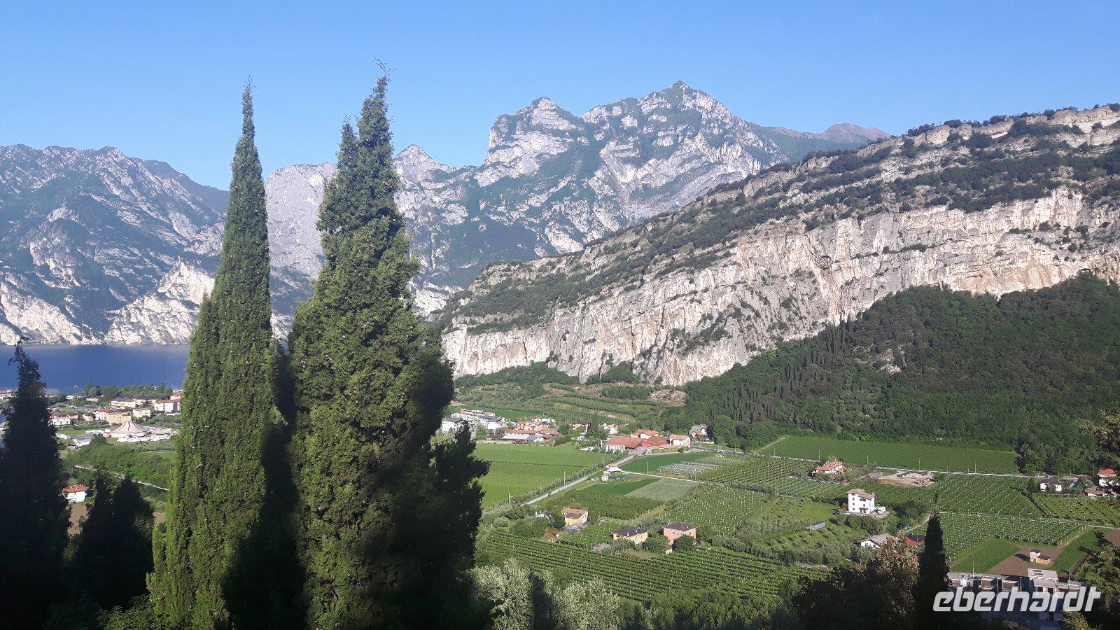 Nachdem unsere Reisegruppe mit 15 Gästen vorerst komplett war, führte uns die Fahrt vorbei an Nürnberg und München. So erreichten wir auf schnellstem Wege das Inntal und passierten bereits am frühen Nachmittag die Innbrücke zwischen Kiefersfelden und Kufstein und damit auch die deutsch-österreichische Grenze. Durch das breite Inntal und vorbei an Innsbruck fuhren wir nunmehr hinauf zum Brennerpass, den niedrigsten Übergang über die Hauptkette der Alpen und seit dem Frieden von St. Germain im Jahr 1919 Grenze zwischen Österreich und Italien. Weiter ging es durch das Eisacktal, vorbei an unzähligen Burgen bis Bozen. Staubedingt konnten wir kurz vor Bozen sogar noch eine landschaftlich durchaus reizvolle Strecke über die alte Brennerstraße genießen. Weiter in Richtung Süden und durch das Etschtal, teilweise auch parallel zur Südtiroler Weinstraße kamen wir zur sogenannten „Salurner Klause" - dies ist eine Engstelle des Etschtales und gleichzeitig die Grenze zwischen den Provinzen Südtirol und dem Trentino bzw. eine Sprachgrenze. Nun fuhren wir noch an Trient vorbei und letztendlich verließen wir bei Rovereto die Brennerautobahn, wir wollten ja erst einmal zum Gardasee zur Zwischenübernachtung! Gegen 19 Uhr kamen wir in unserem familiengeführten Hotel „Alberello" in der Nähe von Riva del Garda an. Zum Abendessen ließen wir uns ein 3-Gänge-Menü schmecken! Dazu ein gutes Glas Hauswein und die nötige Bettschwere war da.