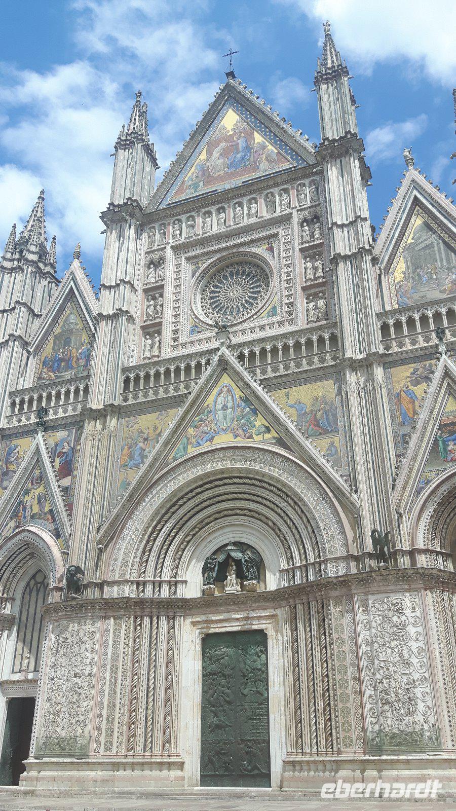 Nach einem für italienische Verhältnisse „reichhaltigen Frühstücksbuffet" mit Wurst und Käse - Italiener können übrigens überhaupt nicht verstehen, warum wir so viel frühstücken können- fuhren wir weiter in Richtung Verona, durch die weitläufige Po-Ebene mitsamt Überquerung des gleichnamigen und länsten Flusses Italiens. Später erreichten wir Modena und dem Südrand der Po-Ebene entlang bis Bologna. Das Landschaftsbild änderte sich vollständig, als wir den tosco-emilianisch-romagnolischen Apennin erreichten. Hier gibt es glücklicherweise seit einigen Monaten eine nagelneue Autobahn, die eine erhebliche Fahrtzeitverkürzung gegenüber der alten Strecke mit sich bringt. Die Autobahn führt nunmehr fast geradlinig durch mehrere kilometerlange Tunnel und durchschneidet damit das Gebirge. Etwa 40 Kilometer nördlich von Florenz erreichten wir die berühmte mittelitalienische Region der Toskana! Florenz ließen wir leider nur linkerhand liegen, aber von weitem konnten wir zumindest die Kuppel des Domes ausmachen. Hinter Florenz erfüllte diese Region alle Klischees, es wurde eine abwechslungsreiche Reise durch die sanft gewellte Hügellandschaft der Toskana! Später und weiter im Süden fuhren wir dann in die Region Umbrien, eine der wenigen Binnenregionen des Landes, hinein. Unser Ziel war Orvieto, einzigartig auf einem 300 Meter hohen vulkanischen Tuff-Felsen gelegen - schon der Blick von der Autobahn aus war grandios ! Mit einer Funicolare fuhren wir dann gemeinsam mit unserer charmanten Stadtführerin Chiara in die Altstadt von Orvieto hinauf. Die alte Etruskerstadt beeindruckt mit seinen herrlichen Baudenkmälern und gehört mit Sicherheit zu den interessantesten Städten Mittelitaliens. Wir besuchten den Dom, das unbestrittene Wahrzeichen des Ortes - mit seinem Bau wurde Ende des 13. Jahrhunderts begonnen und ist noch heute ein Meisterwerk der italienischen Gotik. Ein Spaziergang durch die engen Gassen der Altstadt rundete diesen Aufenthalt ab. Mit schönen ersten Erlebnissen erreichten wir am Abend die Hauptstadt Italiens - Rom! Gegen 18.30 Uhr kamen wir im südlich vom Stadtzentrum gelegenen Hotel „Oly", unserem Quartier für die nächsten drei Nächte, an. Hier begrüßten wir auch weitere 16 Fluggäste und somit war unsere Gruppe mit nunmehr insgesamt 31 Personen komplett. Unser erstes Abendessen in Rom nahmen wir heute alle gemeinsam im Hotel ein.