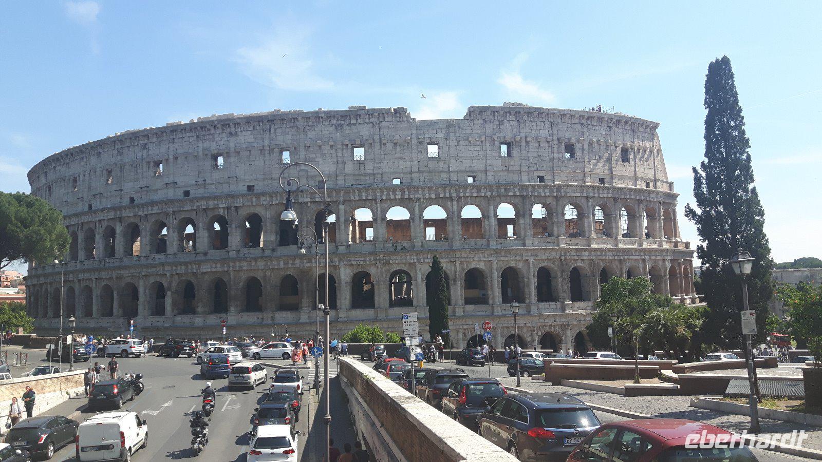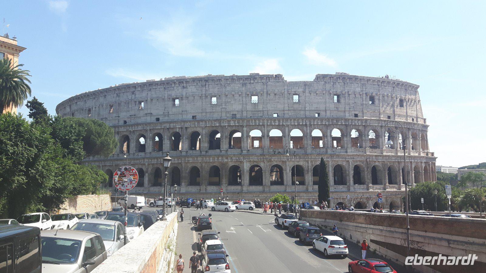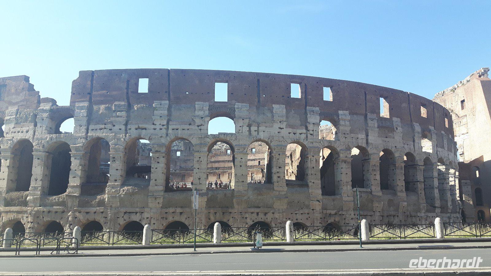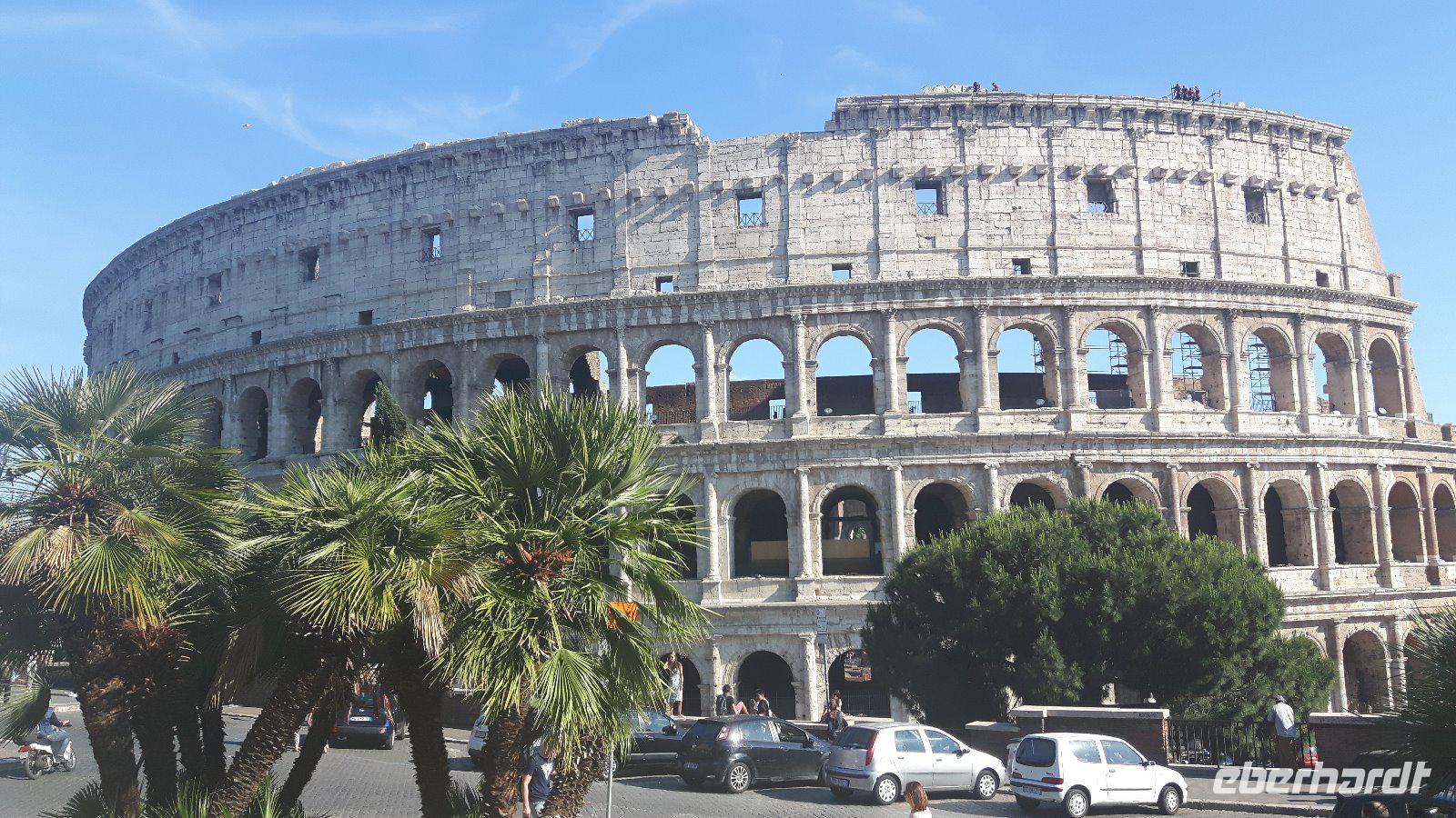 Das Frühstück im Hotel war zwar nicht ganz so reichhaltig wie zu Hause, aber das wusstendie meisten von uns bereits vorher... Trotzdem fuhren wir gut gelaunt mit unserem eigenen Reisebus in die Innenstadt. Wir wurden für die nächsten Tage mit Audio-Geräten ausgestattet, damit wir die Führungen hautnah und intensiv erleben konnten. Unsere nette Stadtführerin Sylvia erwartete uns bereits in der Nähe des Ostiense-Bahnhofs, wo dann auch sofort die umfangreiche Entdeckungstour durch Rom begann! Wir kamen unter anderem vorbei an berühmten Plätzen und Straßen der Stadt wie der Piazza Venezia mit dem Nationaldenkmal, der Via Nazionale und der eleganten Via Veneto. Ein kurzer Spaziergang führte uns auf den Kapitolshügel, einen der sieben historischen Hügel, hinauf und von dort aus hatten wir eine wahrhaft gigantische Perspektive auf das Forum Romanum. Von diesem Mittelpunkt der Antike wurde übrigens nicht nur Rom, sondern das ganze Römische Reich regiert. So langsam bekamen wir Hunger und unser Bus brachte uns daher in die Nähe der Kirche Santa Maria Maggiore, wo wir erst einmal eine Mittagspause einlegten. Wir nutzten die Zeit, um eine Pizza bzw. etwas Pasta in einer der zahlreichen Restaurants zu essen oder ganz einfach ein leckeres italienisches Eis zu schleckern! Gut gestärkt trafen wir uns wieder und besichtigten anschließend gemeinsam die Kirche Santa Maria Maggiore, eine der vier Patriarchalbasiliken Roms. Eine letzte kurze Fahrt mit unserem Bus führte uns anschließend zum Oppio-Hügel, wo wir - zusätzlich zum eigentlichen Programm - der Kirche San Pietro in Vincoli (St. Peter in Ketten) einen Besuch abstatteten. Diese beherbergt nämlich einewahren Schatz und große Berühmtheit - das Grabmal Julius II., welches von Michelangelo geschaffen wurde. Im Grabmal sind die Statuen von Rachel, Lea und Mose zu sehen. Vor allem die Moses-Statue gilt als wichtiges Werk Michelangelos. Nun war es aber genug mit Kirchen für heute - ein letzter Höhepunkt des heutigen Besichtigungsprogramms auf dem Programm - das Kolosseum! Kaiser Vespasian begann den Bau 72 n. Chr., sein Sohn Titus weihte die Arena nach nur achtjähriger Bauzeit mit hunderttägigen Festspielen ein. Unzählige Tiere und Gladiatoren wurden geopfert. Sehr lebendig sind allerdings noch die Legionäre, mit denen man hier gegen ein Entgelt für ein Foto posieren kann. Hier hatten wir zum Glück auch noch etwas Freizeit, um uns in den zahlreichen Straßencafés einen leckeren Cappuccino schmecken zu lassen - einfach himmlisch...! Die Gäste, die noch etwas Kapazität übrig hatten, konnten natürlich das Kolosseum oder auch das Forum Romanum individuell besichtigen. Nach einem musikalisch umrahmten und sehr schmackhaften Abendessen in der Nähe des Kolosseums kehrten wir gemeinsam mit unserem Reisebus zum Hotel zurück. Jetzt endete ein zwar teilweise recht anstrengender, aber auch sehr eindrucksvoller Tag!