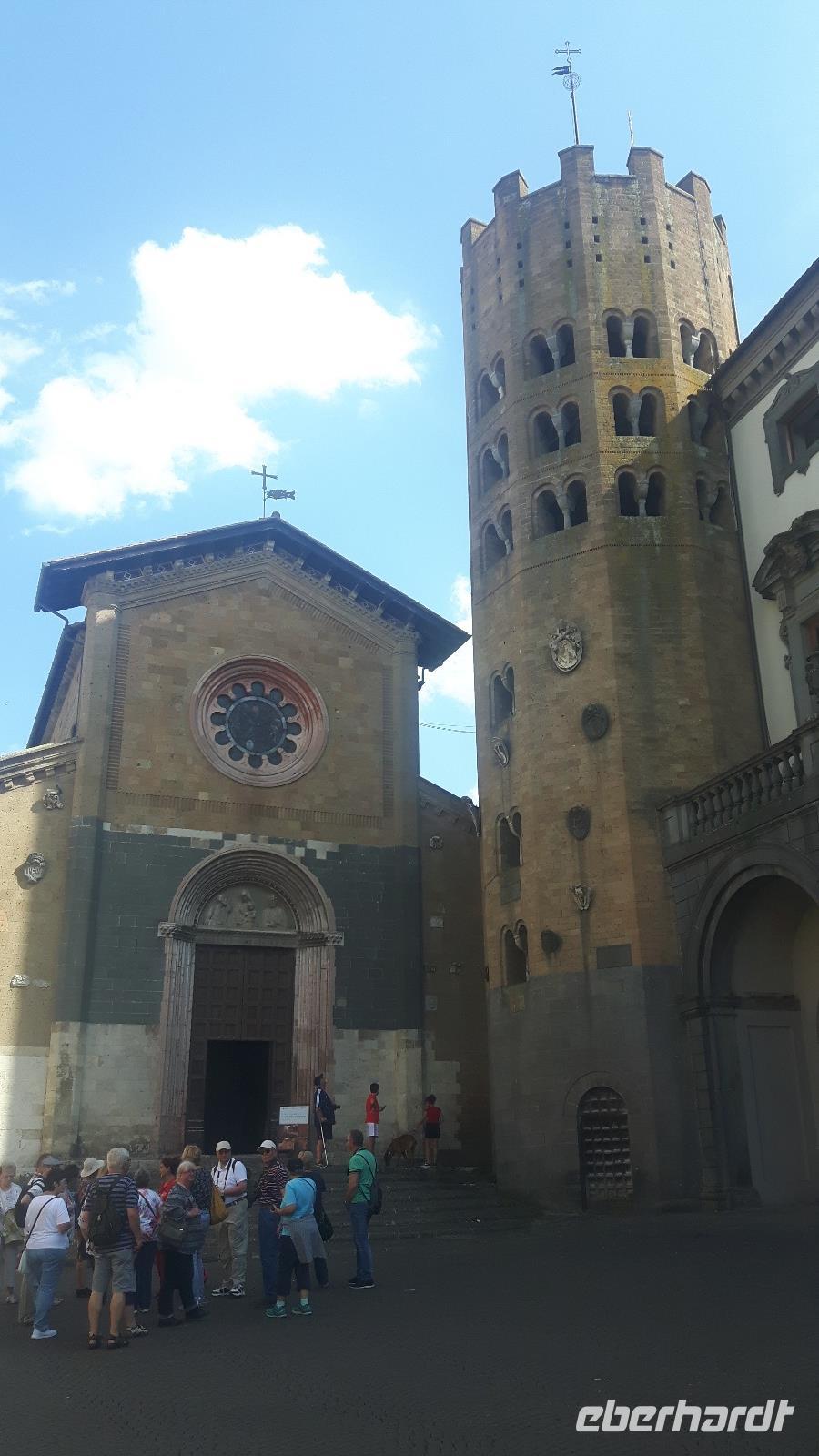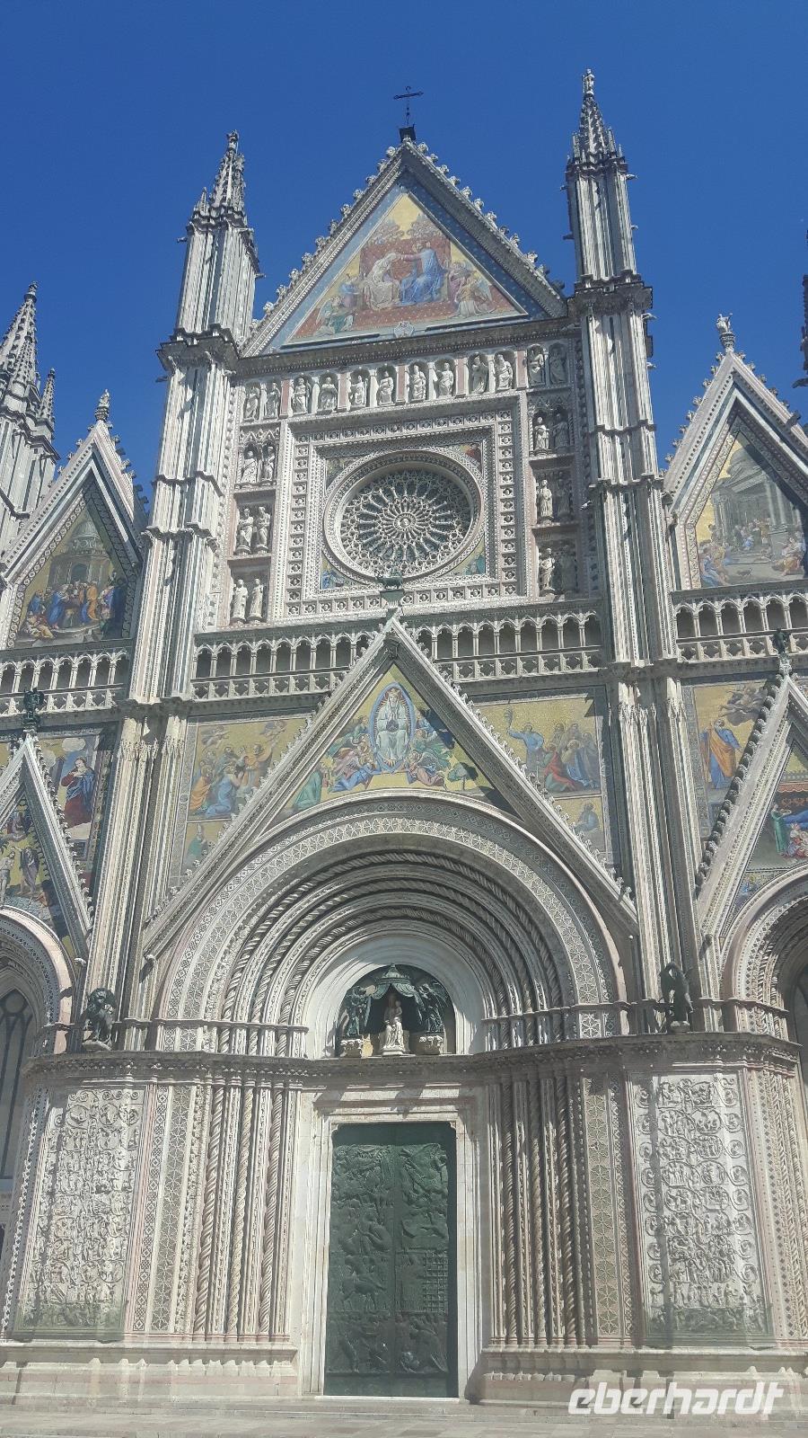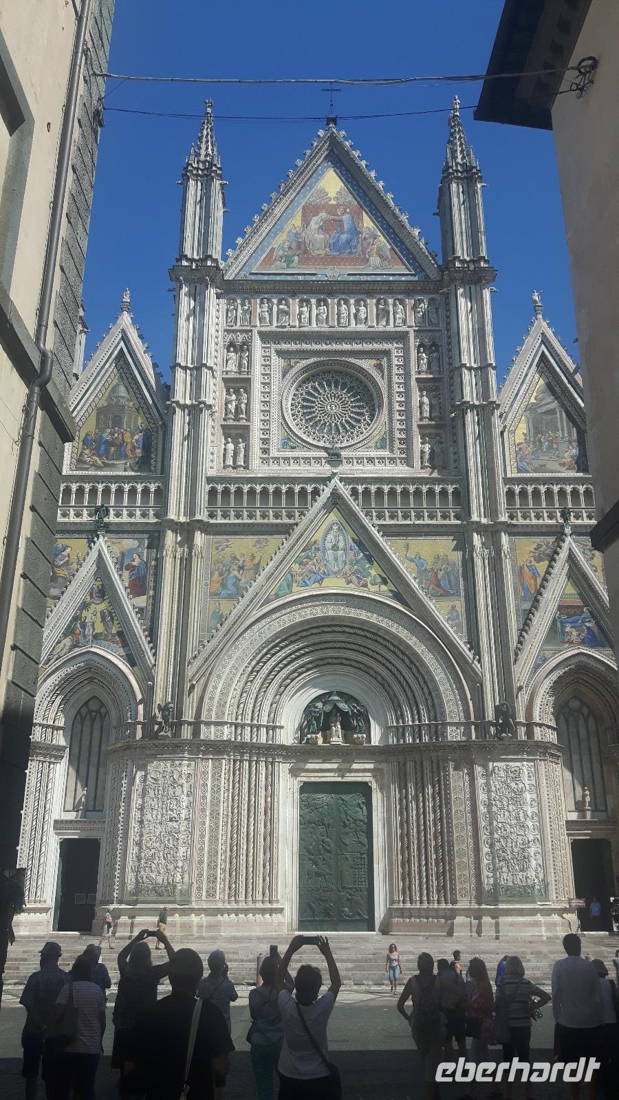 Wir frühstückten reichhaltig - was zumindest italienische Verhältnisse angeht! Einem Italiener ist nämlich immer wieder völlig unklar, wie wir Deutschen bereits am Morgen so viel essen können... Gut gestärkt starteten wir also am frühen Morgen, es ging zunächst hinein in die weitläufige Po-Ebene, an Verona und Mantua vorbei. Südlich von Mantua überquerten wir übrigens den Po, den längsten Strom Italiens. Wenig später erreichten wir Modena, wo dann übrigens nach insgesamt 333 Kilometern auch die Brennerautobahn endete und wir auf die Autostrada del Sole trafen! Die Route führte uns nunmehr am Südrand der Po-Ebene entlang bis Bologna und dann bereits hinein in den tosco-emilianisch-romagnolischen Apennin. Der Scheitelpunkt der Autobahn lag ehemals auf über 700 Metern, allerdings gibt es nunmehr seit fast drei Jahren eine neue Autobahn, die durch zahlreiche Tunnel geprägt ist und somit regelrecht durch diesen Gebirgszug hindurch führt. Dadurch erspart man sich sehr viel Zeit und Nerven und ist einfach schneller unterwegs, so dass wir früher als gedacht in der Toskana ankamen! Florenz, die Hauptstadt dieser Region, ließen wir heute leider nur links liegen, aber zumindest konnten wir von der Autobahn aus die Kuppel des Domes erspähen. Wir genossen die weitere Fahrt durch die typische sanft gewellte Hügellandschaft der Toskana - zumindest jetzt wurden alle Klischees erfüllt, die wir über die Toskana gehört oder auf Bildern gesehen hatten. Bald schon ging es in die Region Umbrien hinein, dem sogenannten „grüne Herz Italiens". Unser erstes Ziel war nunmehr zum Greifen nah, denn Orvieto konnten wir bereits von der Autobahn aus sehen... Der Ort liegt einzigartig auf einem 300 Meter hohen vulkanischen Tuff-Felsen und wir waren demnach sehr gespannt, was uns hier erwarten würde. Gegen Mittag waren wir mit unserer charmanten Stadtführerin Chiara verabredet und fuhren schließlich gemeinsam mit ihr mit einer Funicolare/Standseilbahn in die Altstadt von Orvieto hinauf. Die Stadt hatte besonders unter den Etruskern eine sehr große Bedeutung und heute gehört sie mit seinen imposanten Baudenkmälern zu den interessantesten Städten Mittelitaliens. Besonderes Augenmerk legten wir auf die Besichtigung des gigantischen Doms, dessen Fassade die kühnste und farbenprächtigste der italienischen Gotik darstellt und auch im Inneren einige Schätze zu bieten hat. Ein Spaziergag durch die Altstadt rundete unseren Besuch in Orvieto ab und mit ersten schönen italienischen Eindrücken begannen wir unsere letzte Fahrt-Etappe des heutigen Tages. Wir hatten schließlich ein Ziel und das hieß Rom! Glücklicherweise ohne Staus erreichten wir gegen 18.30 Uhr das Hotel „Oly", unser Quartier für die nächsten drei Nächte. Hier wurden wir bereits von weiteren 7 Fluggästen erwartet und somit war unsere Reisegruppe mit insgesamt 28 Personen endgültig komplettiert. Unser erstes gemeinsames Abendessen nahmen wir anschließend im hoteleigenen Restaurant ein.
