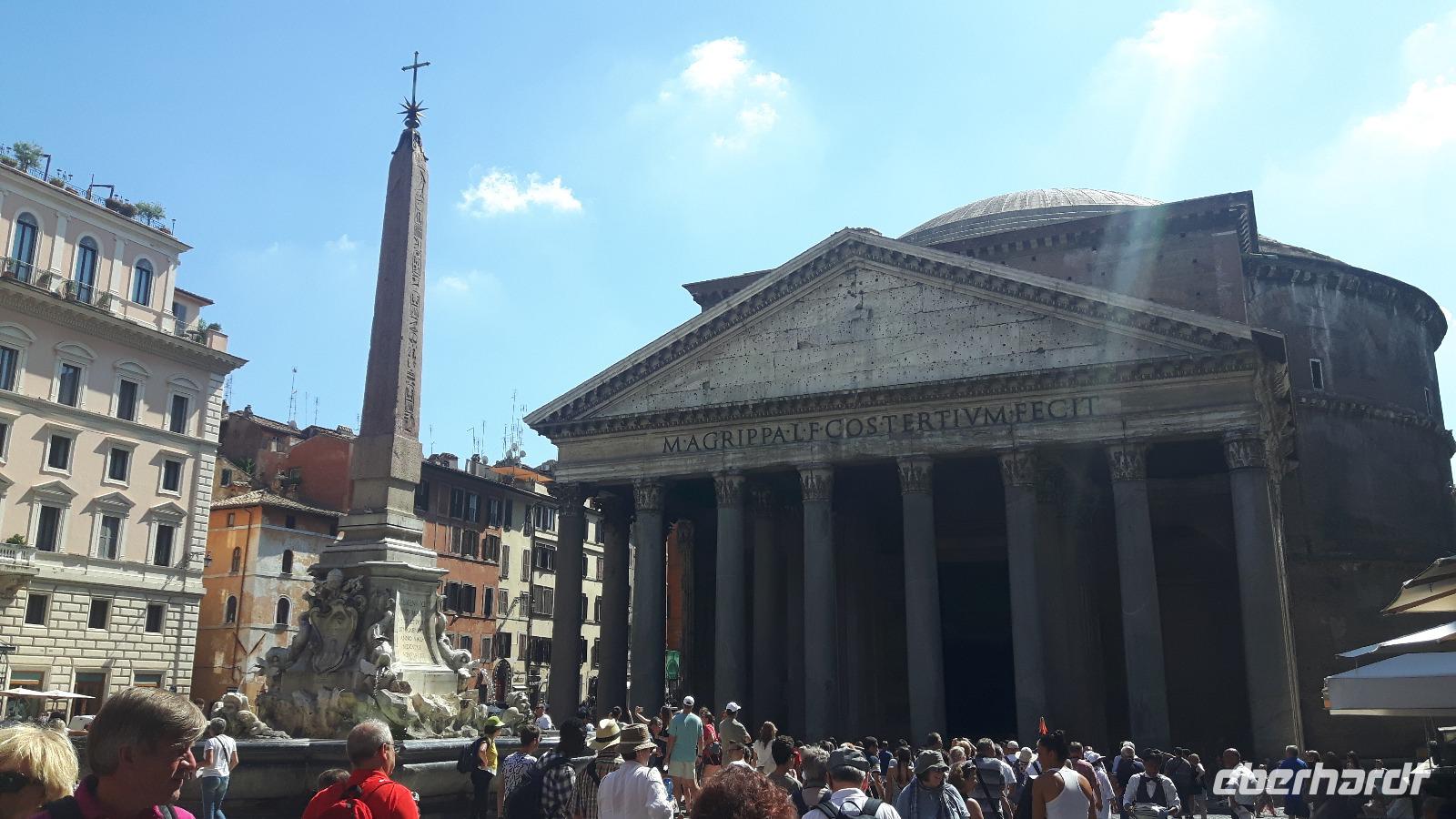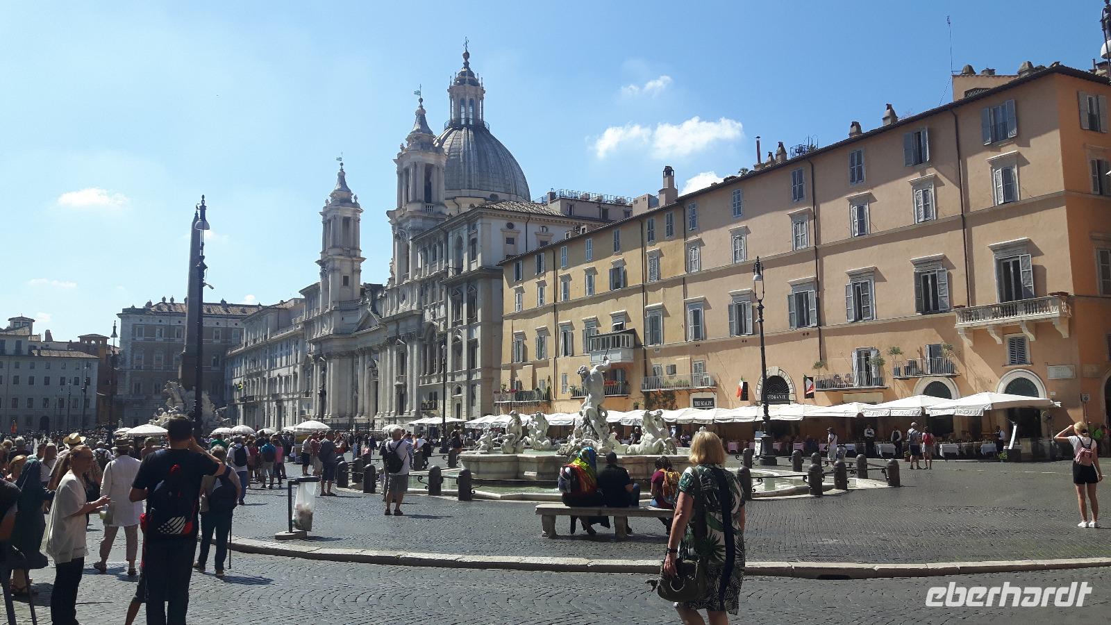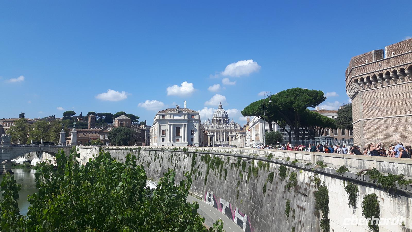 Nach dem Frühstück fuhren wir gemeinsam mit öffentlichen Verkehrsmitteln in die Stadt hinein. Es erwies sich als günstig, die Metro am Wochenende zu nutzen, denn unter der Woche sind diese oftmals gnadenlos überfüllt. Auf jeden Fall verlief die Fahrt mit der Metro erst einmal sehr entspannt und gut gelaunt trafen wir somit in der Nähe des Petersplatzes auf unsere von Anfang an sympathische Stadtführerin Cristina. Die Warteschlange an der Sicherheitskontrolle zum Eingang in den Petersdom war heute glücklicherweise kurz und nach nur etwa 20-minütiger Wartezeit war es bereits volbracht - wir waren im Sicherheitsbereich des Petersdomes angekommen! Cristina gab uns wunderbaren Erklärungen in Verbindung mit dem Vatikanstaat, dem Zentrum der katholischen Christenheit. Wir erspähten später auch die Schweizergarde, also echte Schweizer in Uniformen, welche Michelangelo einst entworfen hat und die bis heute für die päpstliche Wache zuständig sind. Als wir das imposante Bauwerk des Petersdoms schließlich betraten, waren wir einfach nur noch überwältigt! Allein der Baldachin über dem Petrus-Grab ist gigantisch und zudem beherbergt dir Kirche zahlreiche Kunstwerke. Einer der Höhepunkte ist dabei die berühmte „Pietà" von Michelangelo. Sogar die Papst-Gräber unterhalb der Kirche konnten wir heute sehen. Später erblickten wir vom Petersplatz aus auch noch das Arbeitszimmer des Papstes im letzten Stock des Apostolischen Palastes, zweites Fenster von rechts. Anschließend flanierten wir weiter vorbei an der Engelsburg, einem ursprünglichen Grab-Bau für Kaiser Hadrian und über die berühmteste aller Tiber-Brücken, die Engelsbrücke bis zur Piazza Navona. Dieser wunderschöne Platz befindet sich mitten im Herzen der Stadt und hier schuf Bernini im 17. Jahrhundert einen der schönsten Barockbrunnen, den berühmten Vier-Ströme-Brunnen! An diesem tollen Ort verbrachten wir auch unsere wohl verdiente Mittagspause, bevor wir später weiter durch die engen Gassen der Altstadt zum Pantheon, Trevibrunnen und abschließend zur Spanischen Treppe aufbrachen. An der berühmten Spanischen Treppe endete das heutige Besichtigungsprogramm und die anschließende Freizeit nutzten die meisten Gäste schließlich für schöne Spaziergänge in der Umgebung der Spanischen Treppe. Zum Abendessen kehrten wir in ein typisch römisches Lokal in der Nähe der Engelsburg ein, wo wir mit einem leckeren Bruschetta-Mix und tollen Pasta-Gerichten verwöhnt wurden. Zurück zum Hotel ging es am Abend wiederum mit öffentlichen Verkehrsmitteln, diesmal mit Linienbus und Metro.