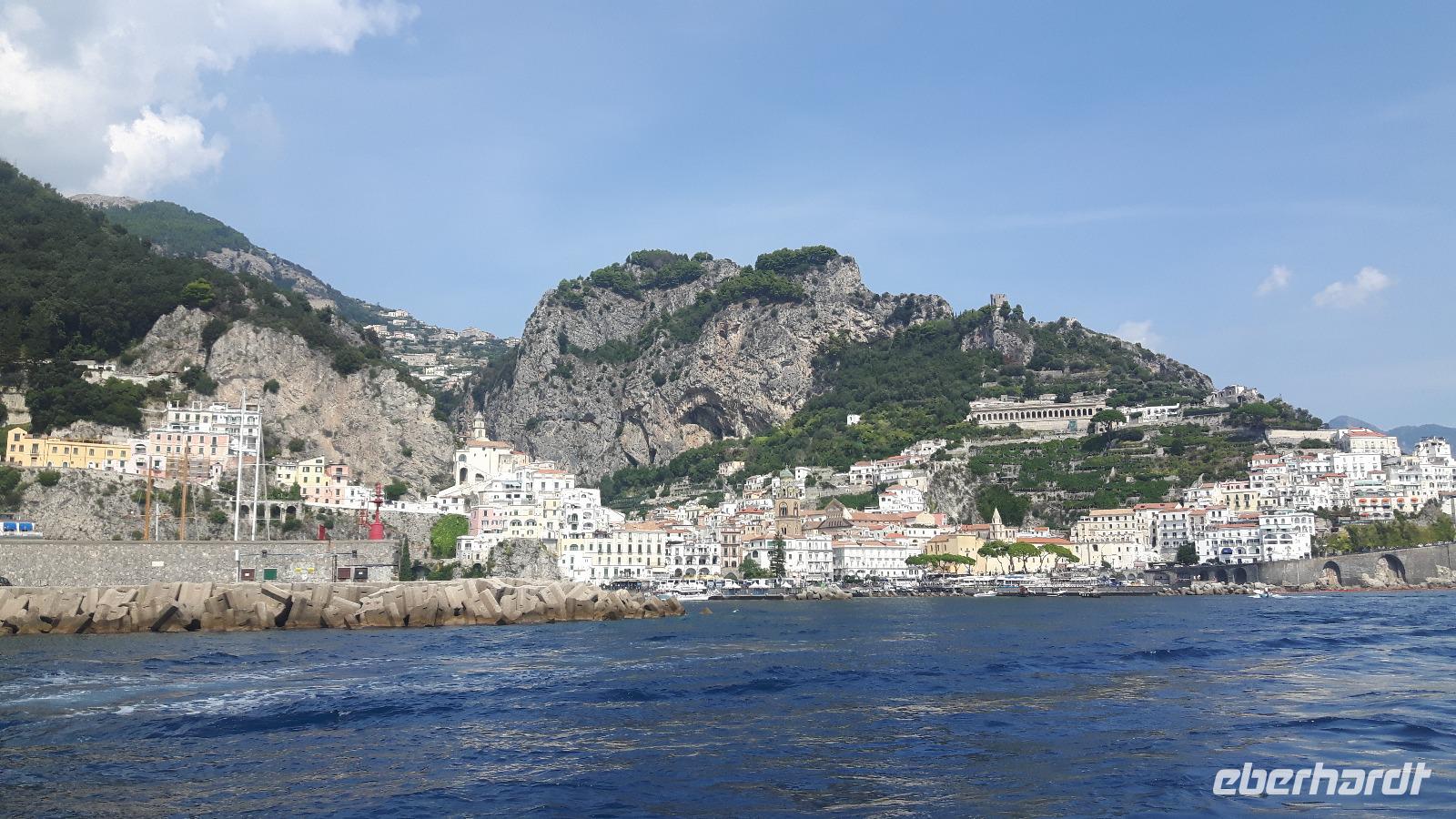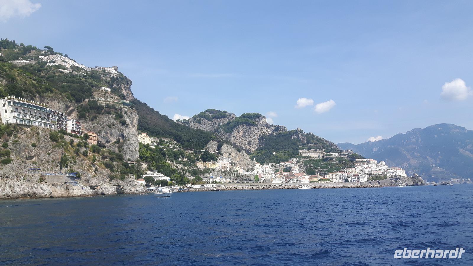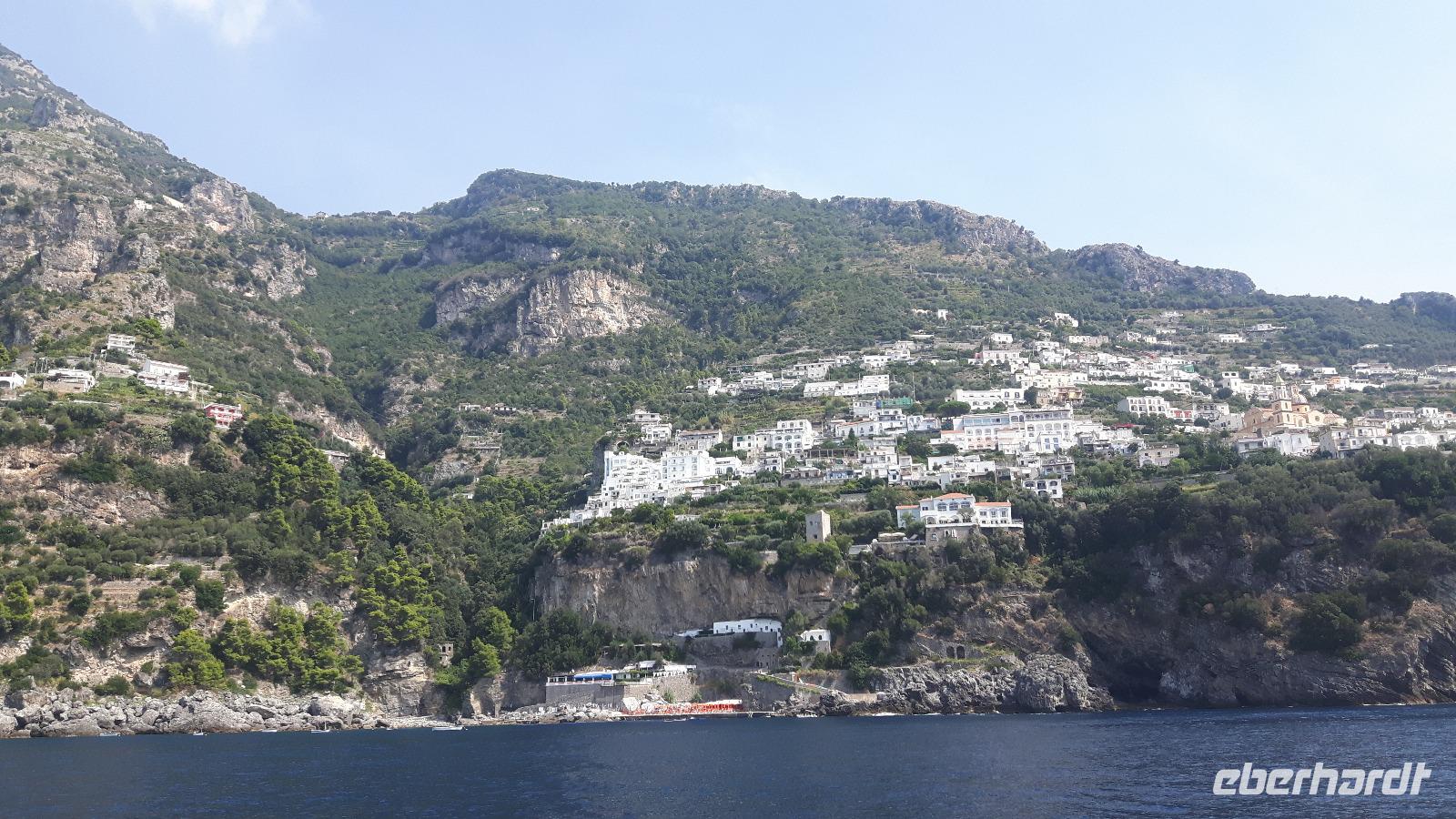 Da unser Bus auf der Amalfiküsten-Straße nicht fahren darf, denn dieser ist mit über 12 Metern Länge nicht zugelassen, fuhren wir heute mit einem einheimischen Bus samt italienischen Buschauffeur und unserer netten Fremdenführerin Claudia auf einer der schönsten Küstenstraßen Italiens. Diese Straße ist streckenweise sogar in die fast senkrecht abbrechende Felsküste eingehauen und mitunter sehr abenteuerlich. Wir legten immer wieder kleine Fotostopps ein, bis wir in Positano den Bus verließen, um mit dem Schiff die weitere Strecke nach Amalfi zurücklegten. Auf diese Weise hatten wir einen besseren Eindruck und sahen auch, wie hoch die Häuser den Berg hinauf steigen. Sowohl in Positano als auch in Amalfi legten wir längere Aufenthalte ein. Amalfi war im Mittelalter immerhin neben Pisa, Genua und Venedig eine der reichen und mächtigen vier Seerepubliken. Die Amalfitaner wurden damals hauptsächlich durch den Fernhandel mit dem Orient, Ägypten, Konstantinopel, Südfrankreich und Norditalien reich und hatten zudem eigene Handelsniederlassungen und eigene Wohnviertel in vielen Städten des Orients und auch in Süditalien bzw. Sizilien. Dann kam die Entdeckung Amerikas und die damit verbundene Verlagerung der Handelswege - Amalfi wurde ein armes, von der Außenwelt abgeschnittenes Nest hinter den Bergen. Einen erneuten Aufschwung gab es dann in der Mitte des 19. Jahrhunderts, als der Tourismus Einzug hielt. Wir hatten übrigens genügend Zeit, um den kleinen Ort ganz individuell zu entdecken und das spezielle Flair zu genießen. Am späten Nachmittag führte uns die Straße weiter über Vietri sul Mare und über die Autobahn nach Agerola zurück.