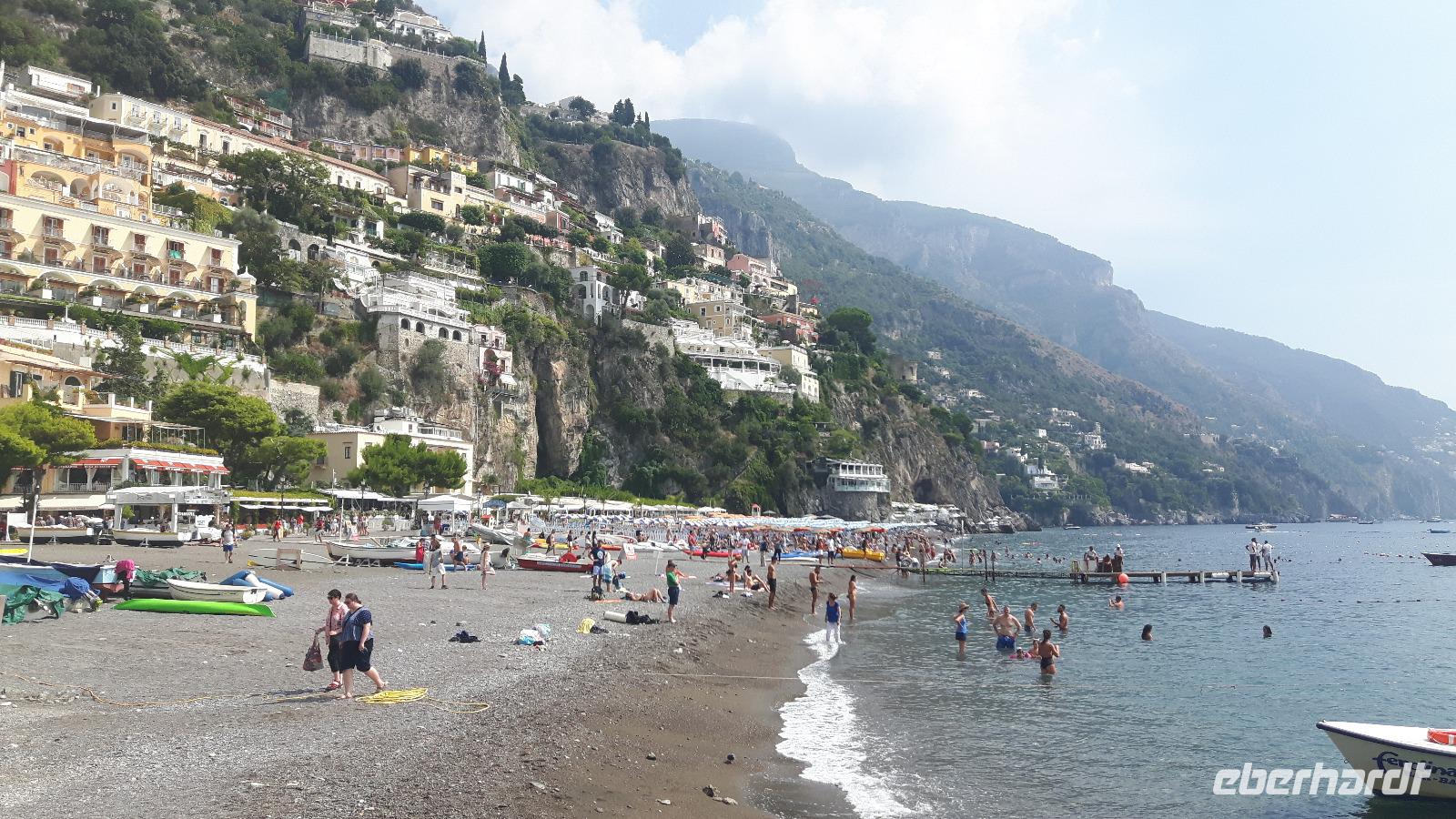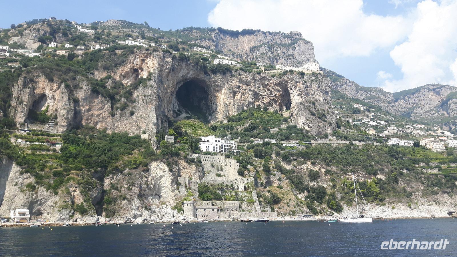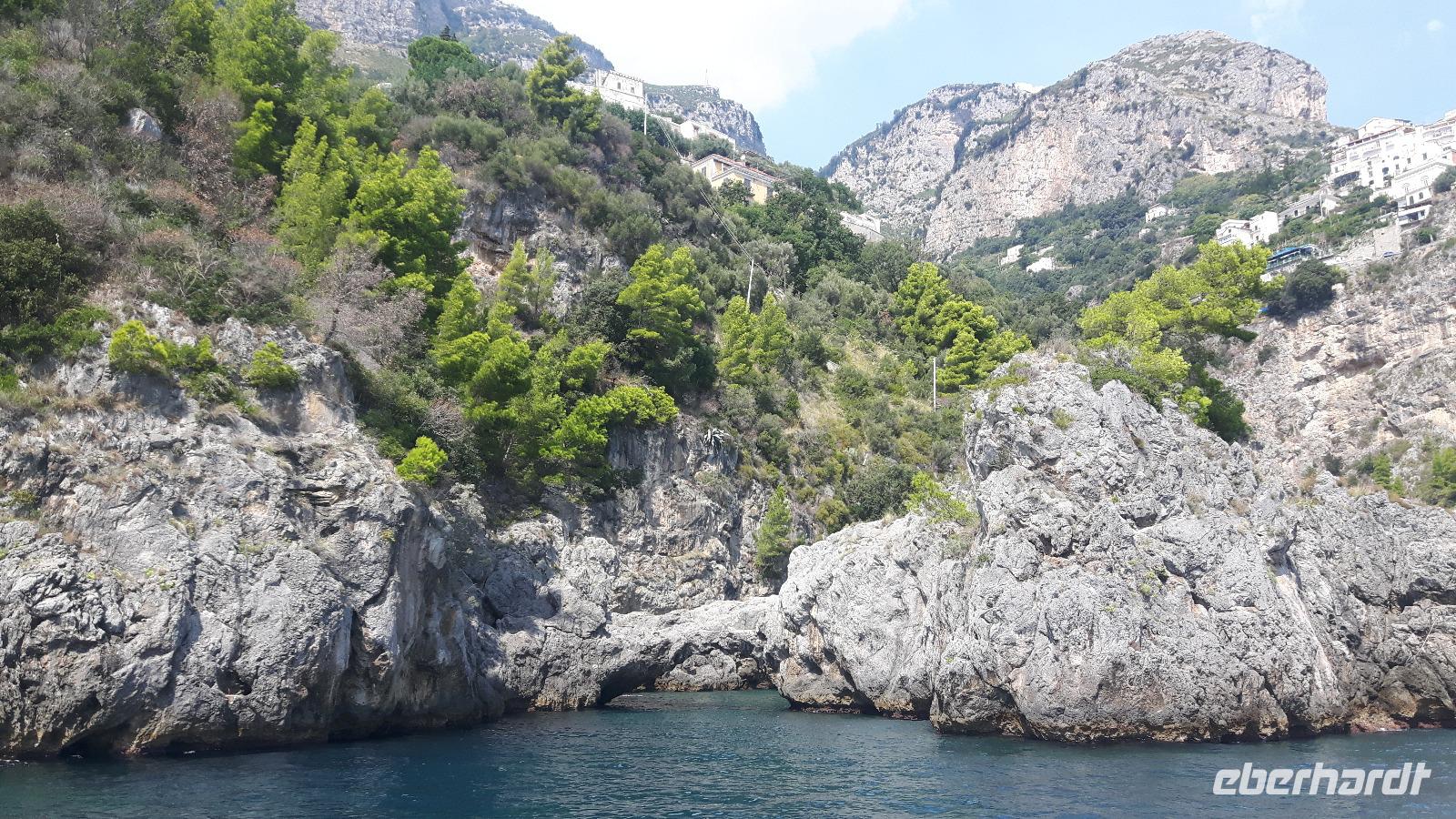 Da unser Bus auf der Amalfiküsten-Straße nicht fahren darf, denn dieser ist mit über 12 Metern Länge nicht zugelassen, fuhren wir heute mit einem einheimischen Bus samt italienischen Buschauffeur und unserer netten Fremdenführerin Claudia auf einer der schönsten Küstenstraßen Italiens. Diese Straße ist streckenweise sogar in die fast senkrecht abbrechende Felsküste eingehauen und mitunter sehr abenteuerlich. Wir legten immer wieder kleine Fotostopps ein, bis wir in Positano den Bus verließen, um mit dem Schiff die weitere Strecke nach Amalfi zurücklegten. Auf diese Weise hatten wir einen besseren Eindruck und sahen auch, wie hoch die Häuser den Berg hinauf steigen. Sowohl in Positano als auch in Amalfi legten wir längere Aufenthalte ein. Amalfi war im Mittelalter immerhin neben Pisa, Genua und Venedig eine der reichen und mächtigen vier Seerepubliken. Die Amalfitaner wurden damals hauptsächlich durch den Fernhandel mit dem Orient, Ägypten, Konstantinopel, Südfrankreich und Norditalien reich und hatten zudem eigene Handelsniederlassungen und eigene Wohnviertel in vielen Städten des Orients und auch in Süditalien bzw. Sizilien. Dann kam die Entdeckung Amerikas und die damit verbundene Verlagerung der Handelswege - Amalfi wurde ein armes, von der Außenwelt abgeschnittenes Nest hinter den Bergen. Einen erneuten Aufschwung gab es dann in der Mitte des 19. Jahrhunderts, als der Tourismus Einzug hielt. Wir hatten übrigens genügend Zeit, um den kleinen Ort ganz individuell zu entdecken und das spezielle Flair zu genießen. Am späten Nachmittag führte uns die Straße weiter über Vietri sul Mare und über die Autobahn nach Agerola zurück.