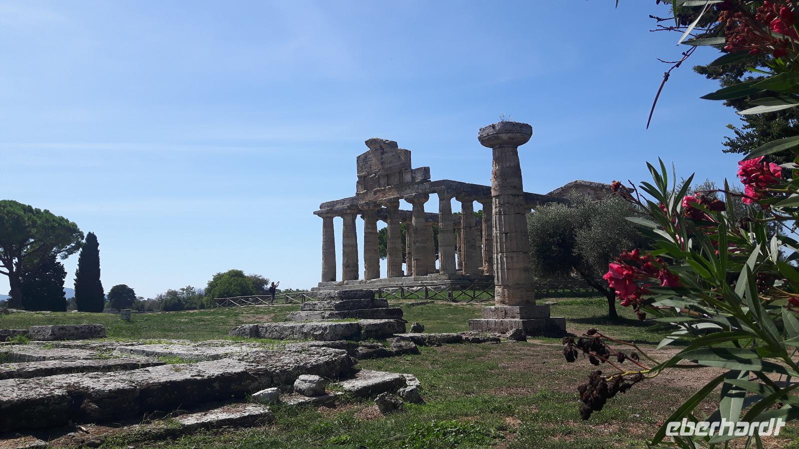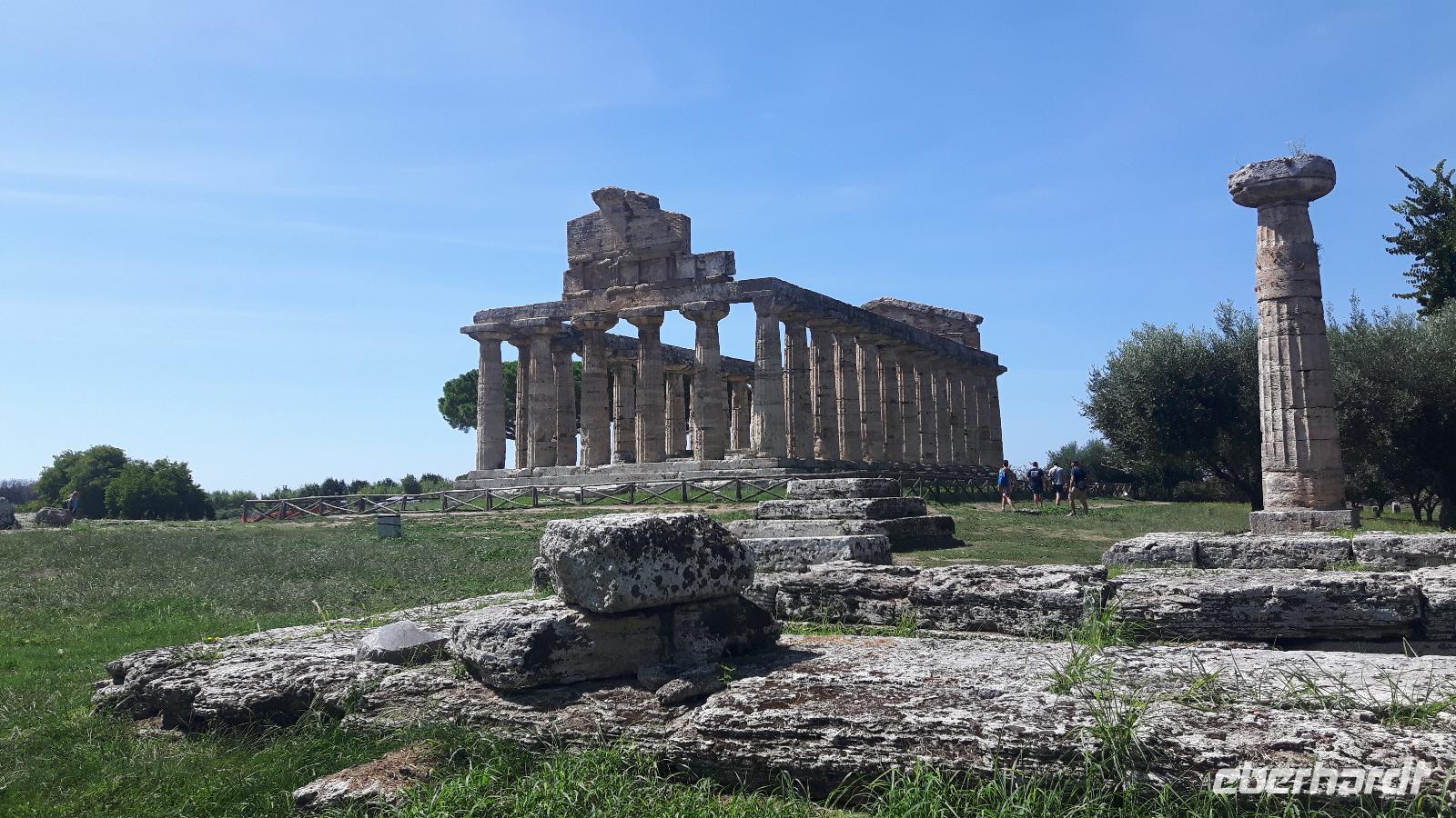 Heute fuhren wir in Richtung Süden - es ging an Salerno vorbei nach Paestum! Der Wettergott war auch wieder voll auf unserer Seite - blauer Himmel und Sonnenschein...! Unseren örtlichen Reiseleiter Angelo trafen wir gut gelaunt vor Ort. Zuerst ging es zur Büffel-Farm „Vannulo" unweit von Paestum. Hier konnten wir zuschauen, wie echter Büffel-Mozzarrella hergestellt wird bzw. erhielten wissenswerte Informationen zu diesem Prozess. Selbst eine Verkostung durfte nicht fehlen! Die weißen in der Molke schwimmenden Frischkäse sind hier in der Ebene von Paestum ganz echter Mozzarella aus Büffelmilch, egal ob pflaumengroße „Bocconcini" oder kiloschwer zu Zöpfen als „treccia" verflochten. Büffel-Mozzarella ist fetter und saftiger, hat anders als das Konkurrenzprodukt aus Kuhmilch eine zarte Außenhaut mit etwas Biss. Kenner nennen das dann „croccante". Geformt wird von Hand mit einem Griff wie Gurgelumdrehen (ital. „mozzare"), daher der Name. Mittlerweile wird hier sogar Schokolade aus Büffelmilch produziert, auch diese neue Spezialität des Hauses durften wir natürlich probieren - einfach köstlich! Genug Kulinarisches für heute, der heutige Hauptanziehungspunkt war Paestum - und dort die drei nahezu komplett erhaltenen griechischen Tempel nahe dem Meer. Das antike Paestum war eine der größten Griechen-Städte Süditaliens, wichtige Hafenstadt im Handel mit Etrurien und damals ein sicherer Schlüssel zum Reichtum. Die Stadt wurde schließlich von den Lucaniern erobert, später wurde der Stadtstaat römische Kolonie und danach ländlicher; die Fernhandelswege hatten sich verlagert. Paestum erlebte allerdings keinen Niedergang wie die meisten Städte Großgriechenlands; Eilkuriere brachten Rosen, Spargel und Artischocken aus Paestum nach Rom und Neapel. Erst im beginnenden Mittelalter verödete die Stadt durch Malaria, Piraten- und Sarazeneneinfälle, der Hafen versandete, die Stadt wurde von Schilf und Sumpfwäldern überwuchert und geriet völlig in Vergessenheit. Ein Glück für die Tempel, denn sonst wären sie wie andere antike Bauwerke als Steinbruch genutzt worden. Der antike Fruchtbarkeitskult an die Göttermutter Hera (Symbol der Fruchtbarkeit: ein Granatapfel), der die meisten Tempel gewidmet waren, ging auf die Madonna über. Ihr Heiligtum ist in den Bergen bei Capaccio, wohin die letzten Bewohner Paestums abgewandert waren. Dort befindet sich die Kirche der Madonna del Granato, ein Ziel bäuerlicher Wallfahrten im Sommer. Am späten Nachmittag fuhren wir wieder zurück, vorbei an riesigen Landwirtschaftsflächen - hier werden vor allem Artischocken angebaut. Kurz nach Salerno hatten wir noch einmal einen kurzen Blick auf den südlichen Teil der Amalfiküste und letztendlich änderte sich die Landschaft vollständig. Wir nahmen die Autobahn und fuhren durch das Hinterland der Monti Lattari (Milchberge) zurück. Zurück im Hotel erwartete uns heute ein ganz besonderer Abend - wir erlebten ein Gala-Dinner mit Musik & Tanz, ein wahrhaftig gelungener Abend!