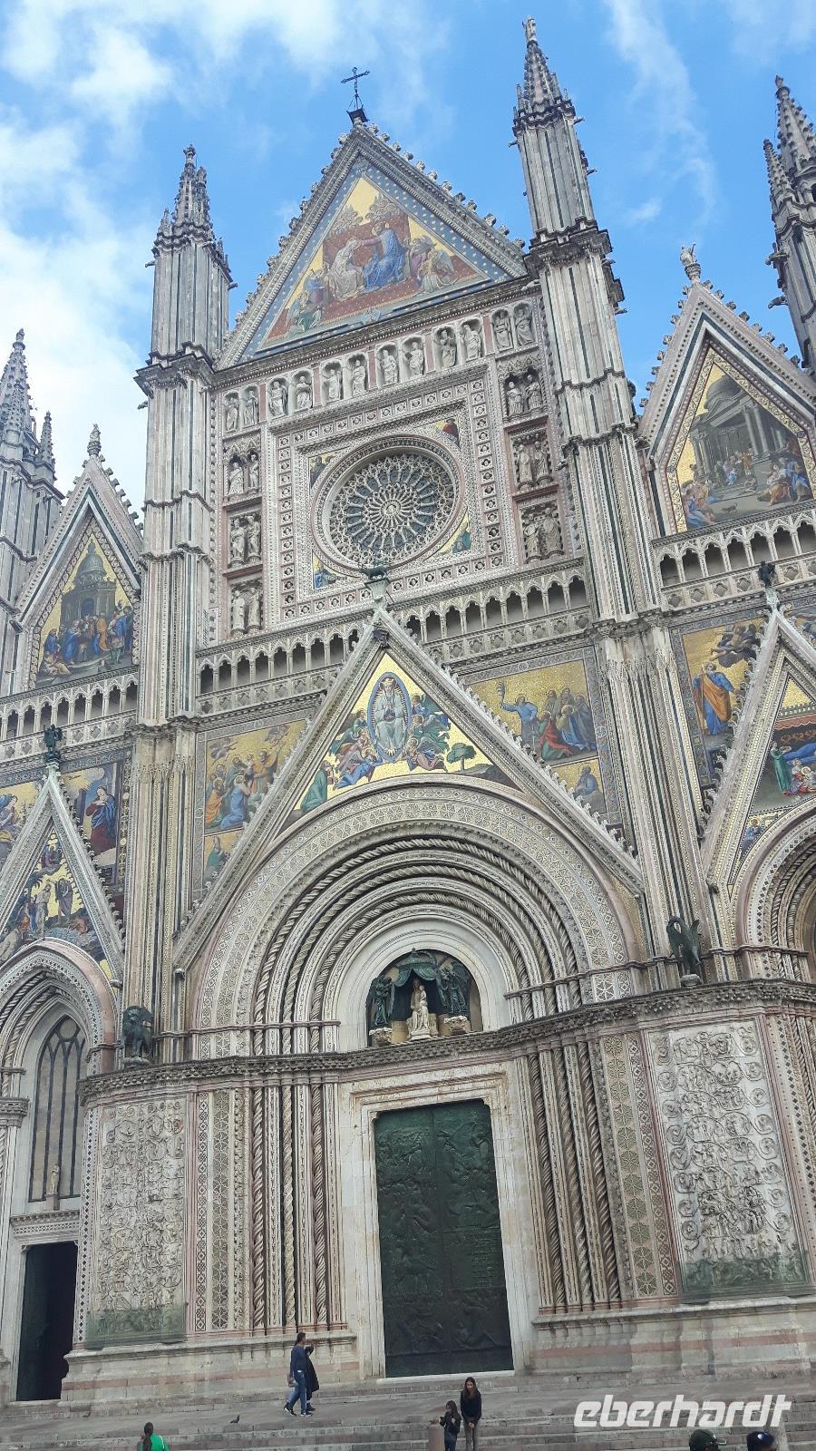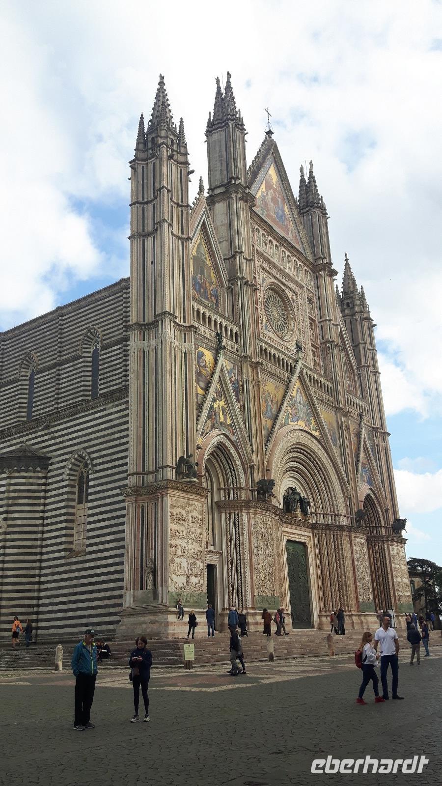 Zunächst wurden wir mit einem für italienische Verhältnisse „reichhaltigen Frühstücksbuffet" überrascht - sogar Eier und dunkle Brötchen waren vertreten... Derart gut gestärkt fuhren wir weiter in Richtung Süden. Bei Verona traten wir in die weitläufige Po-Ebene ein und überquerten später südlich von Mantua auch den Po, den längsten Fluß Italiens bzw. auch den Namensgeber der Ebene. Wenig später erreichten wir Modena, wo nach insgesamt 333 Kilometern die Brennerautobahn endete und es für uns auf der Autostrada del Sole am Südrand der Po-Ebene entlang bis Bologna und anschließend durch den tosco-emilianisch-romagnolischen Apennin weiterging. Hier gibt es glücklicherweise seit Dezember 2015 eine neue Autobahn, die die Fahrtzeit gegenüber der alten Strecke mit einem Scheitelpunkt von über 700 Höhenmetern erheblich verkürzt. Nunmehr schneidet die Autobahn fast geradlinig durch mehrere kilometerlange Tunnel das Gebirge. Etwa 40 Kilometer nördlich von Florenz kamen wir in der Toskana, einer der bekanntesten Regionen Italiens, an! Florenz ließen wir heute leider nur links liegen, aber wir hatten schließlich auch noch einiges vor und erlebten zunächst eine grandiose Fahrt durch die sanft gewellte Hügellandschaft der Toskana! Wir fuhren vorbei an Arezzo und Montepulciano in die Region Umbrien hinein. Dies ist eine der wenigen Binnenregionen Italiens und wird oft auch als das „grüne Herz Italiens" bezeichnet. Unser Ziel war Orvieto, wahrhaft einzigartig auf einem 300 Meter hohen vulkanischen Tuff-Felsen gelegen! Gemeinsam mit unserer netten Stadtführerin Chiara fuhren wir mit einer Funicolare in die Altstadt von Orvieto hinauf. Der ursprünglich etruskische Ort mit seinen herrlichen Baudenkmälern zählt heute immerhin zu den interessantesten Städten Mittelitaliens. Wir besichtigten gemeinsam das Wahrzeichen, den imposanten Dom, dessen Bau Ende des 13. Jahrhunderts begann und bis zur Vollendung im Jahr 1600 die Zusammenarbeit von ungefähr hundert Architekten, Bildhauern, Malern und Mosaiklegern erforderte. Die Fassade des Doms ist einzigartig, die kühnste und farbenprächtigste der italienischen Gotik! Anschließend flanierten wir durch die Altstadt mit ihren engen Gassen und schicken kleinen Geschäften. Leider war unsere Zeit in Orvieto begrenzt, denn es war heute immerhin nur eine kurze Stippvisite... Mit vielen schönen ersten Eindrücken im Gepäck erreichten wir am Abend Rom, die Hauptstadt Italiens! Gegen 19 Uhr kamen wir im südlich vom Stadtzentrum gelegenen Hotel „Oly", unserem Quartier für die nächsten drei Nächte, an. Hier begrüßten wir auch weitere 9 Fluggäste und somit war unsere Reisegruppe mit nunmehr insgesamt 21 Personen komplett. Unser Abendessen nahmen wir heute gemeinsam im Hotel ein.