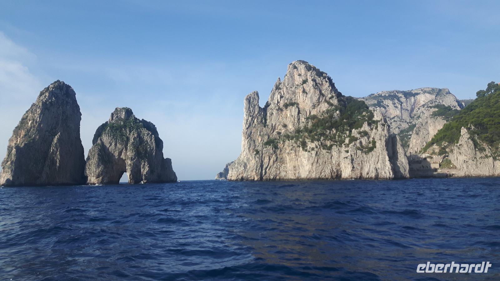 Heute stand ein weiterer Höhepunkt dieser Reise an... - der fakultative Ausflug zur Insel Capri! Zunächst fuhren wir mit einem kleinen italienischen Bus nach Sorrent und erreichten den dortigen Hafen, um von hier aus die Fähre zur Insel Capri zu nehmen. Die Überfahrt dauerte nur etwa 35 Minuten. Die Insel türmt sich schon von weitem wie unzugänglich auf. Zwei durch einen geschwungenen Sattel verbundenen Hochebenen, auf denen die Orte Capri und Anacapri liegen, ineinander geschachtelte Häuserkuben, überragt von gekalkten und bunt gekachelten Kuppeln. Für uns war klar - Capri ist der Kontrast zwischen intensivem Blau des Meers, den strahlend weißen Felswänden und dem tiefen Grün der Vegetation. Wir unternahmen eine wunderbare Schifffahrt einmal rund um die Insel und die Perspektiven vom Meer aus bei übrigens bestem Wetter faszinierten uns. Von unserer Fremdenführerin Ida erfuhren wir unter anderem, dass schon die Römer der Antike die Insel Capri als Urlaubsort schätzten und hier ihre Spuren hinterlassen haben. Capri ist heute für das Mittelmeergebiet ein Botanischer Garten, auf so engem Raum lässt sich sonst nirgends die Vielfalt der mittelmeerischen Pflanzenwelt beobachten. Für die Geologen ist besonders interessant, dass Capri nur die Fortsetzung der Amalfitanischen Halbinsel ist. Rund um die Insel gibt es über sechzig Höhlen und Grotten zu bewundern, einige davon sahen wir während unserer Schifffahrt. Wieder an Land, besuchten die beiden Inselorte, Anacapri und Capri-Zentrum - diese beiden Orte leben solange man weiß in Fehde; sie hatten sich voneinander isoliert und erst die im letzten Jahrhundert geschaffene Straßenverbindung brachte eine Veränderung. Wir fuhren in Minibussen auf den engen abenteuerlichen Straßen der Insel - das muss man unbedingt erlebt haben...! Am frühen Abend verließen wir diese „Paradies" leider wieder und fuhren mit der Fähre auf das Festland zurück. Unser Tag auf der Insel Capri war einfach fantastisch und voller schöner Eindrücke ließen wir diesen herrlichen Tag bei einem schmackhaften gemeinsamen Abendessen im Hotel ausklingen.
