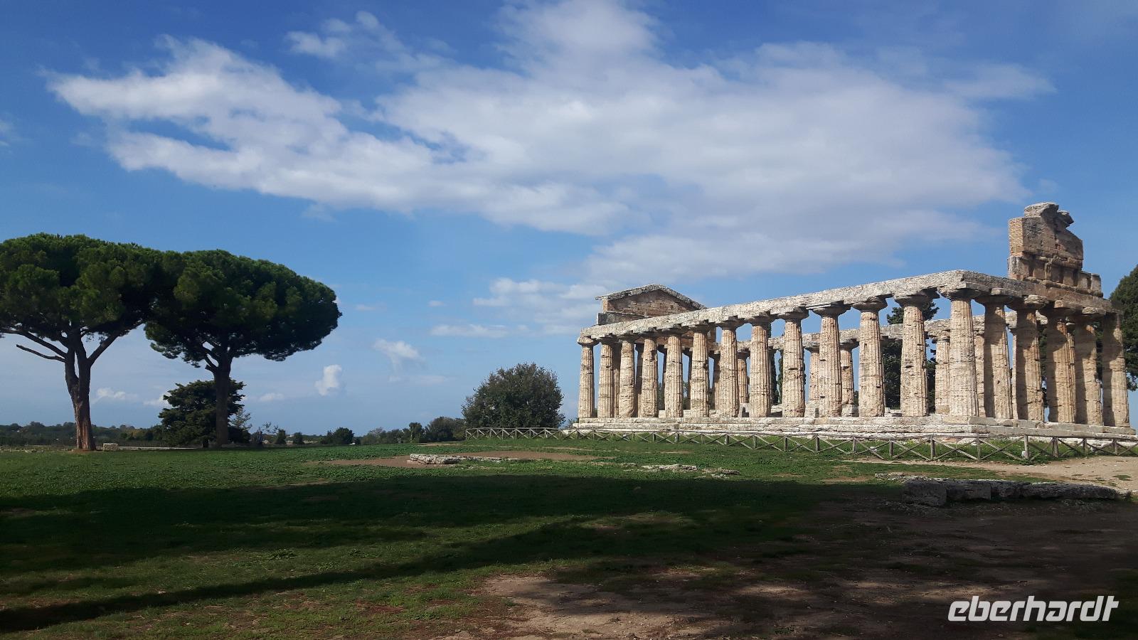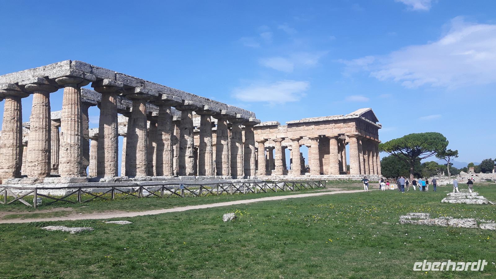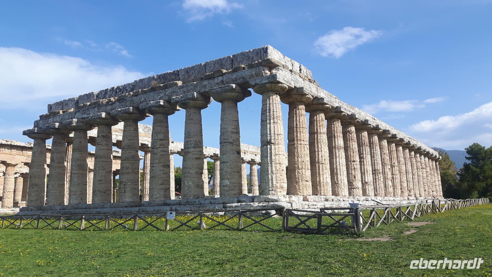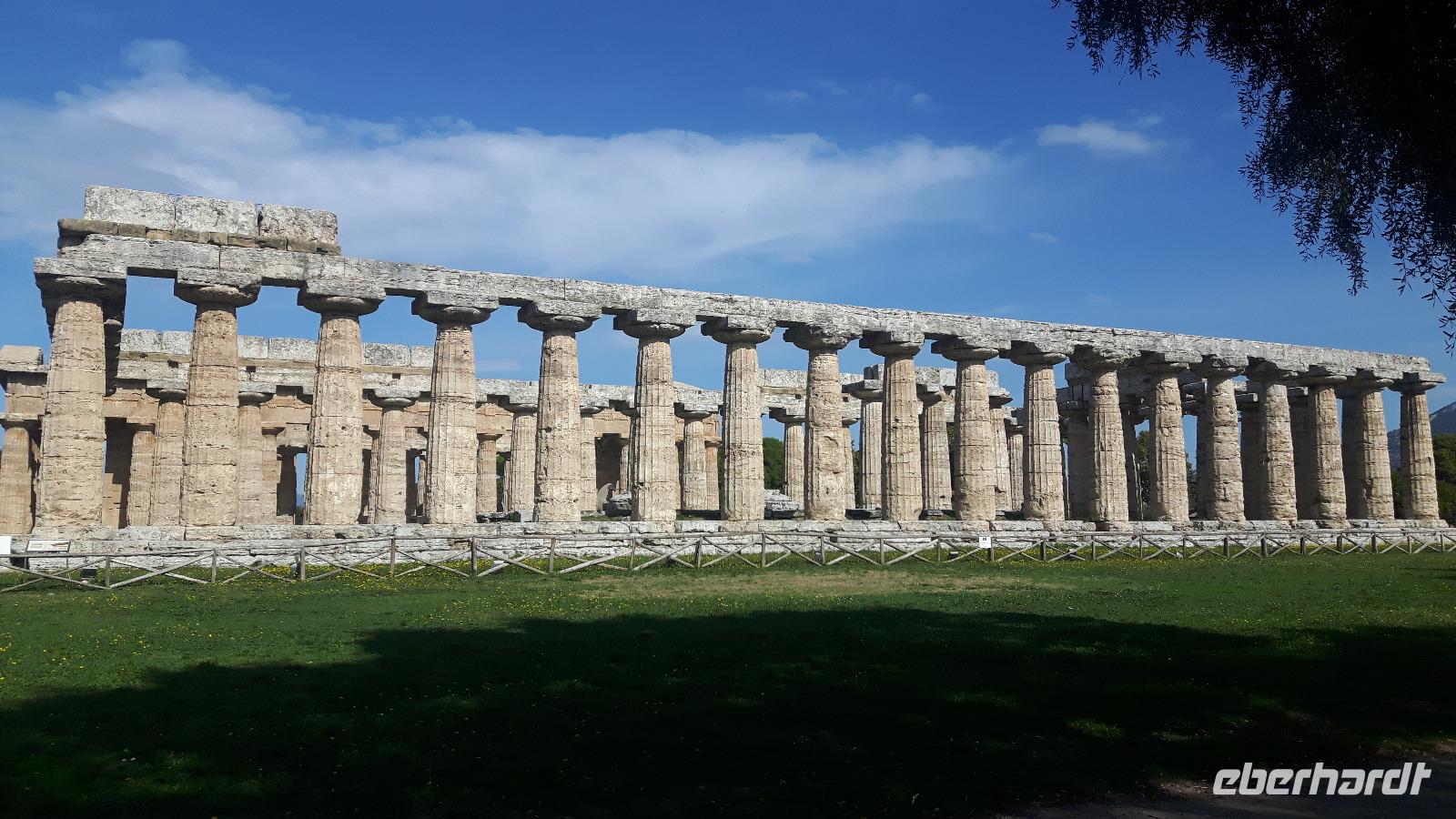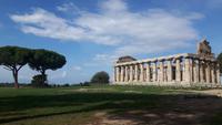 Heute ging es wieder mit unserem Bus zum südlichsten Punkt auf dieser Reise - an Salerno vorbei nach Paestum! Das Wetter spielte auch heute wieder nach unseren Regeln - es gab Sonne satt! Unseren örtlichen Reiseleiter Angelo trafen wir gut gelaunt vor Ort. Zuerst steuerten wir die Büffel-Farm „Vannulo", unweit von Paestum, an. Hier konnten wir sehen, wie echter Büffel-Mozzarrella hergestellt wird bzw. erhielten wissenswerte Informationen zu diesem Prozess. Selbst eine Verkostung der hauseigenen Produkte durfte nicht fehlen! Mittlerweile wird hier sogar Schokolade aus Büffelmilch produziert - einfach köstlich. Jetzt erstmal genug Kulinarisches, der heutige kulturelle Hauptanziehungspunkt galt natürlich Paestum - und dort die drei nahezu komplett erhaltenen griechischen Tempel nahe dem Meer. Das antike Paestum war eine der größten Griechen-Städte Süditaliens, wichtige Hafenstadt im Handel mit Etrurien und damals ein sicherer Schlüssel zum Reichtum. Die Stadt wurde schließlich von den Lucaniern erobert, später wurde der Stadtstaat römische Kolonie und danach ländlicher, denn die Fernhandelswege hatten sich verlagert. Paestum erlebte allerdings keinen Niedergang wie die meisten Städte Großgriechenlands, denn erst im beginnenden Mittelalter verödete die Stadt durch Malaria, Piraten- und Sarazeneneinfälle. Der Hafen versandete und die Stadt wurde von Schilf und Sumpfwäldern überwuchert. Schließlich geriet die Stadt völlig in Vergessenheit. Das war ein Glück für die Tempel, denn sonst wären sie nämlich wie andere antike Bauwerke als Steinbruch genutzt worden! Am späten Nachmittag fuhren wir wieder zurück, vorbei an riesigenLandwirtschaftsflächen - hier werden größtenteils Artischocken angebaut. Kurz nach Salerno hatten wir noch einmal einen kurzen Blick auf den südlichen Teil der Amalfiküste und letztendlich erlebten wir einen völligen Landschaftswechsel. Wir nahmen die Autobahn und fuhren durch das Hinterland der Monti Lattari (Milchberge) zurück.