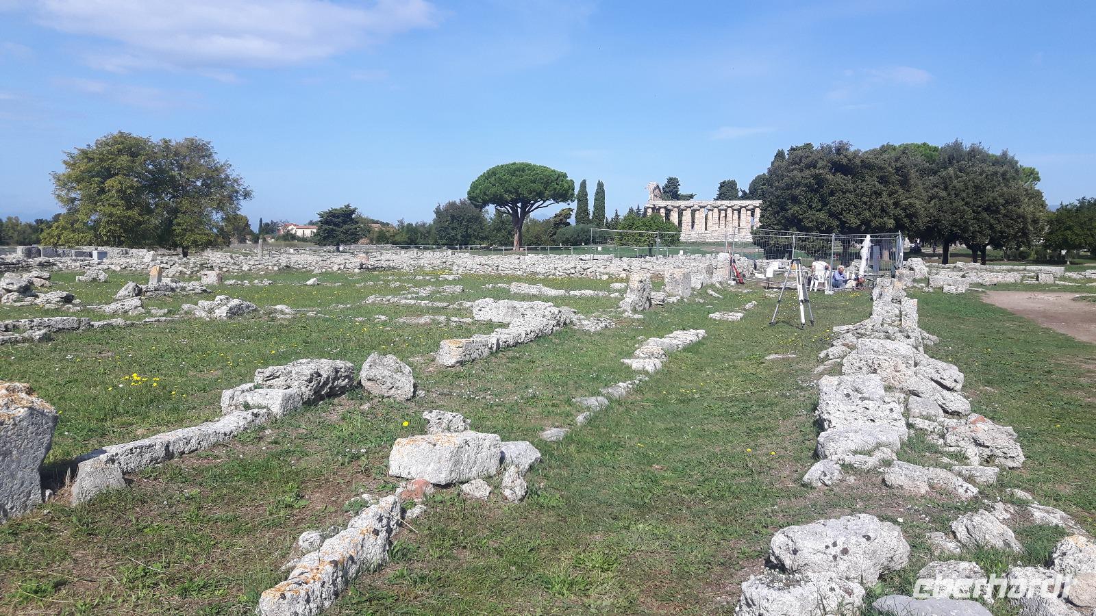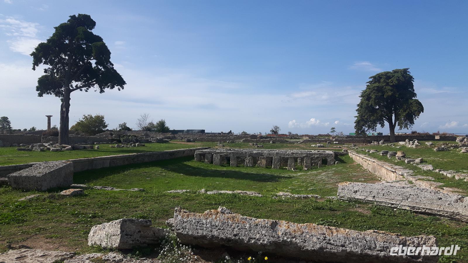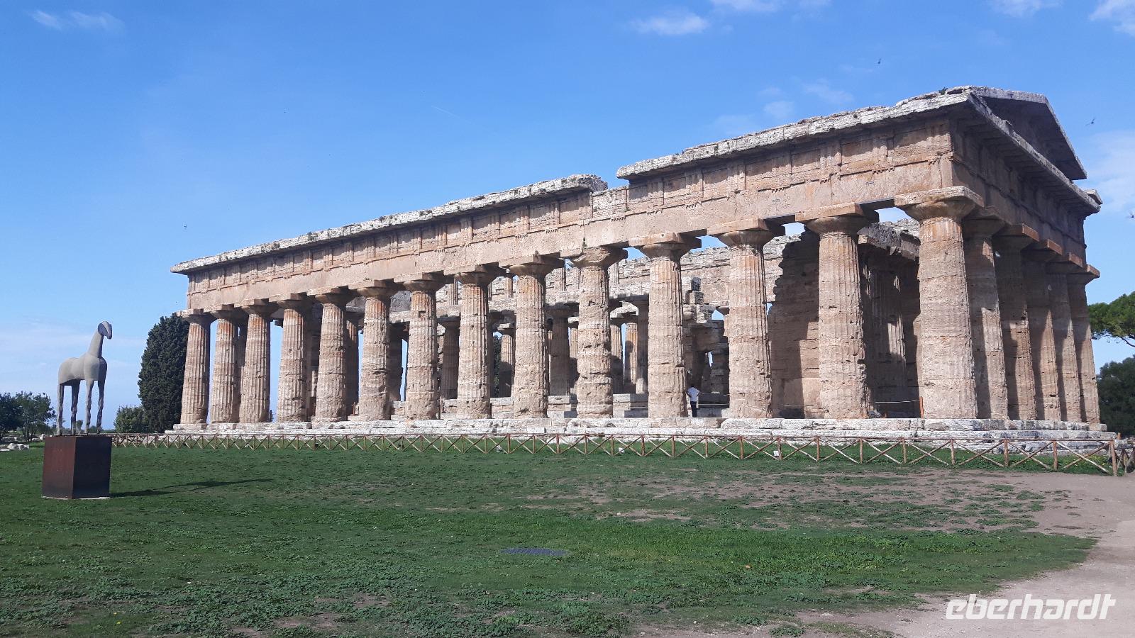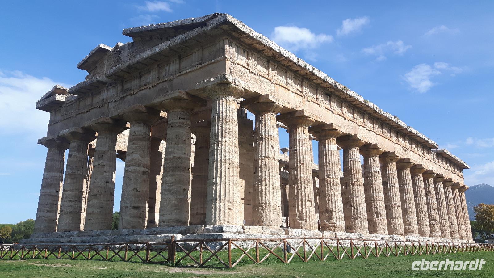 Heute ging es wieder mit unserem Bus zum südlichsten Punkt auf dieser Reise - an Salerno vorbei nach Paestum! Das Wetter spielte auch heute wieder nach unseren Regeln - es gab Sonne satt! Unseren örtlichen Reiseleiter Angelo trafen wir gut gelaunt vor Ort. Zuerst steuerten wir die Büffel-Farm „Vannulo", unweit von Paestum, an. Hier konnten wir sehen, wie echter Büffel-Mozzarrella hergestellt wird bzw. erhielten wissenswerte Informationen zu diesem Prozess. Selbst eine Verkostung der hauseigenen Produkte durfte nicht fehlen! Mittlerweile wird hier sogar Schokolade aus Büffelmilch produziert - einfach köstlich. Jetzt erstmal genug Kulinarisches, der heutige kulturelle Hauptanziehungspunkt galt natürlich Paestum - und dort die drei nahezu komplett erhaltenen griechischen Tempel nahe dem Meer. Das antike Paestum war eine der größten Griechen-Städte Süditaliens, wichtige Hafenstadt im Handel mit Etrurien und damals ein sicherer Schlüssel zum Reichtum. Die Stadt wurde schließlich von den Lucaniern erobert, später wurde der Stadtstaat römische Kolonie und danach ländlicher, denn die Fernhandelswege hatten sich verlagert. Paestum erlebte allerdings keinen Niedergang wie die meisten Städte Großgriechenlands, denn erst im beginnenden Mittelalter verödete die Stadt durch Malaria, Piraten- und Sarazeneneinfälle. Der Hafen versandete und die Stadt wurde von Schilf und Sumpfwäldern überwuchert. Schließlich geriet die Stadt völlig in Vergessenheit. Das war ein Glück für die Tempel, denn sonst wären sie nämlich wie andere antike Bauwerke als Steinbruch genutzt worden! Am späten Nachmittag fuhren wir wieder zurück, vorbei an riesigenLandwirtschaftsflächen - hier werden größtenteils Artischocken angebaut. Kurz nach Salerno hatten wir noch einmal einen kurzen Blick auf den südlichen Teil der Amalfiküste und letztendlich erlebten wir einen völligen Landschaftswechsel. Wir nahmen die Autobahn und fuhren durch das Hinterland der Monti Lattari (Milchberge) zurück.