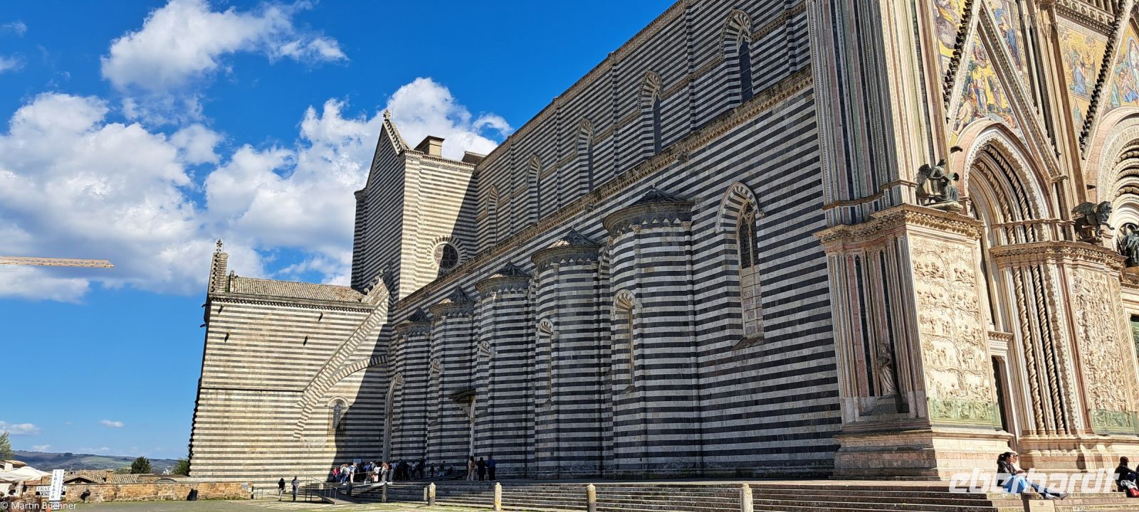 Überirdisch ist die Stadt nicht weniger spektakulär. Renaissance und Mittelalter prägen das Stadtbild. Mittelalterliche Geschlechtertürme, Enge Gassen einerseits, ein alles überragender Renaissance Dom anderseits. Unscheinbar, von weitem - schon gar nicht aus dem Tibertal ist dieser Dom kaum wahrnehmbar. Noch in den Gassen der Altstadt erwartet man an der nächsten Biegung ein Kirchlein. Doch plötzlich befindet man sich auf einem weiten offenen monumentalen Domplatz. Man steht vor einem gewaltigen Dom des italienischen Mittelalters, nicht weniger prächtig als in Florenz oder Siena, die Inspiration sind klar zu erkennen. Zunächst in Siena begonnen, davon motiviert der Dombau zu Florenz, entstand nahezu zeitgleich der Dombau zu Orvieto.