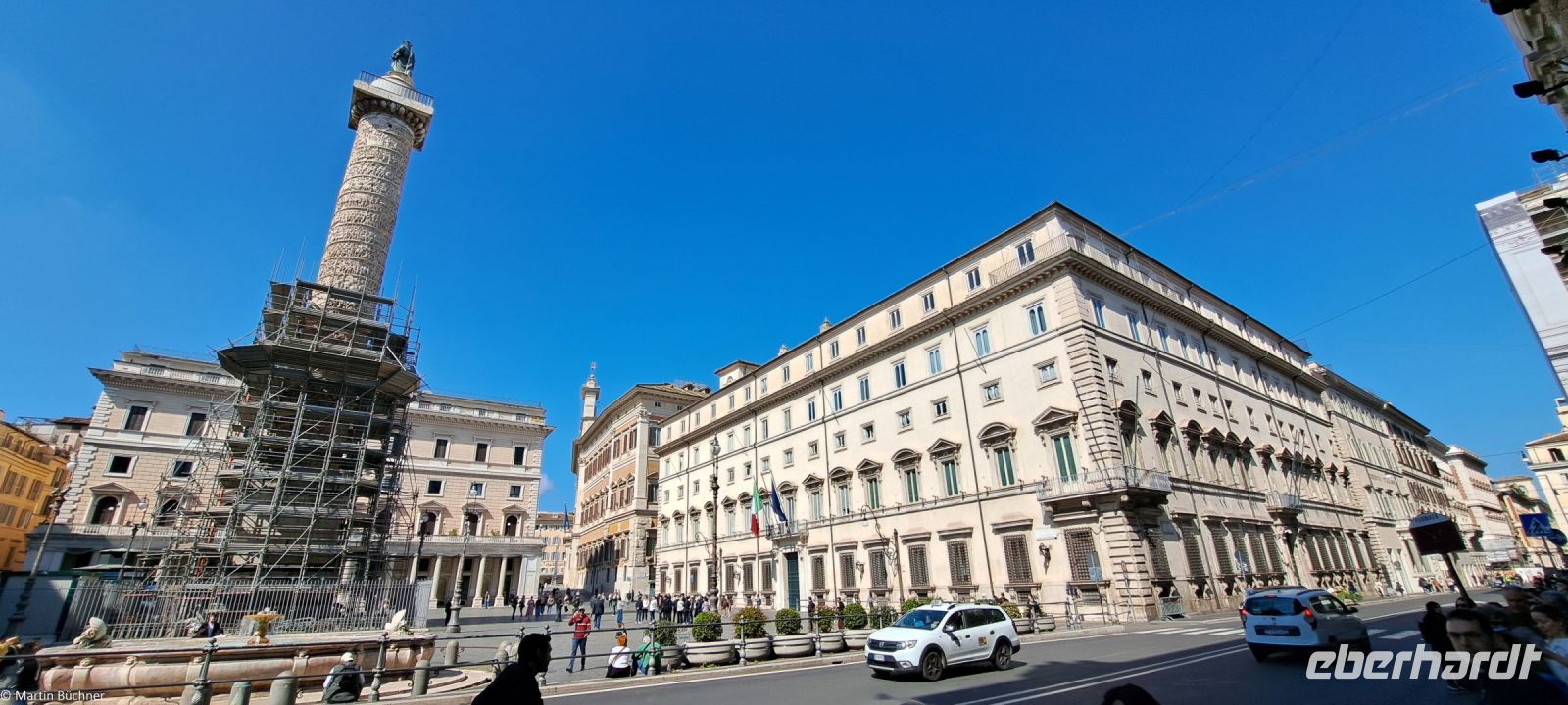 Unweit des Pantheons stand der Minerva Tempel, vor den Überresten befindet sich der Obelisco della Minerva, ein Elefant auf einem Sockel, der einen ägyptischen Obelisk auf seinem Rücken trägt. Der Obelisk stammt aus dem 6. Jh. v. Chr., die Statue selbst aus dem 17. Jh. entworfen von Bernini. Wir erreichen den Piazza Venezia am Fuß des Kapitolshügels. Hier steht der Palazzo Venzia – ehemalige venezianische Botschaft. Dieser Palast wurde im 20. Jh. berühmt, da von einem seiner Balkone Mussolini stets seine faschistischen Reden hielt. Gegenüber des Piazza Venzia befindet das gigantische Monumento a Vittorio Emanuele II, es erinnert an den König des wiedervereinigten Italiens, nicht besonders beliebt bei den Römern. Auf dem Kapitol liegt das römische Rathaus.