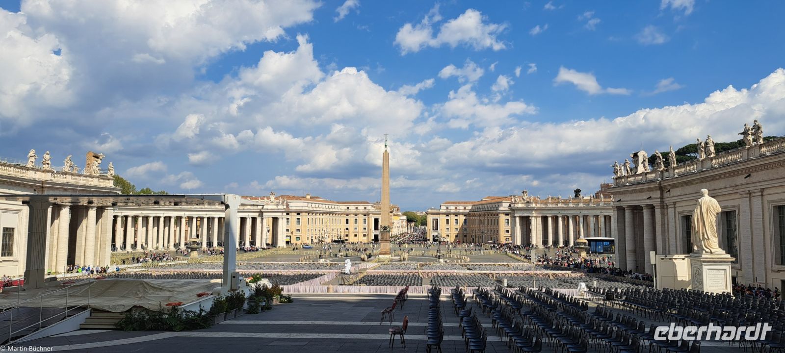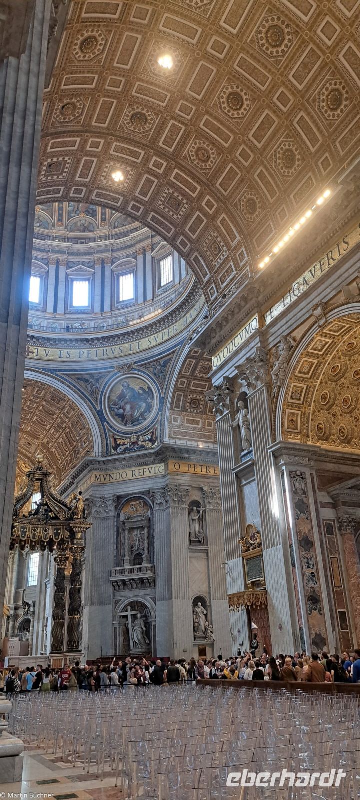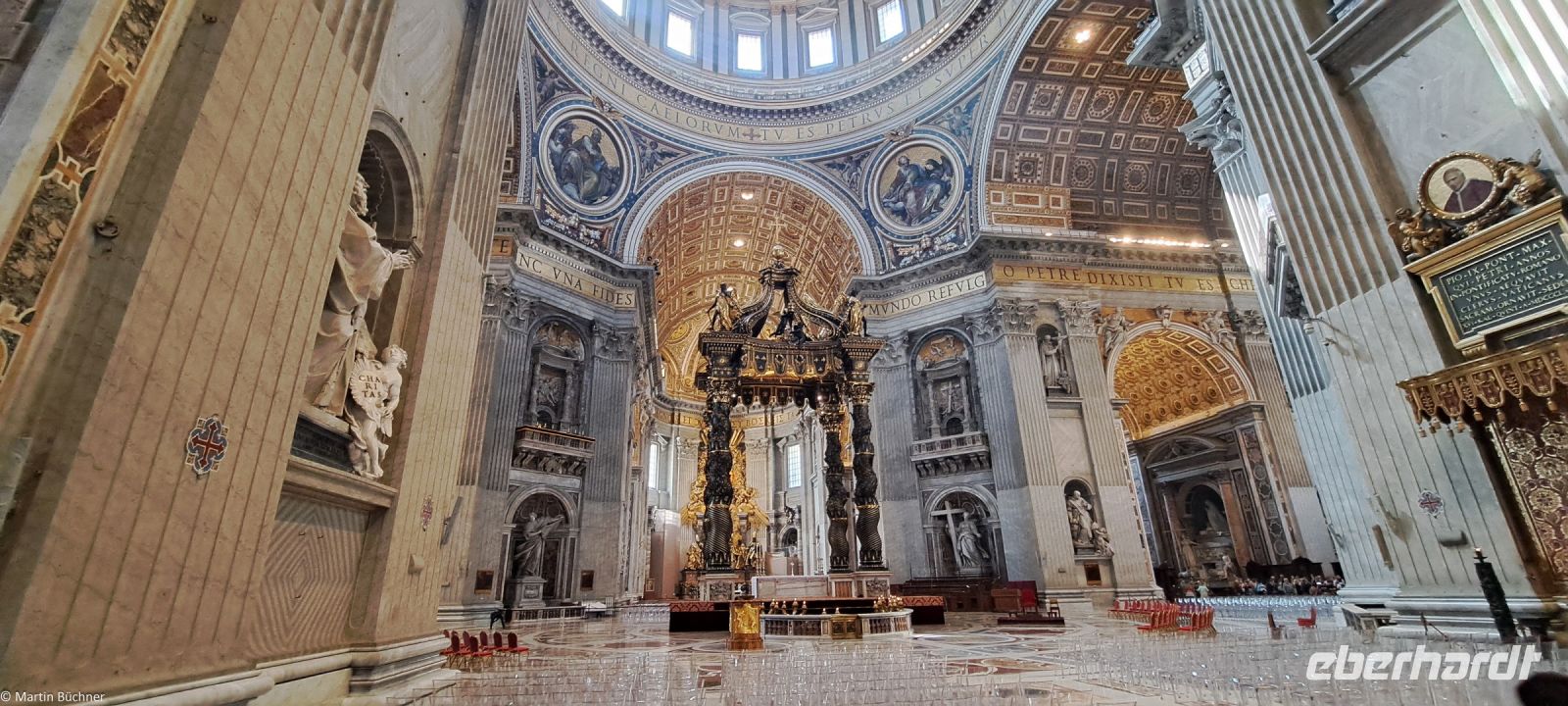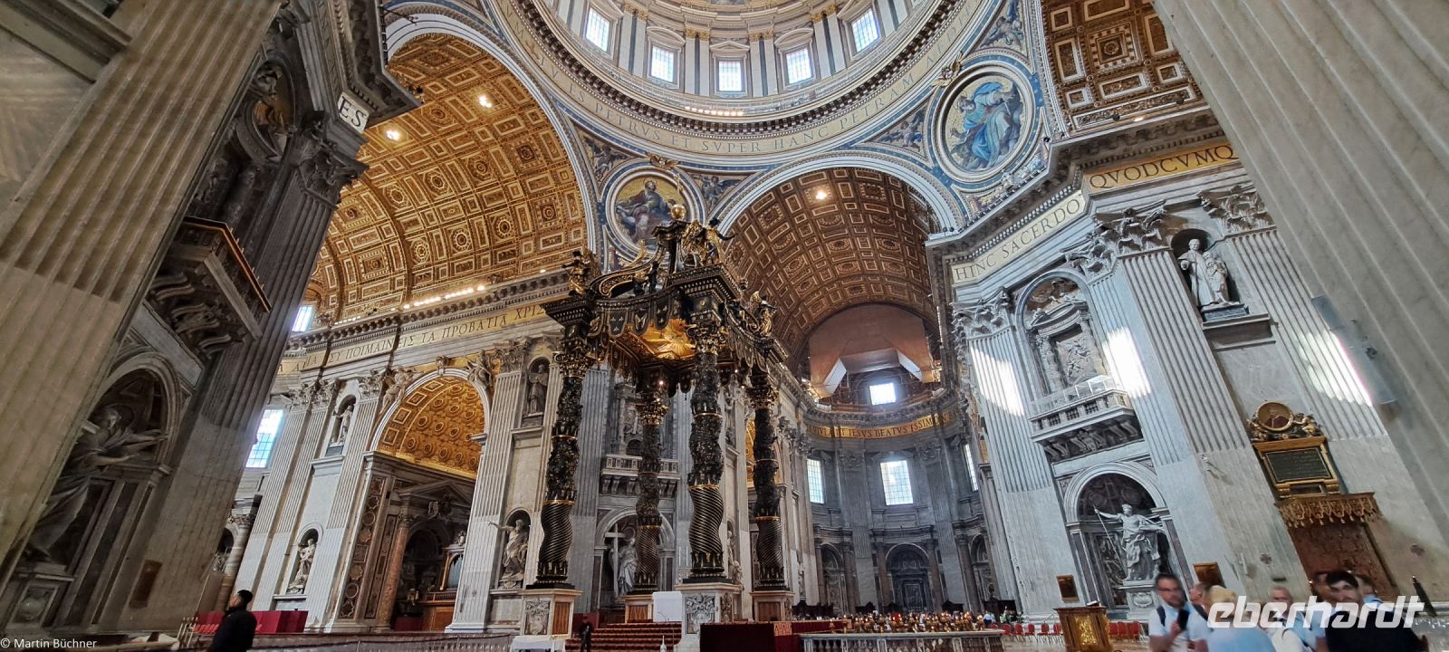 Wie tausende Pilger in den vergangenen Jahrhunderten vor uns, durschreiten wir die Kolonnaden von Bernini – angelegt als „Schoß der Mutter Kirche“ und stehen auf dem Petersplatz. Der Blick ist frei auf den Petersdom, der größten Kirche der Welt.