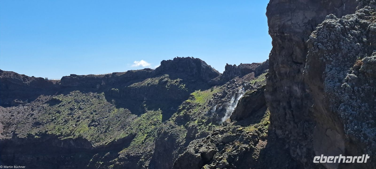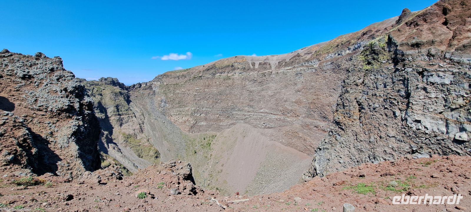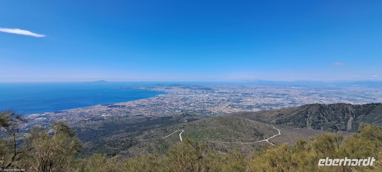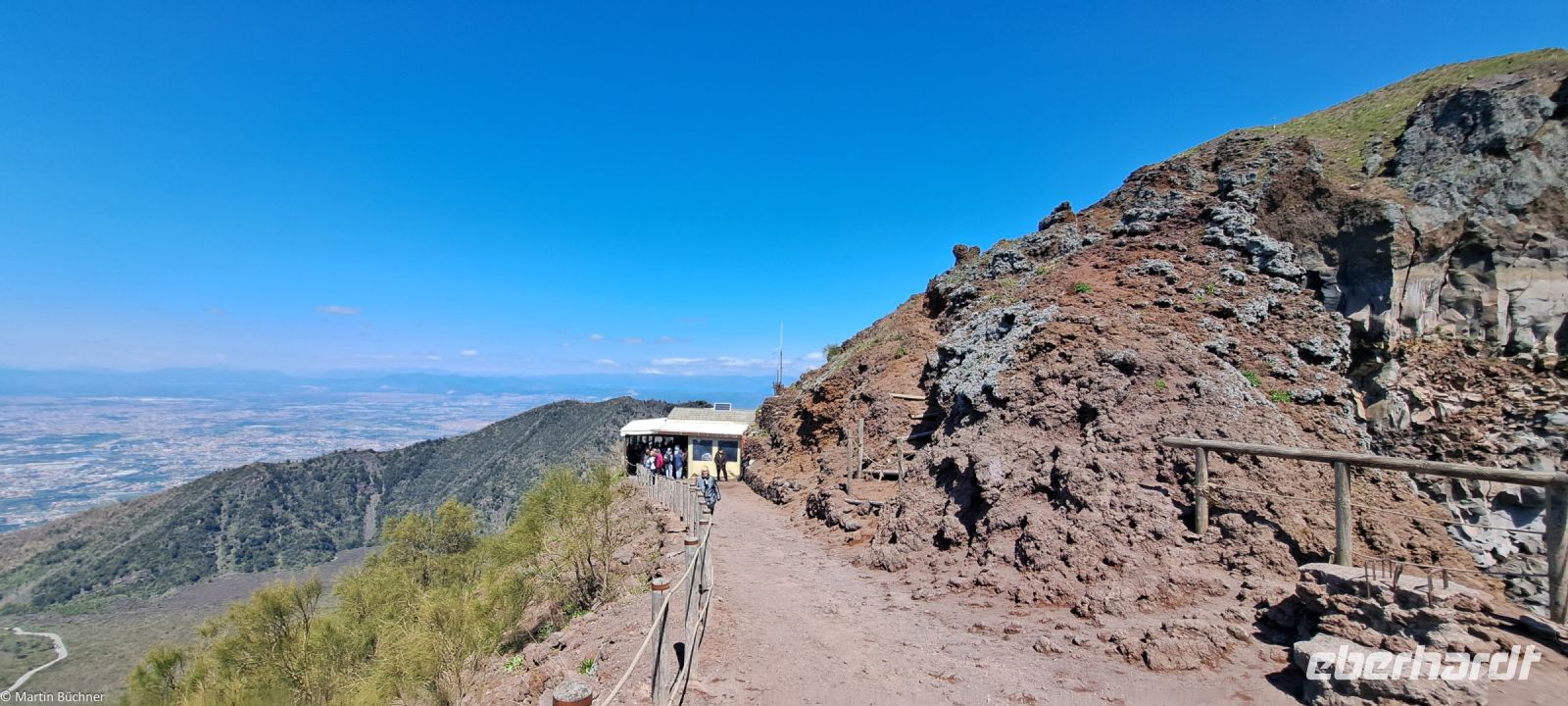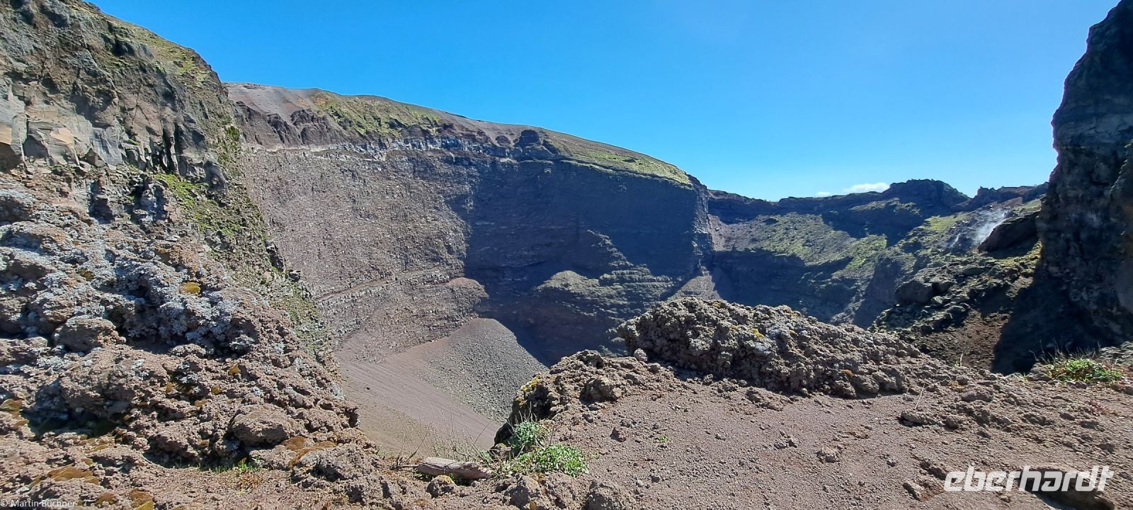 Am Kraterrand angekommen bietet sich ein fantastischer Ausblick – 500 Meter im Durchmesser – 300 Meter tief – den Pariser Eiffelturm könnte man also gut im Krater verstecken. Dampfende Fumarolen zeugen davon, dass hier nichts erloschen, sondern lediglich ruhend ist. Zu anderen Seite bietet sich ein fantastisches Panorama über den Golf von Neapel mit den Milchbergen im Süden, der Sorrentinischen Halbinsel, der Insel Capri. Nach Norden die Millionenmetropole Neapel in der Ferne Pozzuoli mit den Phlegräischen Feldern, der Insel Procida und Insel Ischia.