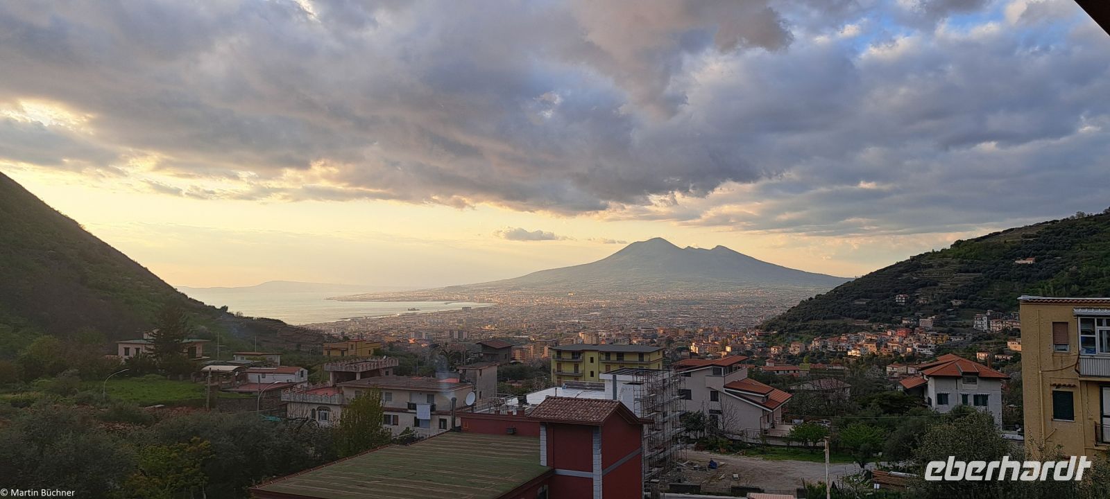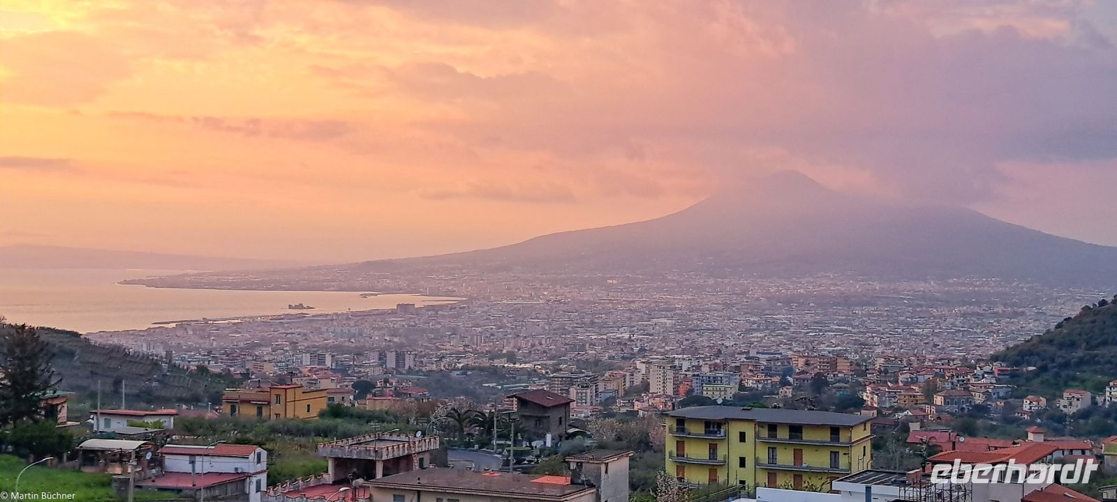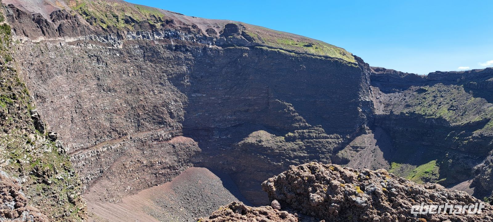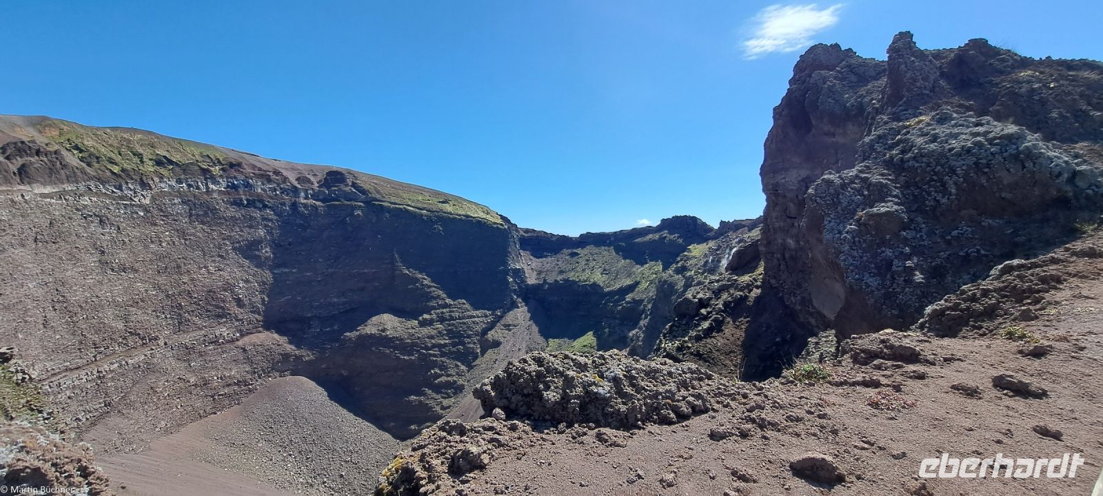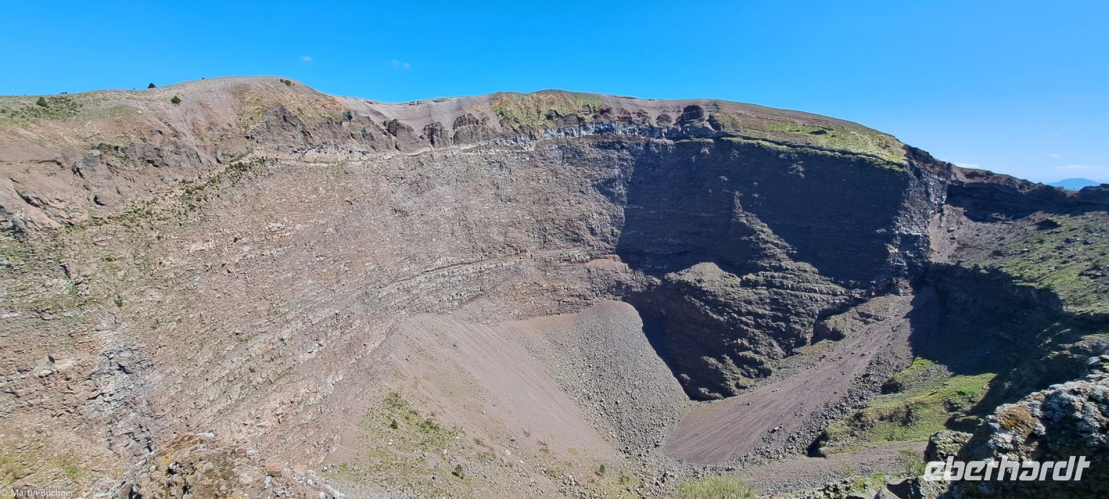 Am Kraterrand angekommen bietet sich ein fantastischer Ausblick – 500 Meter im Durchmesser – 300 Meter tief – den Pariser Eiffelturm könnte man also gut im Krater verstecken. Dampfende Fumarolen zeugen davon, dass hier nichts erloschen, sondern lediglich ruhend ist. Zu anderen Seite bietet sich ein fantastisches Panorama über den Golf von Neapel mit den Milchbergen im Süden, der Sorrentinischen Halbinsel, der Insel Capri. Nach Norden die Millionenmetropole Neapel in der Ferne Pozzuoli mit den Phlegräischen Feldern, der Insel Procida und Insel Ischia.