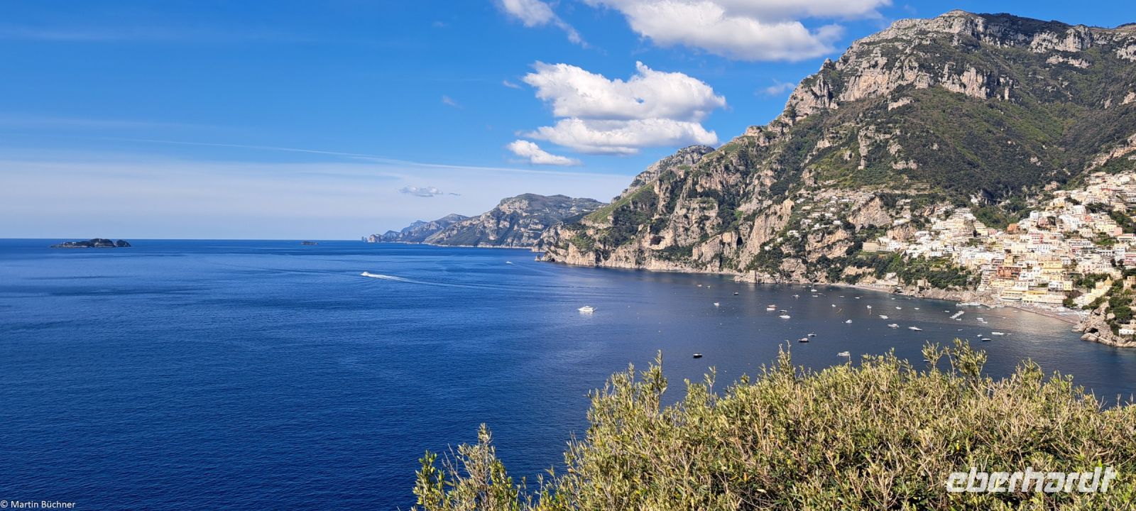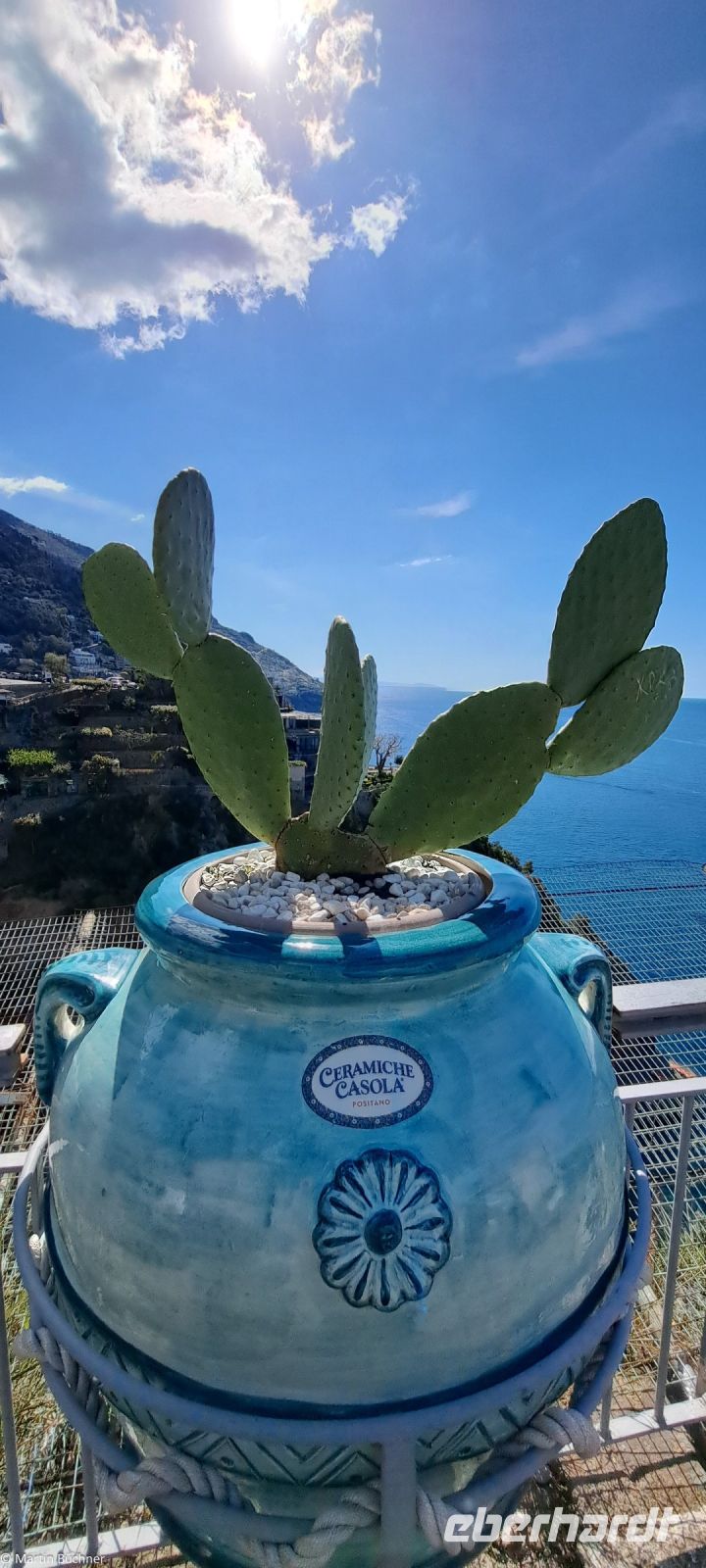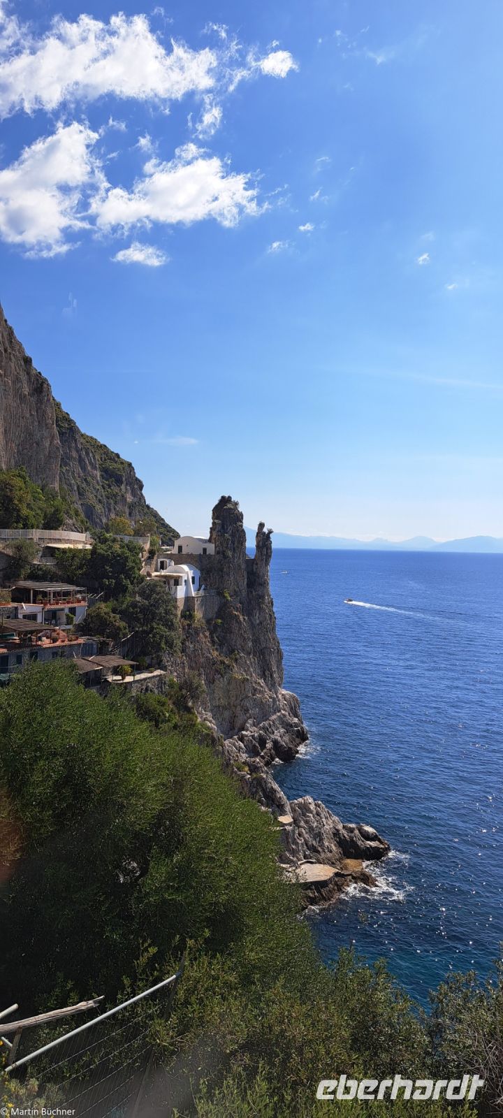 Die Amalfitana, die Küstenstraße der der Amalfiküste darf nur mit speziellen lokalen Kleinbussen befahren werden. Unser Bus hat einen Tag Pause, während wir auf einen dieser Bus zurückgreifen. Die südliche Begrenzung des Golfs von Neapel wird von der Sorrentinischen Halbinsel gebildet. Ihr Hauptort ist Sorrent am Golf von Sorrent, einer kleineren Bucht am Golf von Neapel. Die sorrentinische Halbinsel setzt sich unter Wasser fort, bevor sie noch einmal als „Insel Capri“ über die Wasseroberfläche tritt. Capri ist anders als Ischia nicht vulkanischen Ursprungs, sondern besteht tatsächlich aus dem gleichen Gestein wie die Milchberge auf der Sorrentinischen Halbinsel. Auf der Rückseite der Halbinsel, dem Tyrrhenischen Meer zugewandt, zwischen Sorrent im Norden und Salerno im Süden erstreckt sich die weltberühmte Amalfiküste. Geprägt vom Menschen mit seinen Siedlungen wie Positano und die ehemalige Seerepublik und Stadt Amalfi und natürlich den modernen Straßen, ist diese Steilküste Teil des UNESCO Weltkulturerbes.