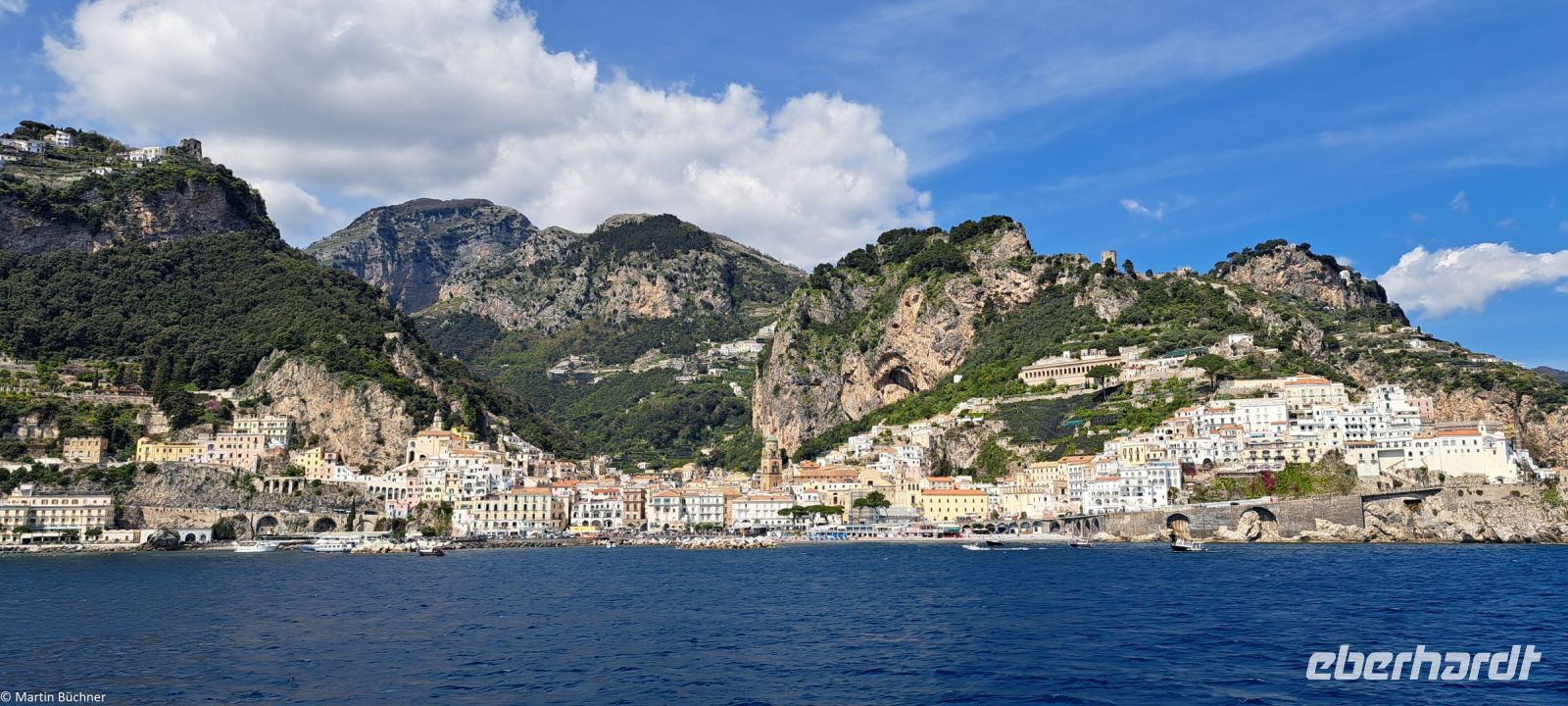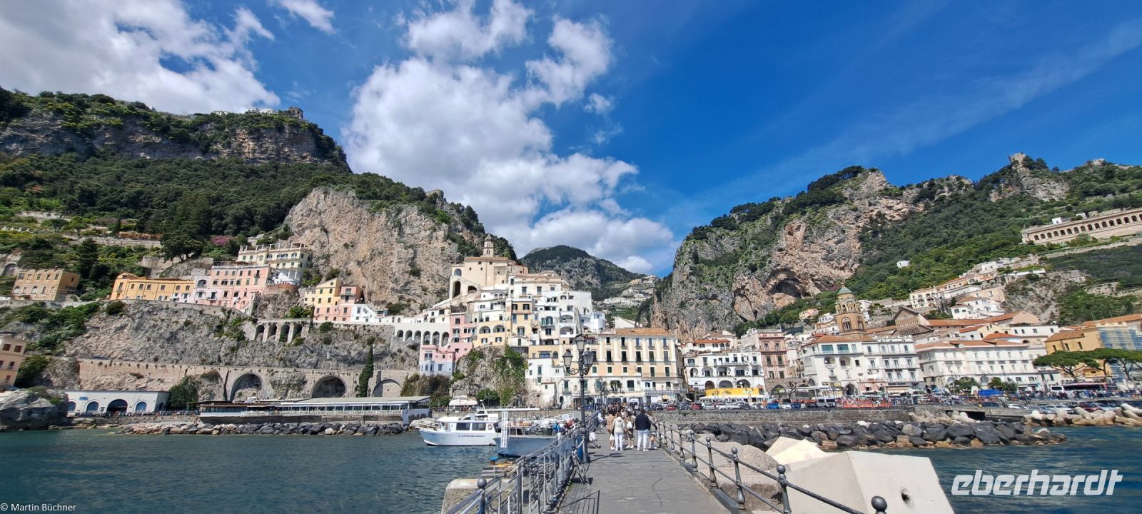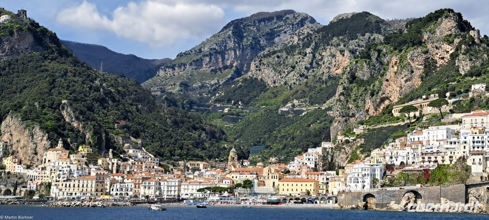 Die 50 km lange Amalfitana – Staatsstraße 136 – wurde bereits 1850 dem Verkehr übergeben. Die Landschaft, die Städte, die Menschen sprechen für sich. In Amalfi bleibt Zeit für einen Rundgang. Wer erwartet hier so einen mächtigen und imposanten Dom, der dem Heiligen Andreas gewidmet ist (Andreaskreuze sind überall gegenwärtig)? Es unterstreicht die Mächtigkeit der Seerepublik Amalfi, die besonders im 10. Und 11. Jh. existiert hat.