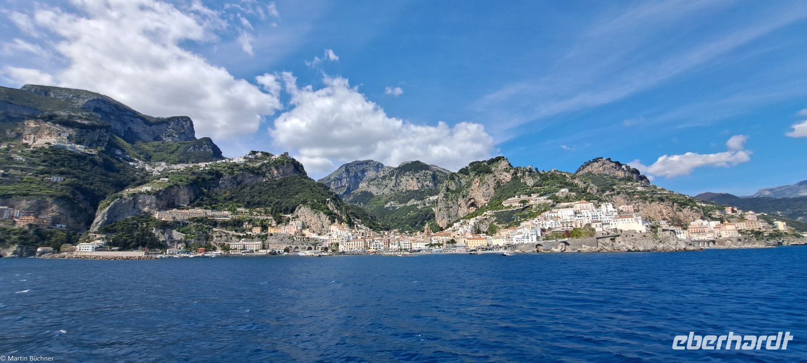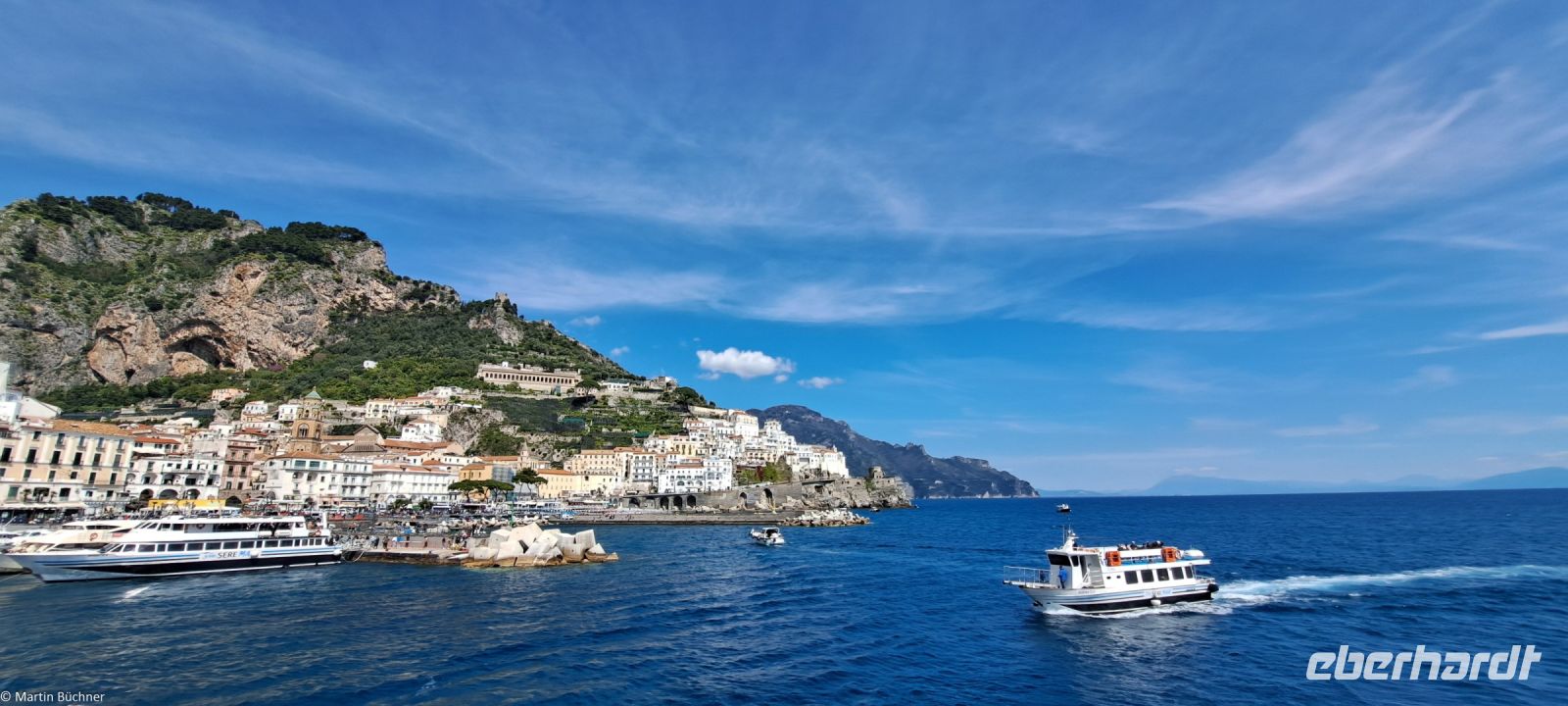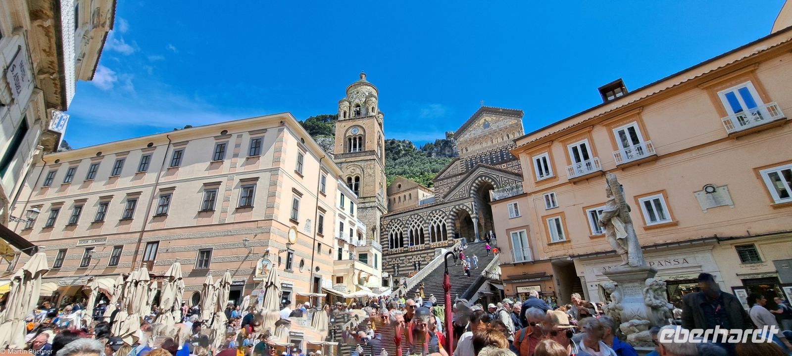 Die 50 km lange Amalfitana – Staatsstraße 136 – wurde bereits 1850 dem Verkehr übergeben. Die Landschaft, die Städte, die Menschen sprechen für sich. In Amalfi bleibt Zeit für einen Rundgang. Wer erwartet hier so einen mächtigen und imposanten Dom, der dem Heiligen Andreas gewidmet ist (Andreaskreuze sind überall gegenwärtig)? Es unterstreicht die Mächtigkeit der Seerepublik Amalfi, die besonders im 10. Und 11. Jh. existiert hat.