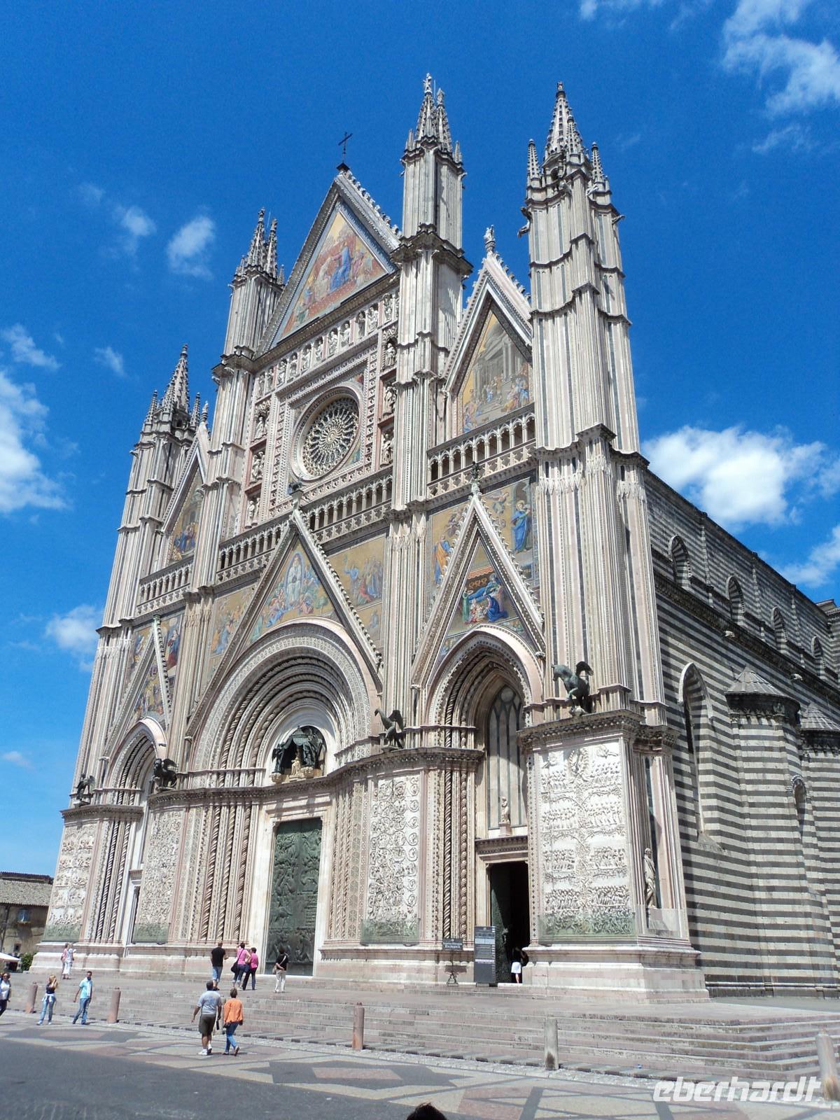 Der erste Ausflug beginnt auf dem Parkplatz von Orvieto. Wir fahren per Rolltreppe und Funiculare in die Stadt, die hoch auf einem Tuffsteinfelsen gebaut wurde und in ihrem Dom das Tuch mit dem Blut Christi aufbewahrt, das der Sage nach Brot und Wein als Abendmahlsgabe bestätigt.