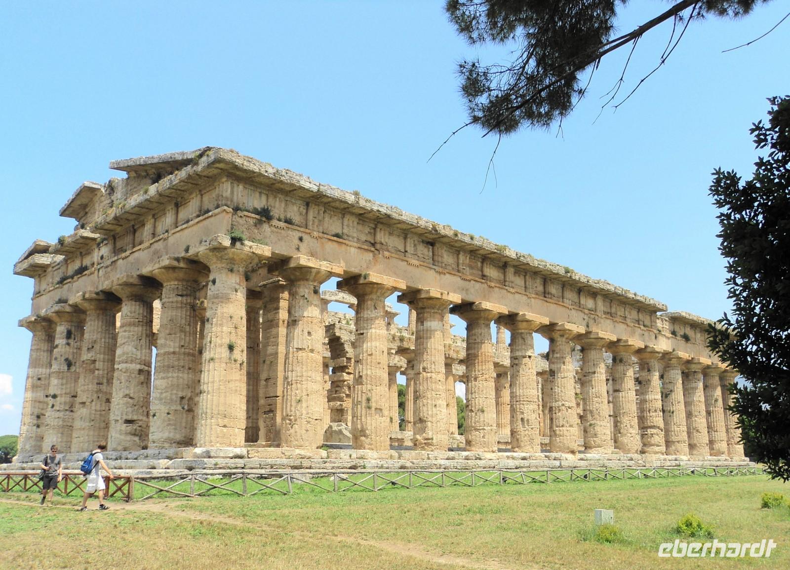 Der letzte Tag unserer Reise führt uns nach Paestum. Zuerst besuchen wir eine vollautomatische Büffelfarm. So etwas hat noch niemand gesehen. Die Tiere können über ihre Lebensweise völlig frei entscheiden, z.B. wann sie in die Melkanlage gehen, oder sich abbürsten lassen. Die Herstellung der Büffel-Mozzarella ist dann wieder Handarbeit. Der Geschmack ist unvergleichlich, auch Eis und Jogurt gibt es aus Büffelmilch und wir lassen es uns schmecken.