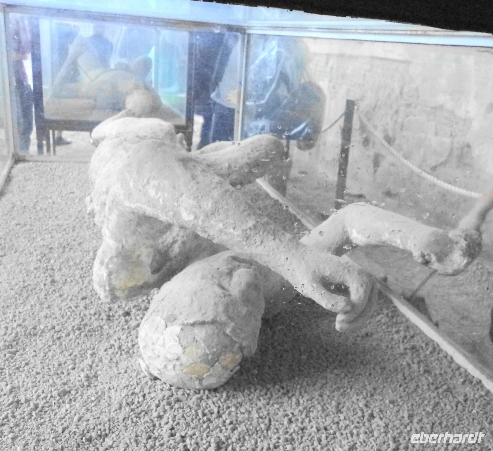 Der Mittwoch fängt mit Regen an und das Wetter bleibt leider auch den ganzen Tag regnerisch. Pompeji ist unser nächstes Ziel. Trotz, oder gerade wegen des Regens beeindrucken die Ruinen dieser alten Stadt, besonders die in Gips ausgegossenen Menschen mit schmerzverzerrten Gliedern lassen uns die Tragödie nachempfinden, die der Vesuv hier angerichtet hat.