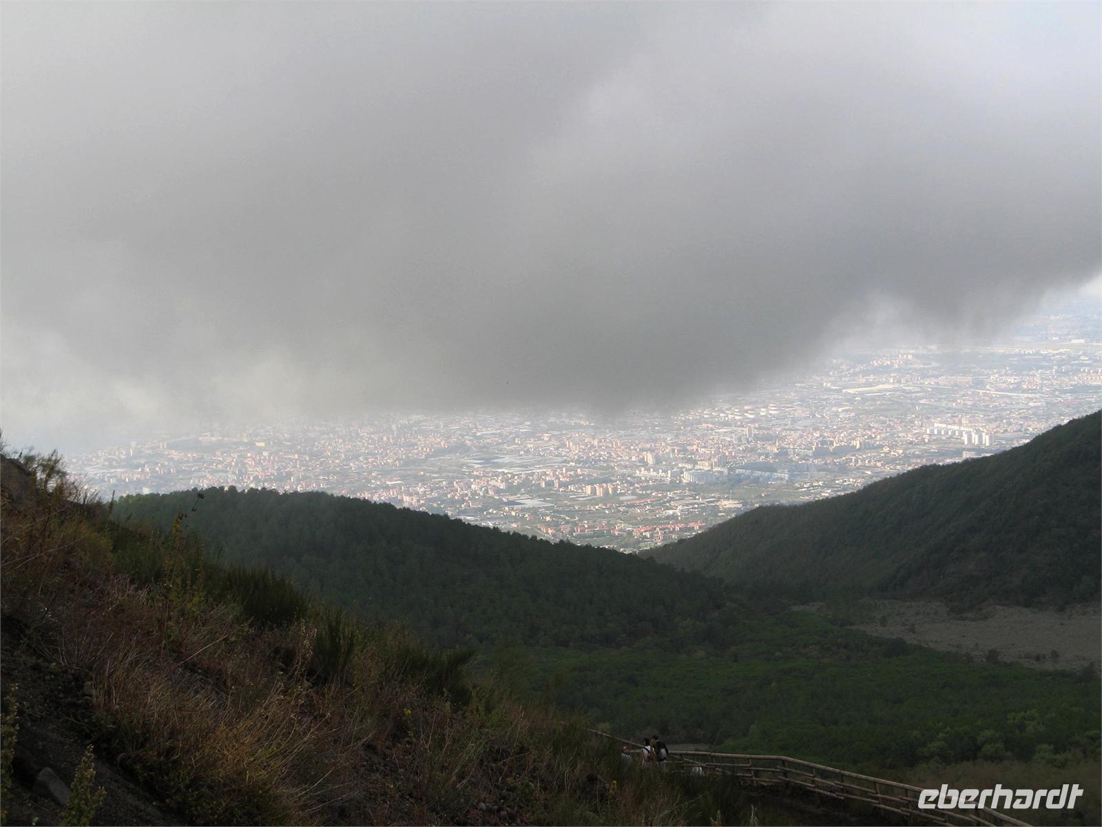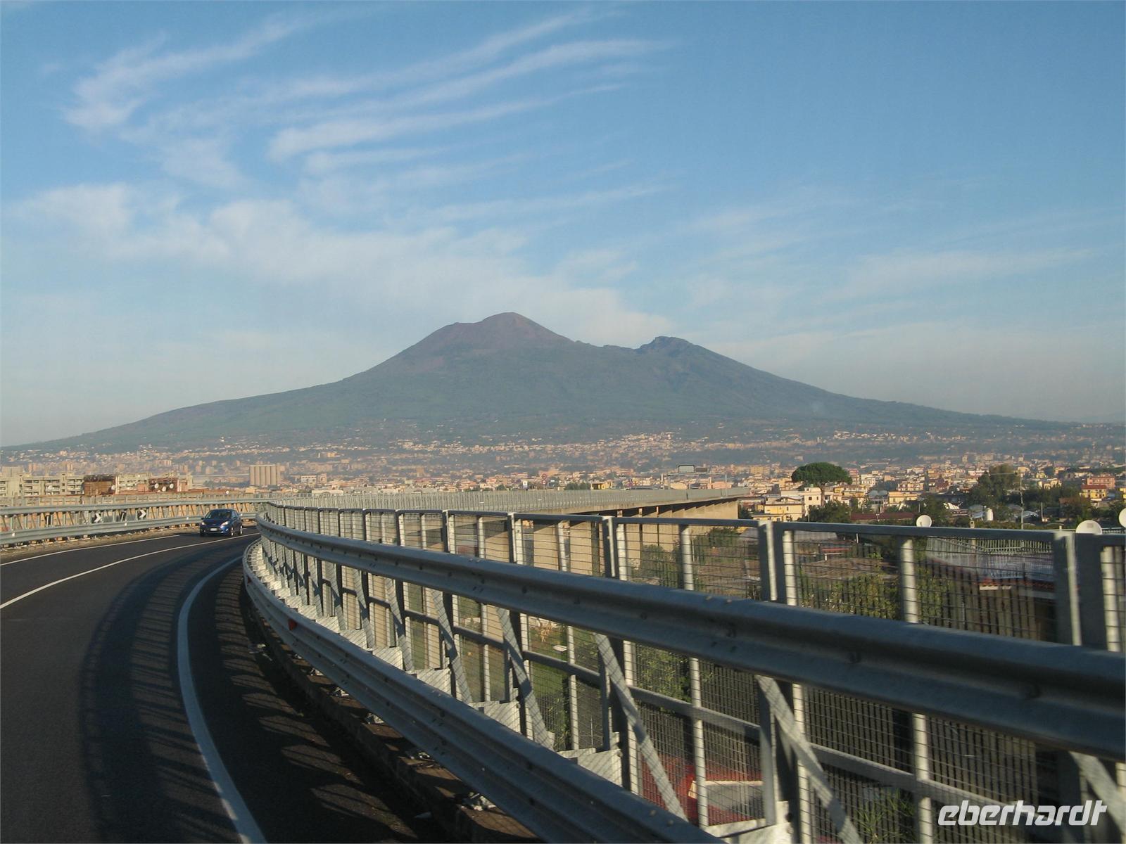 8 Uhr ging es mit unserem Bus wieder über die GRA zur Strada del Sole und weiter in den Süden, nach Kampanien, vorbei am Kloster Montecassino. Für eine Besichtigung war aber heute keine Zeit, wir wollten auf den Vesuv. Unterwegs ging schon wieder ein Schauer nieder und es sah recht dunkel aus, doch bald wurde es wieder heller und wir konnten gefahrlos den Weg auf den Vesuv antreten. Bei der Auffahrt konnten wir herrliche Blicke auf den Golf von Napoli werfen. Bis auf 1017 m Höhe brachte uns der Bus und wir hatten 1,5 Stunden Zeit, den Krater auf einem Spazierweg zu erkunden. Leider waren die Wolken recht niedrig, so dass wir dann keine freie Aussicht mehr über den Golf hatten. Anschließend wollten wir die uns angebotenen Würstchen verzehren, doch da Günter den Motor nicht anlassen durfte, gab es heute Kaltverpflegung!