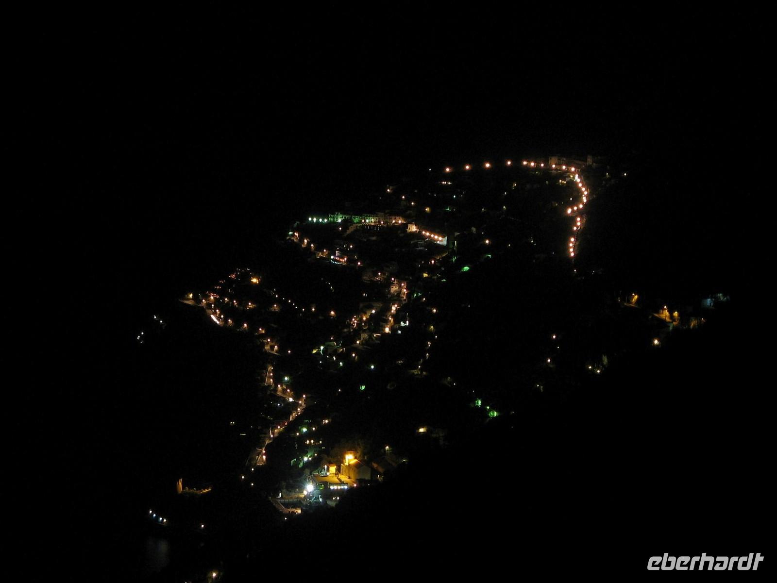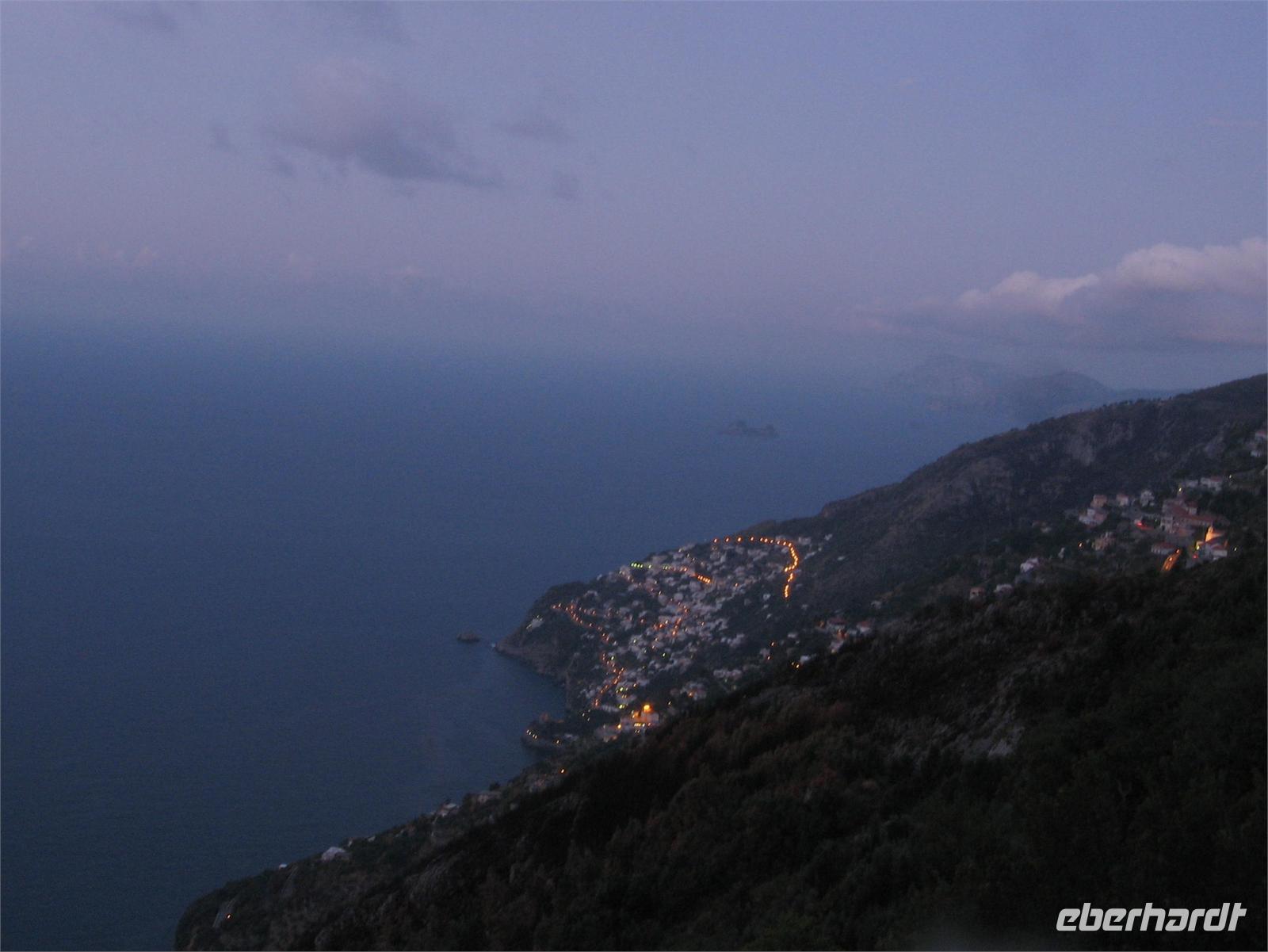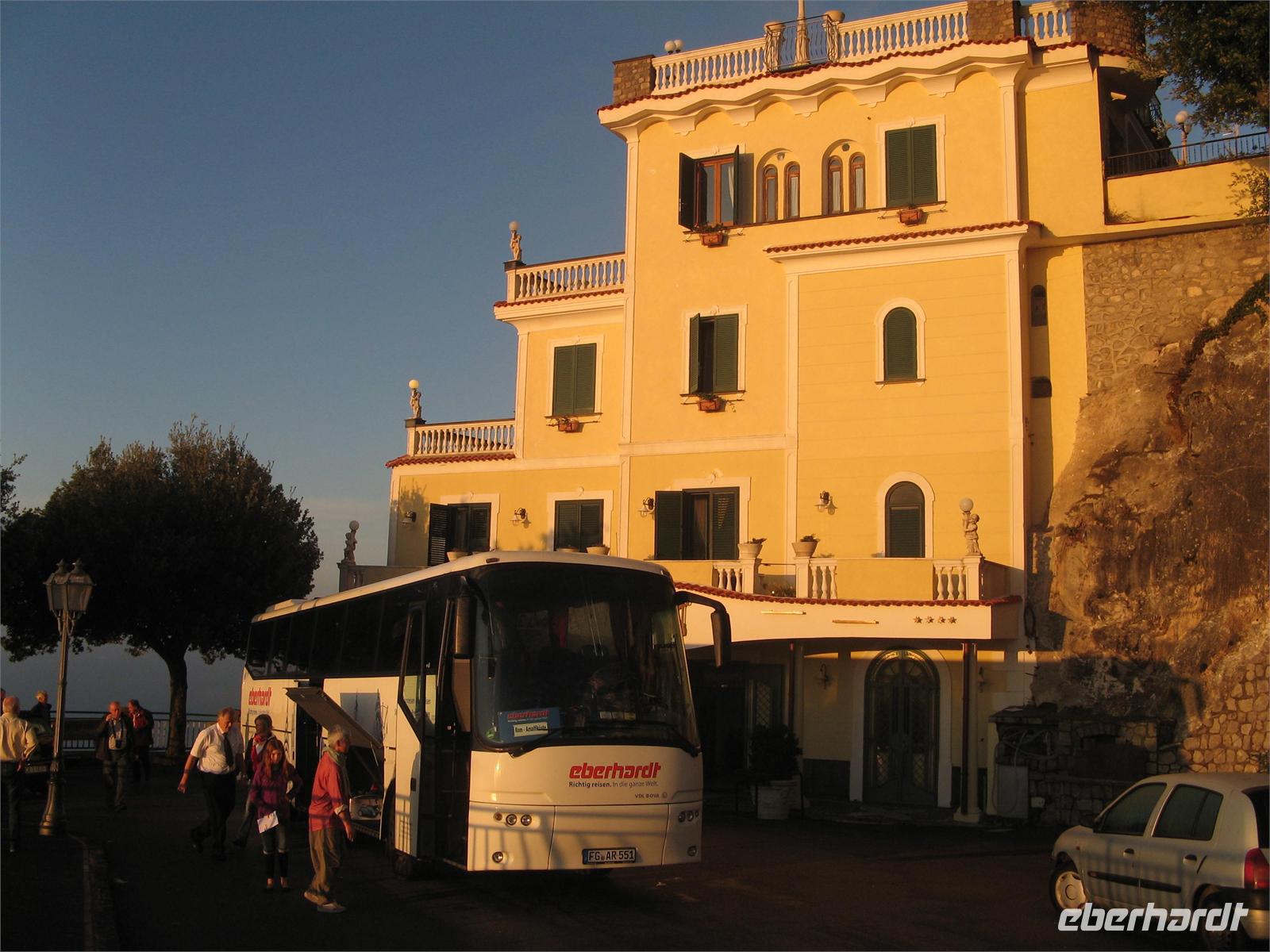 Dann fuhren wir wieder hinab nach Pompeji. Unser Führer Angelo zeigte uns die archäologischen Ausgrabungen und wir bekamen umfangreiche Informationen, um uns ein Bild vom Leben in der Stadt im 1.Jh zu machen. Wir hatten noch etwas Zeit für Postkarten ...und der Bus brachte uns zu unserem Hotel in Agerola. Eine lange Auffahrt hinauf in die Milchberge, eine Fahrt durch den Tunnel - und wir waren auf der Südseite der Sorrentinischen Halbinsel, in Agerola, und gespannt auf unser Hotel. Petra hatte uns neugierig gemacht! Als wir dann schon glaubten, die Straße nehme kein Ende - da erwartete uns unser Grand-Hotel Sant Orsola, direkt am Abhang in 610 m Höhe oberhalb der Amalfitana, mit einem Traumblick auf die Lichter unter uns, denn leider war es aber schon dunkel! Herzlich wurden wir von Stefano begrüßt.