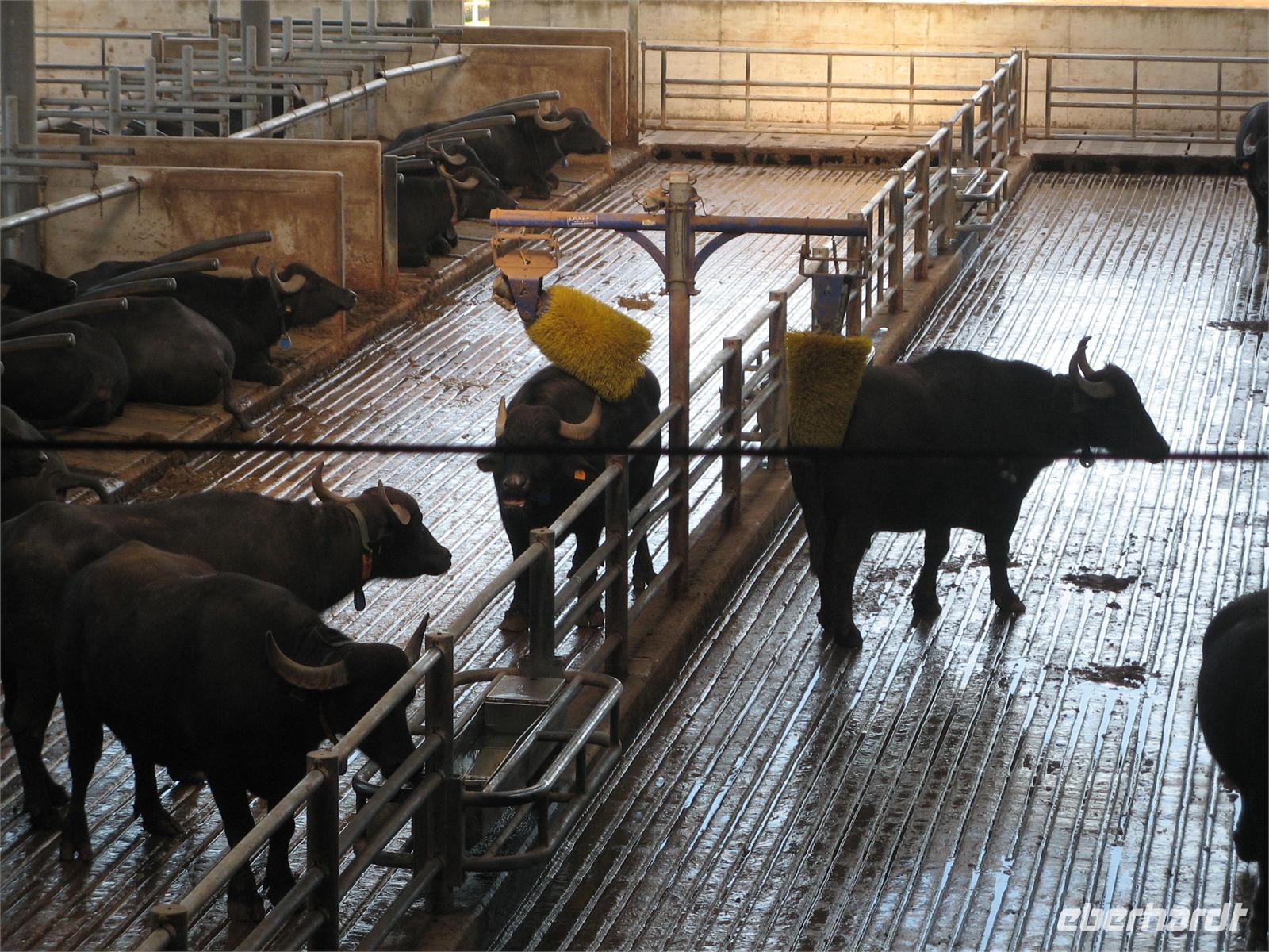 Zuerst besuchten wir die biologische Büffelfarm Vanullo. Interessant, zu hören und zu sehen, wie die Büffel gehalten werden, wie sie freiwillig in den vollautomatischen Melkstand gehen, wie sie Schlange stehen, um sich den Rücken mit Genuss von rotierenden Bürsten schruppen zu lassen.