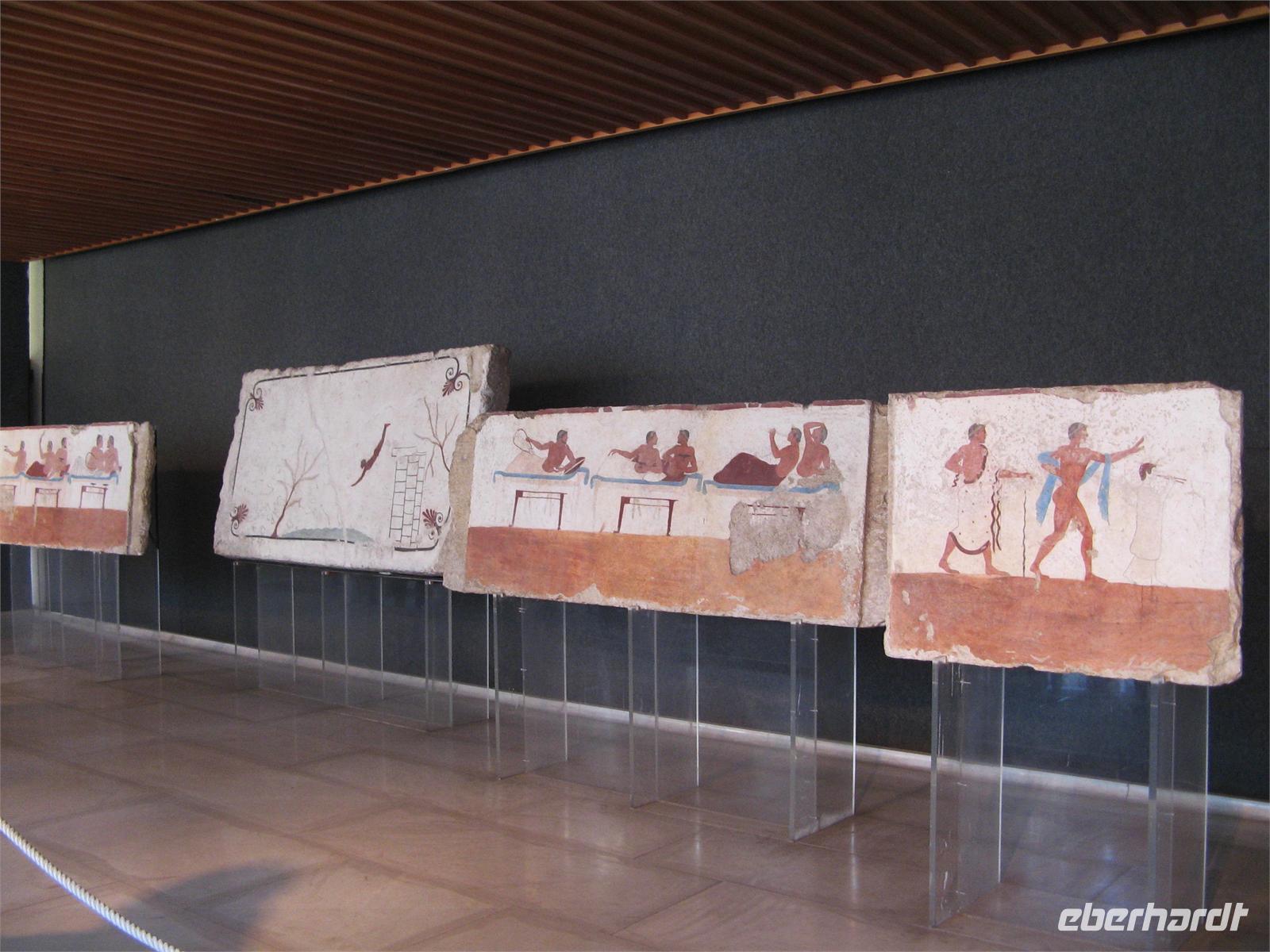 Nach der Mittagspause besuchten wir die Weltkulturerbestätte Paestum, Ruinen von 3 großen dorischen Tempeln. Angelo führte uns noch ins Museum, das eine bedeutende Sammlung griechischer Altertümer zeigt, Fundstücke aus der Umgebung von Paestum. Beeindruckend waren bemalte Steinplatten, die als Sargdeckel oder -seitenwände dienten, wie die Darstellungen aus dem Grab des Turmspringers, wo der Übergang vom Leben in das Totenreich als Sprung in das Wasser gedeutet wird. Über die Autobahn ging es wieder zurück nach Agerola.