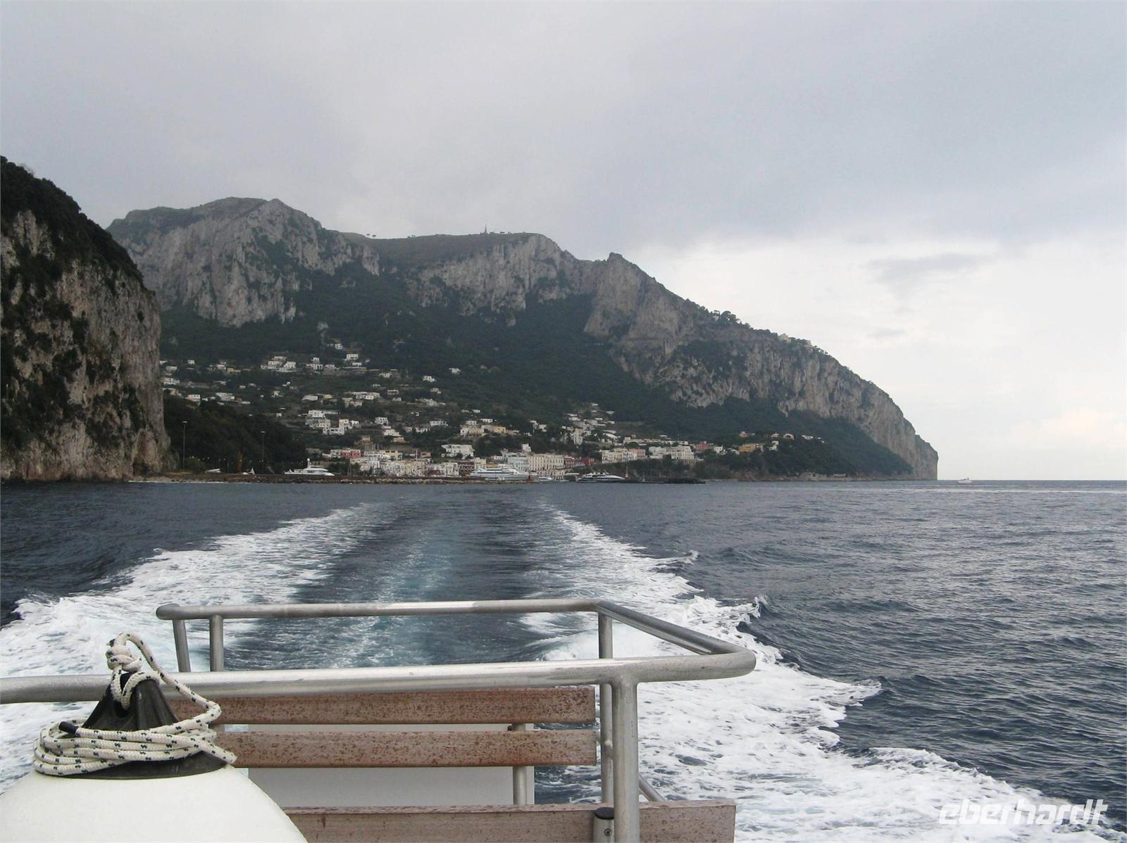 Heute fuhr uns unser Busfahrer Günter nach Sorrent. Fast alle Gäste nahmen an dem fakultativen Ausflug nach Capri teil, wäre ja auch schade, dass zu verpassen. Fotostopp am Golf von Sorrent! Mit unserer Insel- Führerin Daggy ging es mit dem Schiff nach Capri, wo unsere Gruppe im Hafen schon ein Boot erwartete und uns um die Insel herum schaukelte. Heute gab es ein paar Wellen, und die Sonne zeigte sich auch nicht, im Gegenteil, es nieselte sogar etwas. Natalia zeigte uns die Schönheiten der Insel, Schildkröte, Elefant, die Grotten mit ihren orangefarbenen „Korallen", die Faraglioni-Inseln, durch die wir auch hindurchfuhren, mit der Empfehlung, sich zu küssen, denn das bringt Glück!