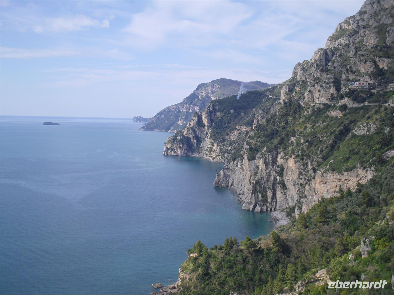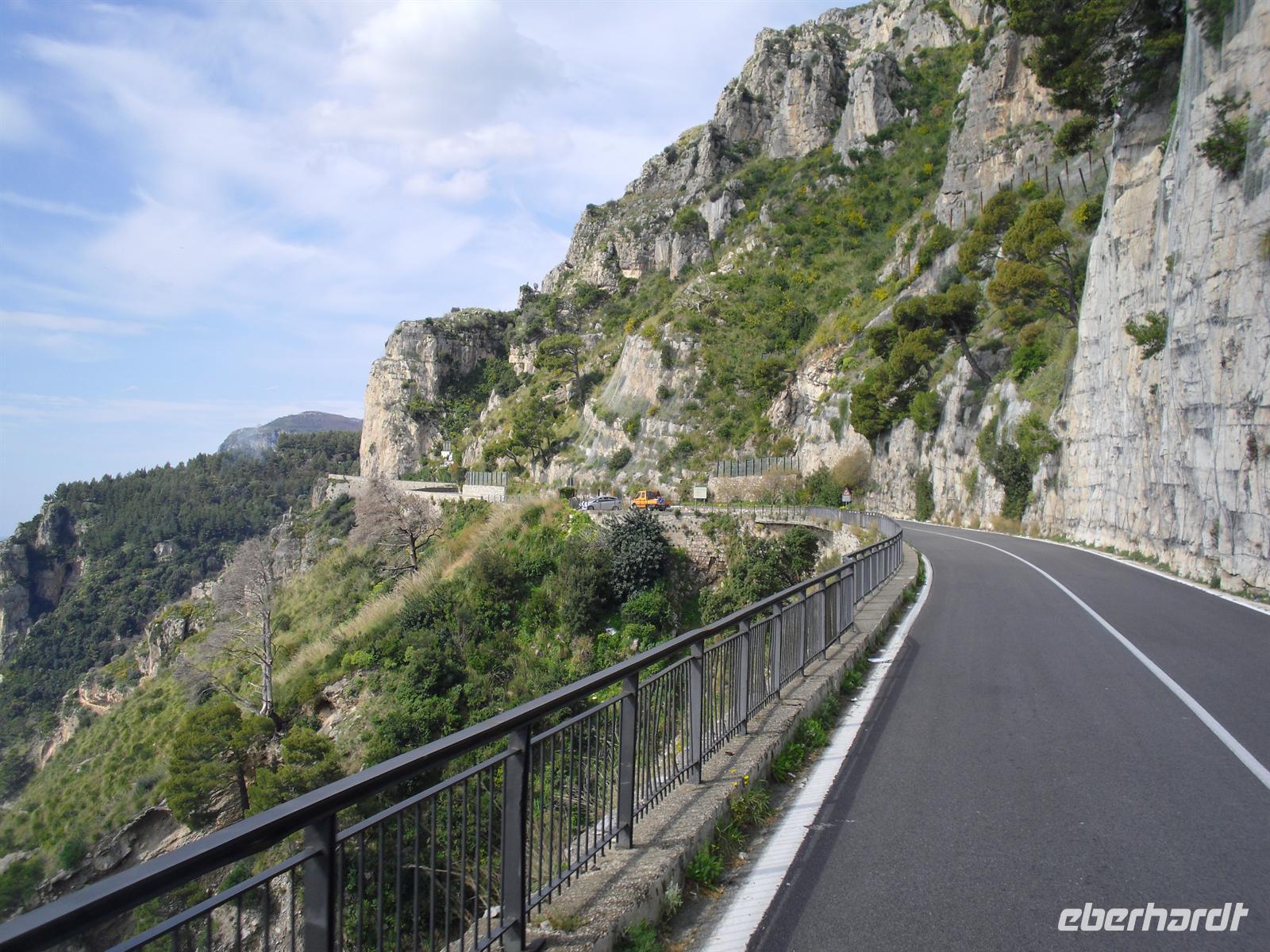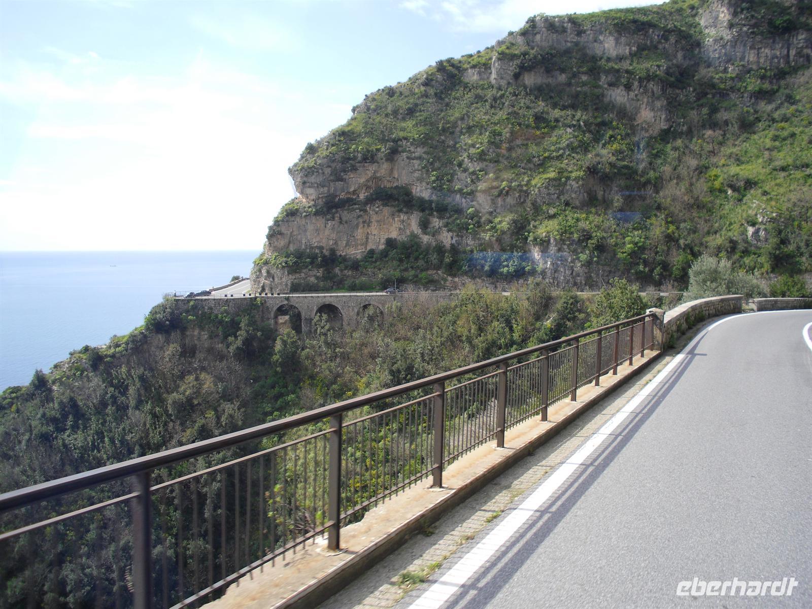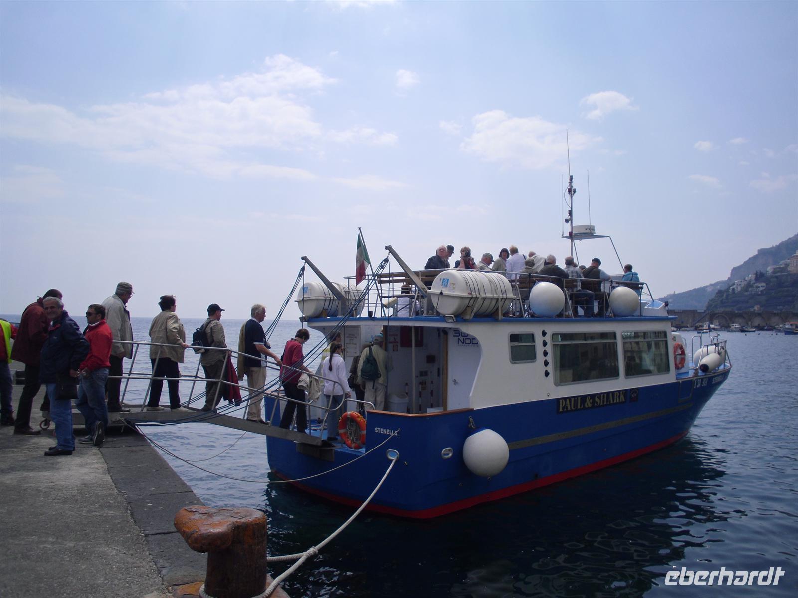 Da unser Bus nicht auf der Amalfiküstenstrasse fahren darf (er ist mit 12 Metern Länge nicht zugelassen), fahren wir heute mit einem einheimischen Bus auf einer der schönsten Küstenstraßen Italiens - die Straße ist streckenweise in die fast senkrecht abbrechende Felsküste eingehauen. Wir machen Fotostopps, um einfach das Flair der Küste zu genießen. Außerdem haben wir Glück, der Wettergott meint es heute auch nicht schlecht mit uns.