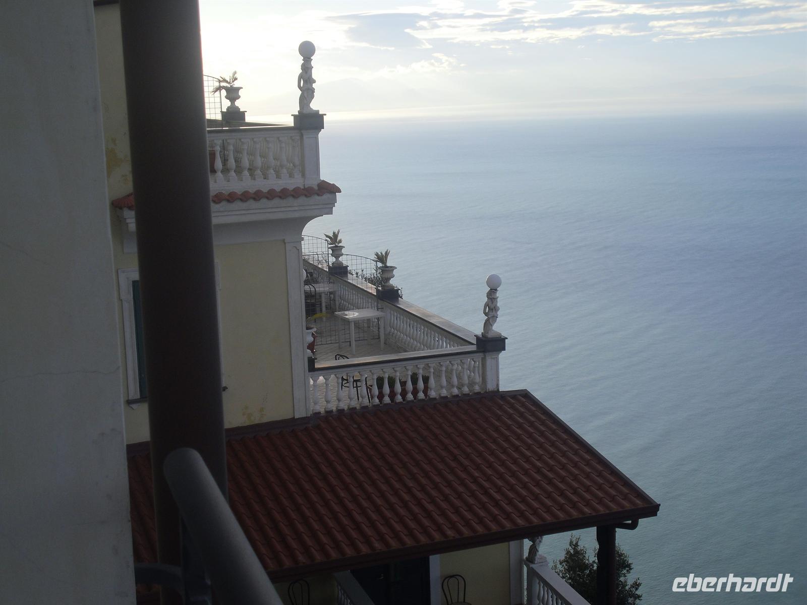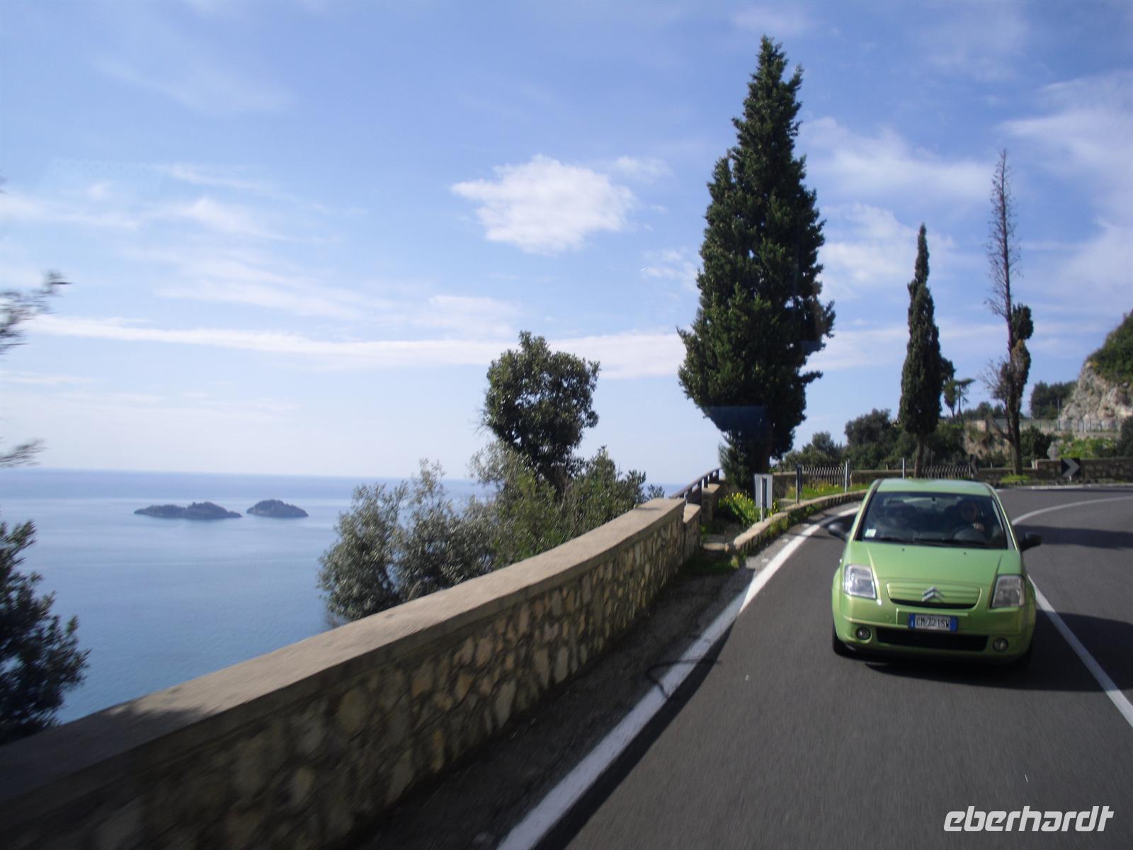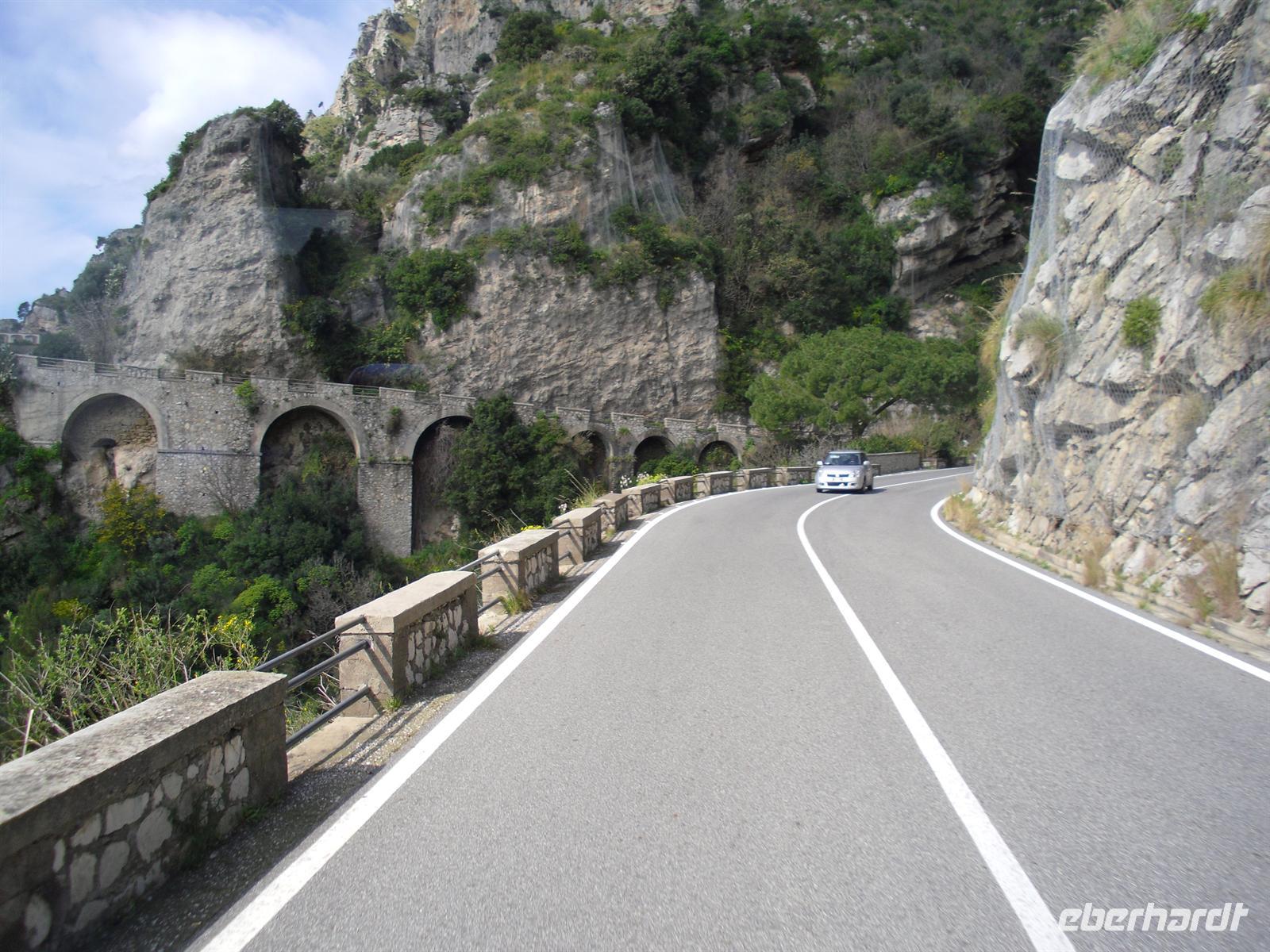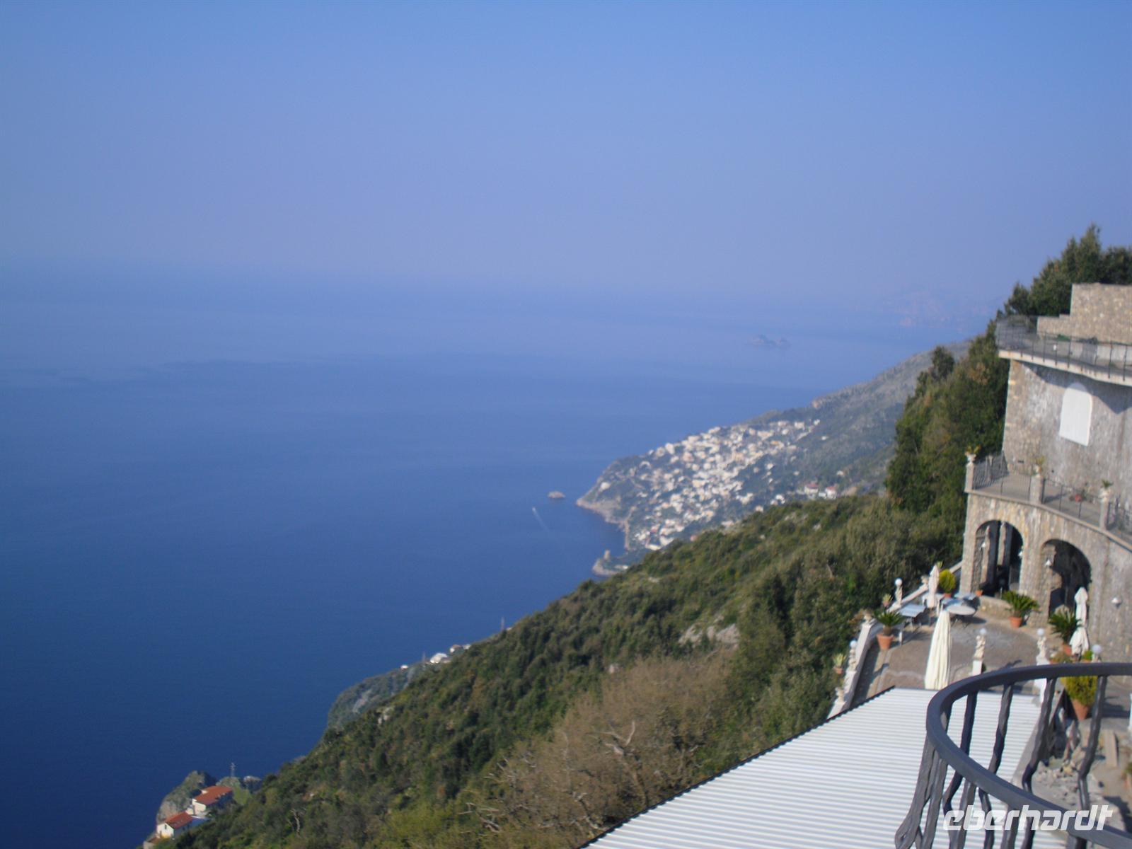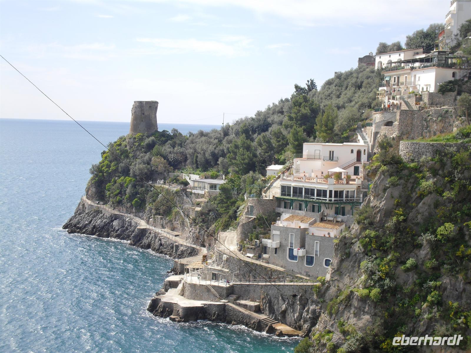 Da unser Bus nicht auf der Amalfiküstenstrasse fahren darf (er ist mit 12 Metern Länge nicht zugelassen), fahren wir heute mit einem einheimischen Bus auf einer der schönsten Küstenstraßen Italiens - die Straße ist streckenweise in die fast senkrecht abbrechende Felsküste eingehauen. Wir machen Fotostopps, um einfach das Flair der Küste zu genießen. Außerdem haben wir Glück, der Wettergott meint es heute auch nicht schlecht mit uns.