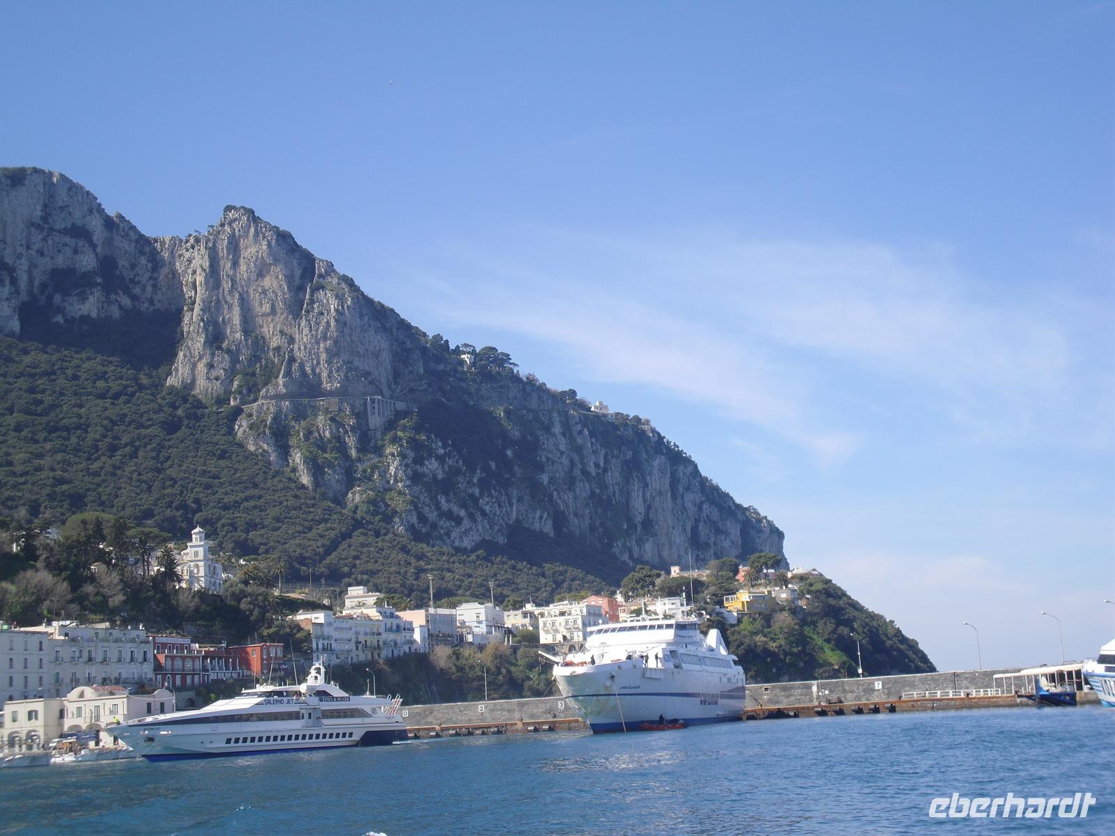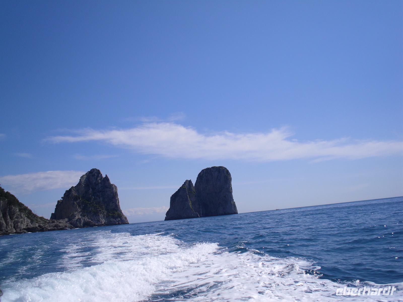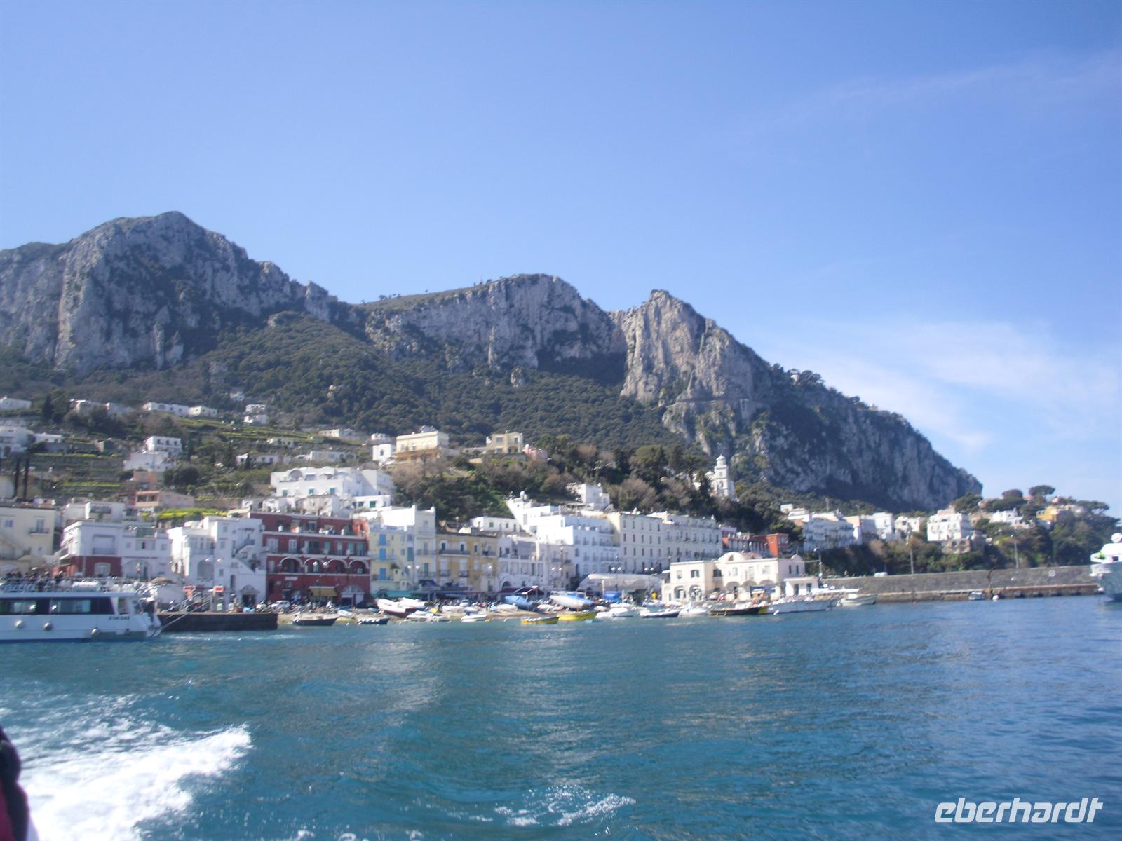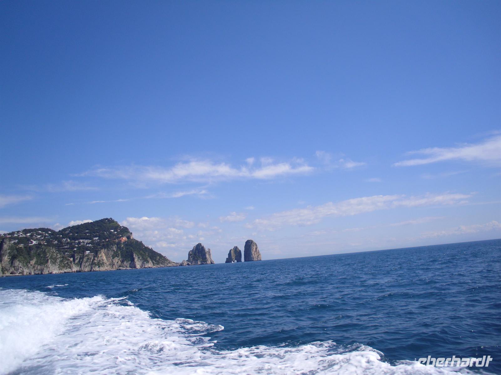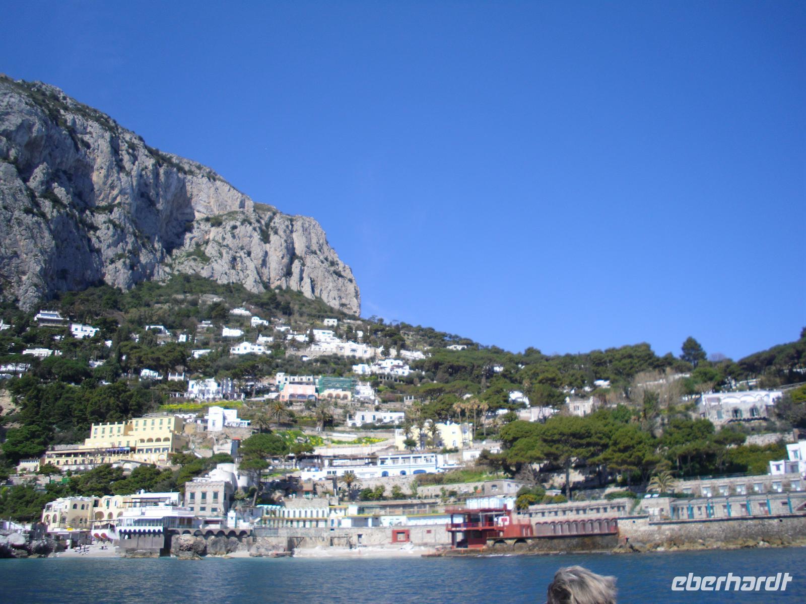 Schon von weitem türmt sich die Insel wie unzugänglich auf. Zwei durch einen geschwungenen Sattel verbundenen Hochebenen, auf denen die Orte Capri und Anacapri liegen, ineinandergeschachtelte Häuserkuben, überragt von gekalkten und buntgekachelten Kuppeln. Für uns ist klar - Capri ist der Kontrast zwischen intensivem Blau des Meers, den strahlend weißen Felswänden und dem tiefen Grün der Vegetation. Wir unternehmen eine Schifffahrt rund um die Insel - die Ausblicke faszinieren uns, schließlich haben wir ganz gutes Wetter erwischt! Unsere örtliche Reiseleiterin Dagy erzählt uns so manch nette Episode über die Insel. Bis auf einige Jahrhunderte, als die Präsenz von Piraten Vergnügungsreisen auf die Insel verbot, war Capri seit den Tagen des Augustus Ziel meist betuchter Reisender. Vielen gefiel die Kalkklippe im Meer so gut, dass sie zu Einheimischen wurden.