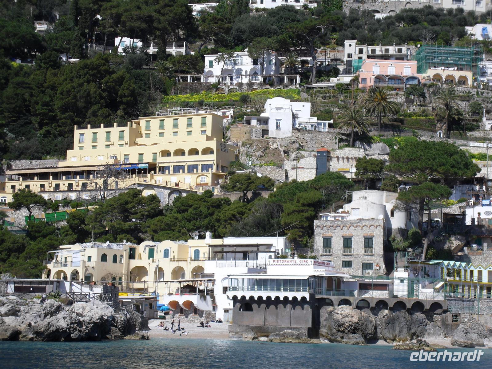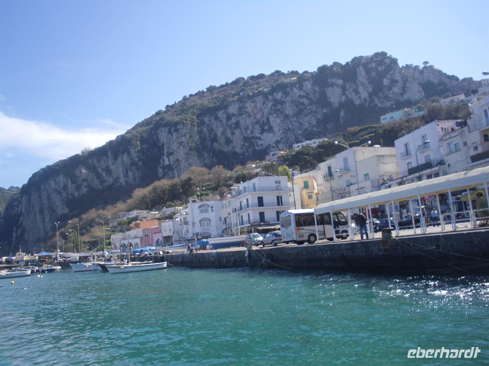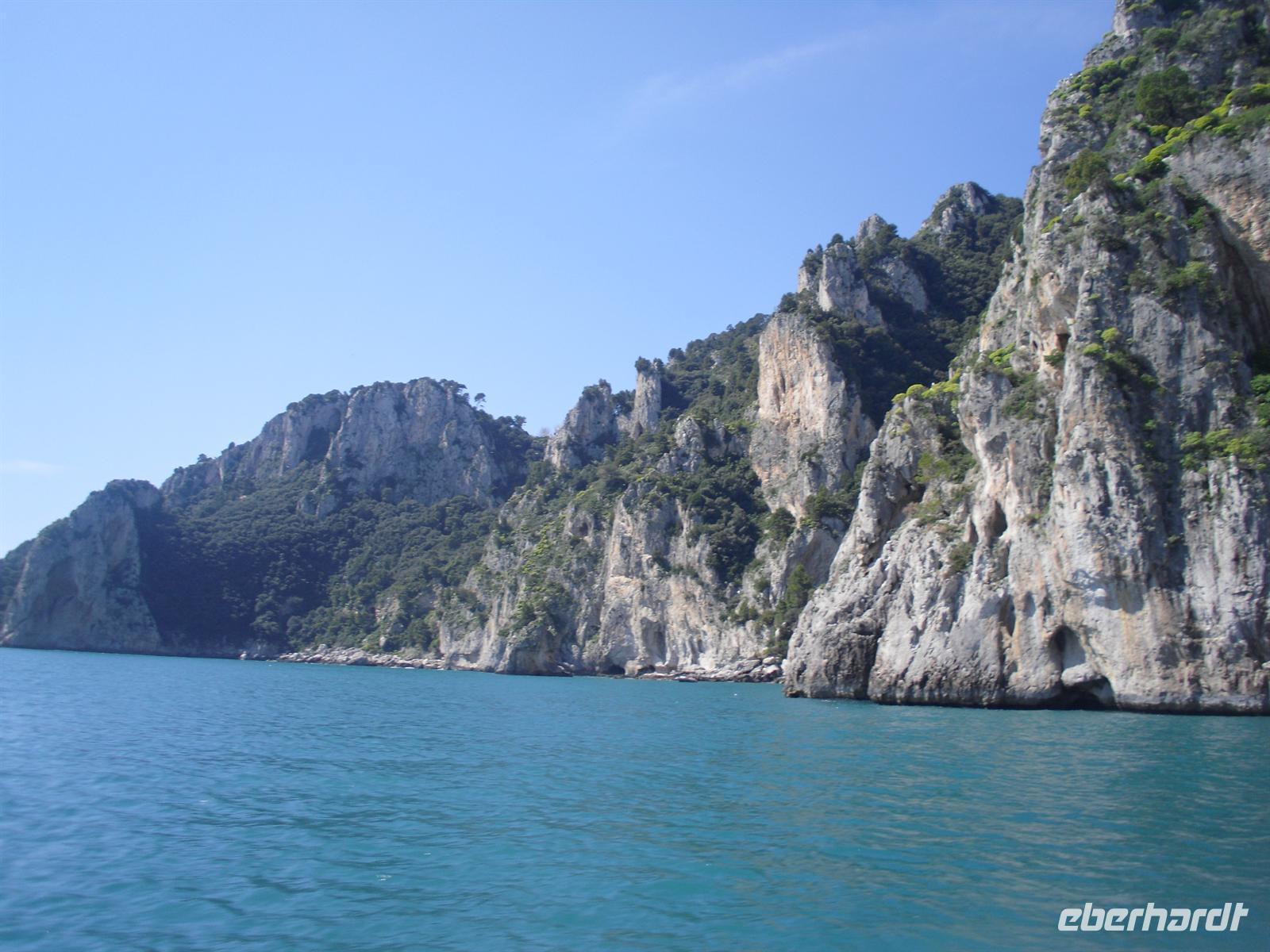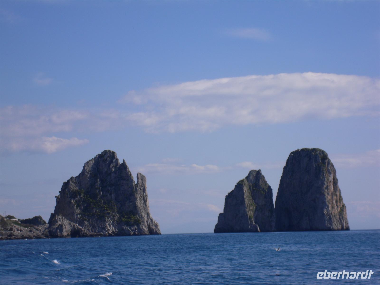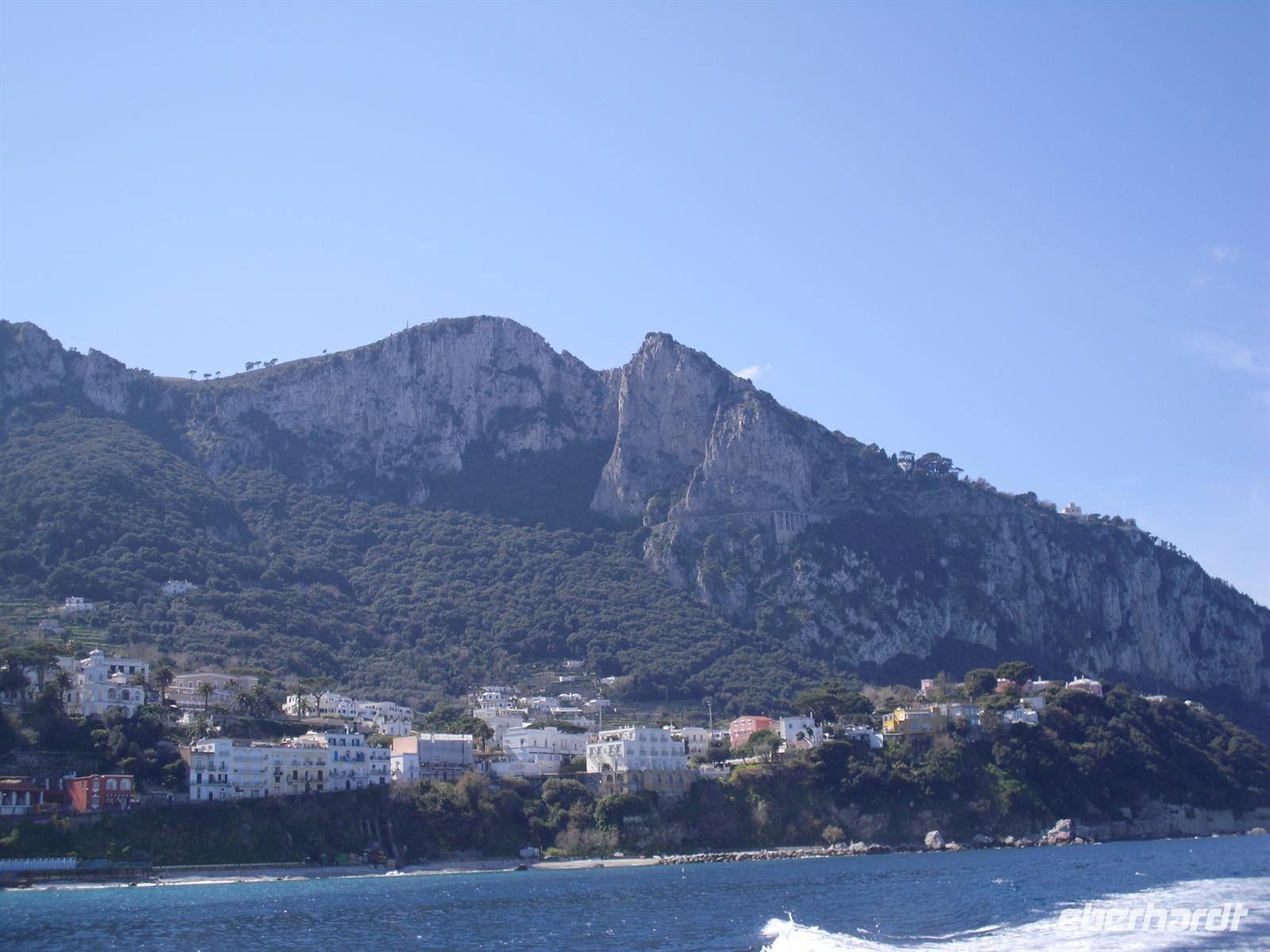 Schon von weitem türmt sich die Insel wie unzugänglich auf. Zwei durch einen geschwungenen Sattel verbundenen Hochebenen, auf denen die Orte Capri und Anacapri liegen, ineinandergeschachtelte Häuserkuben, überragt von gekalkten und buntgekachelten Kuppeln. Für uns ist klar - Capri ist der Kontrast zwischen intensivem Blau des Meers, den strahlend weißen Felswänden und dem tiefen Grün der Vegetation. Wir unternehmen eine Schifffahrt rund um die Insel - die Ausblicke faszinieren uns, schließlich haben wir ganz gutes Wetter erwischt! Unsere örtliche Reiseleiterin Dagy erzählt uns so manch nette Episode über die Insel. Bis auf einige Jahrhunderte, als die Präsenz von Piraten Vergnügungsreisen auf die Insel verbot, war Capri seit den Tagen des Augustus Ziel meist betuchter Reisender. Vielen gefiel die Kalkklippe im Meer so gut, dass sie zu Einheimischen wurden.