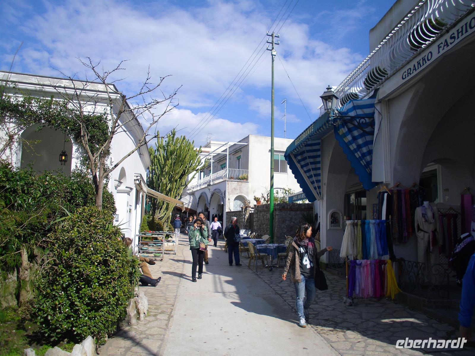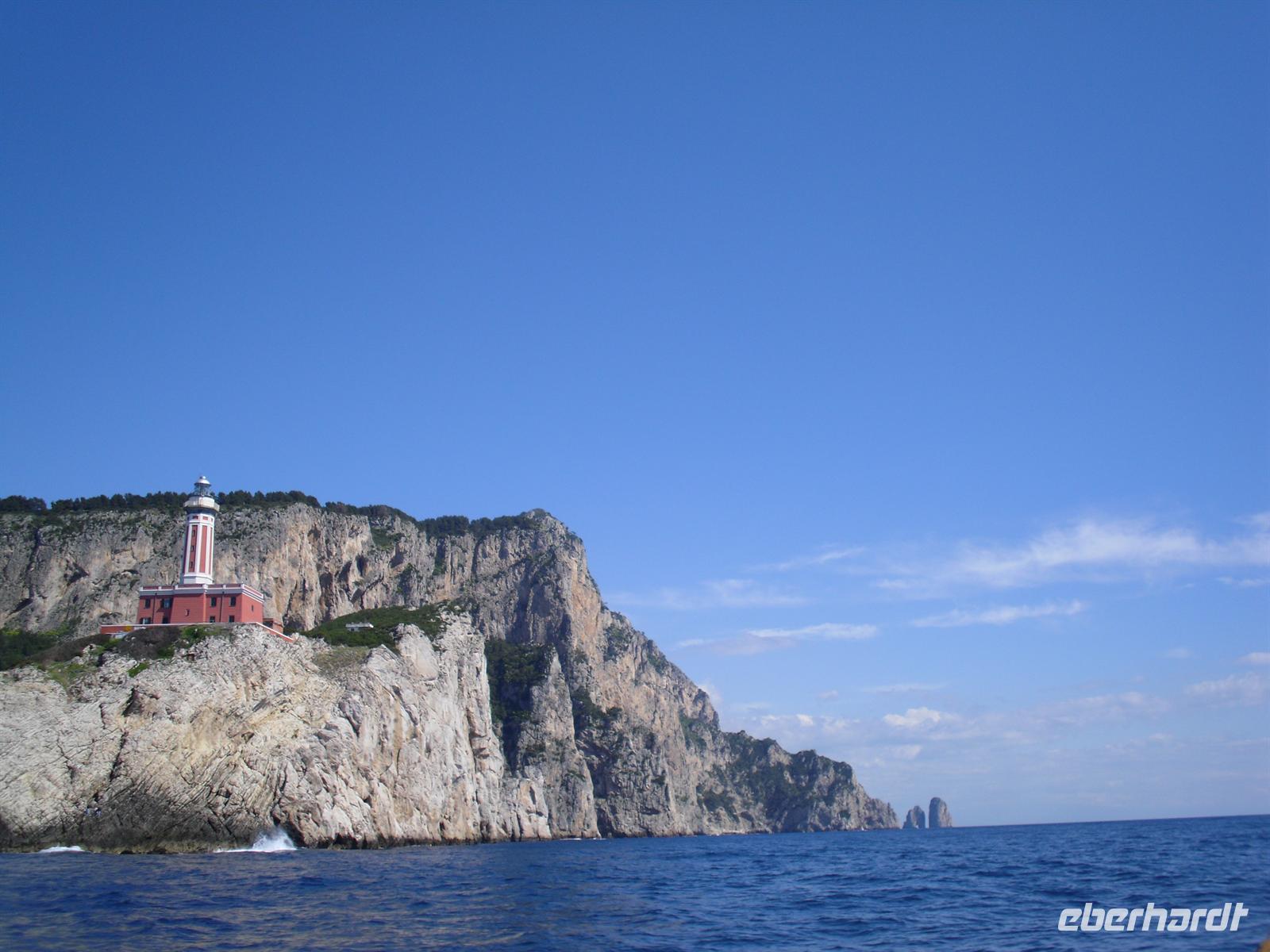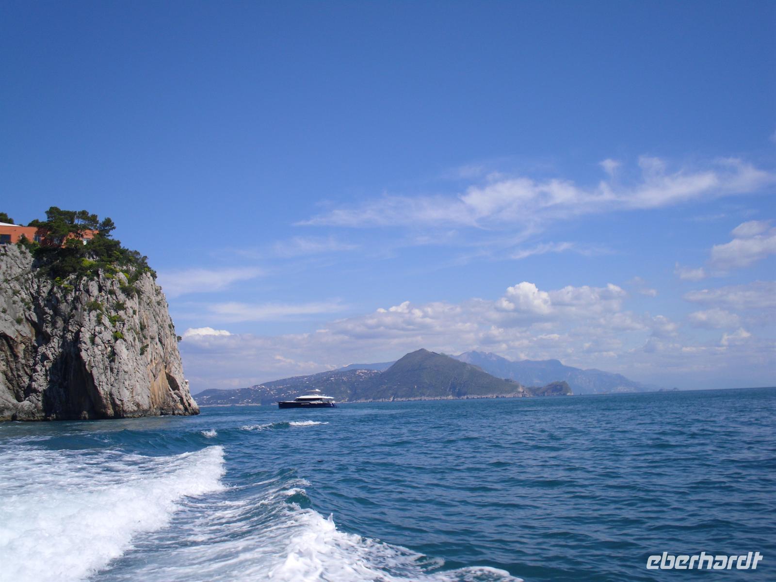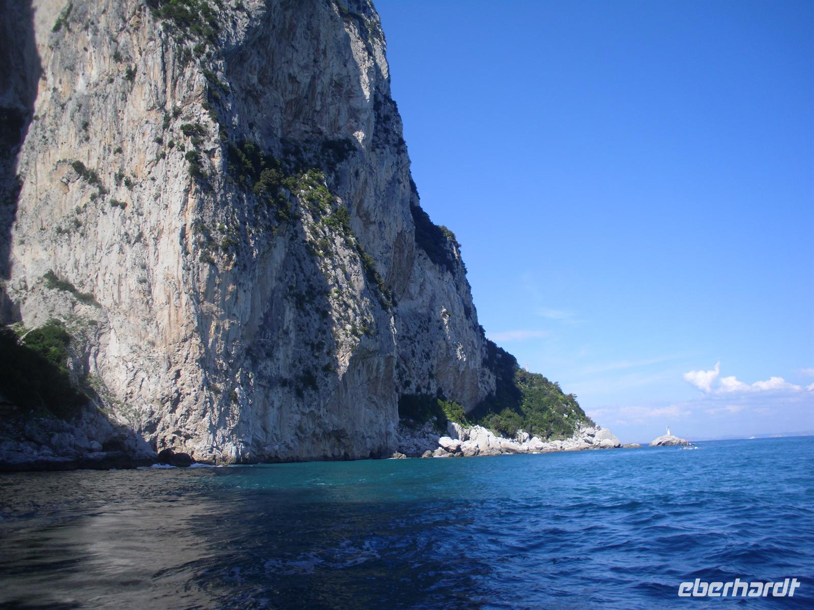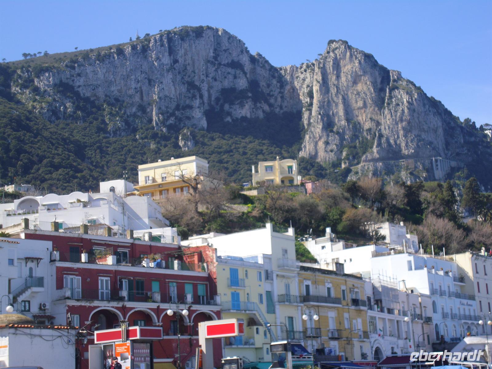 Schon von weitem türmt sich die Insel wie unzugänglich auf. Zwei durch einen geschwungenen Sattel verbundenen Hochebenen, auf denen die Orte Capri und Anacapri liegen, ineinandergeschachtelte Häuserkuben, überragt von gekalkten und buntgekachelten Kuppeln. Für uns ist klar - Capri ist der Kontrast zwischen intensivem Blau des Meers, den strahlend weißen Felswänden und dem tiefen Grün der Vegetation. Wir unternehmen eine Schifffahrt rund um die Insel - die Ausblicke faszinieren uns, schließlich haben wir ganz gutes Wetter erwischt! Unsere örtliche Reiseleiterin Dagy erzählt uns so manch nette Episode über die Insel. Bis auf einige Jahrhunderte, als die Präsenz von Piraten Vergnügungsreisen auf die Insel verbot, war Capri seit den Tagen des Augustus Ziel meist betuchter Reisender. Vielen gefiel die Kalkklippe im Meer so gut, dass sie zu Einheimischen wurden.