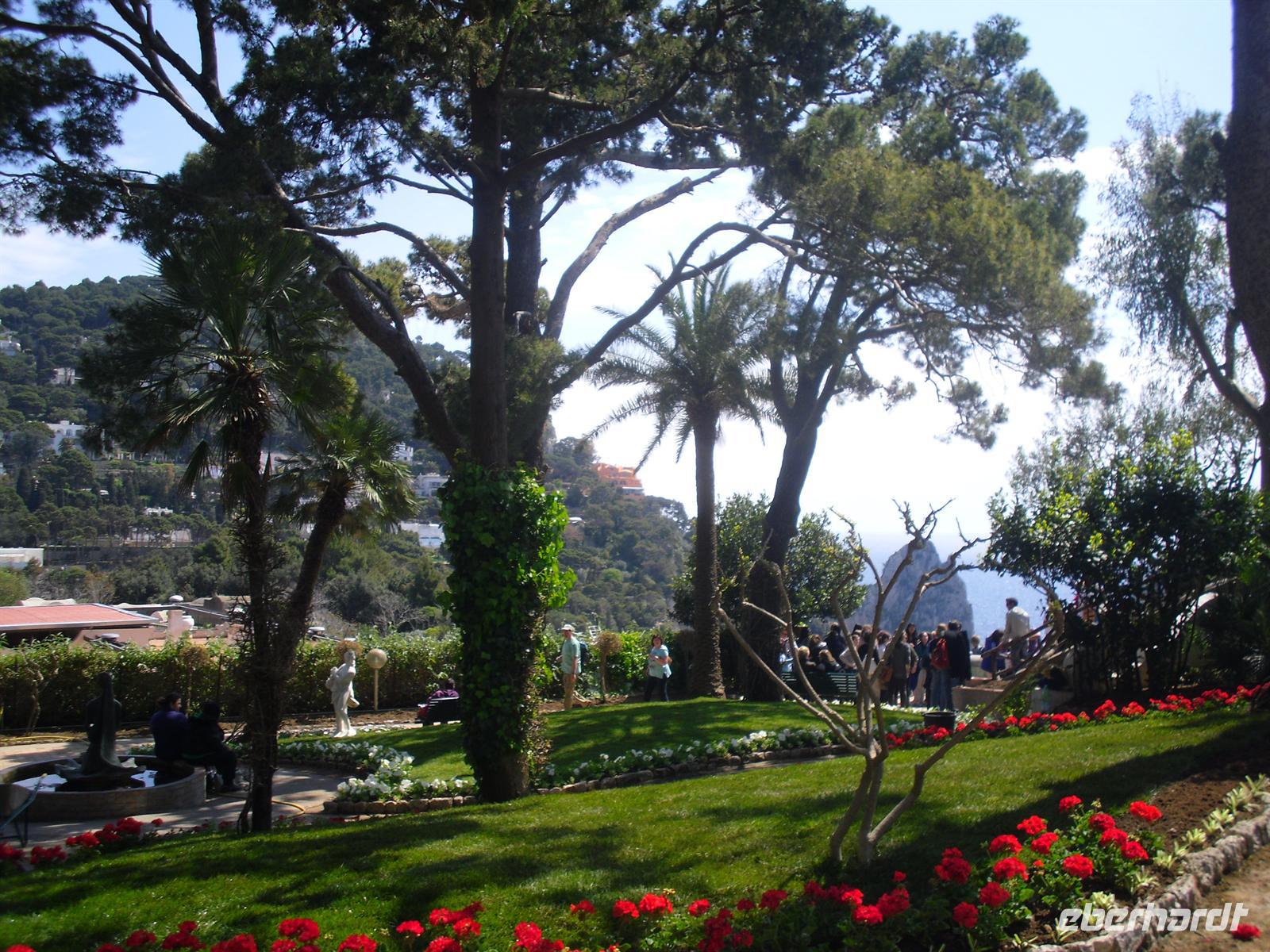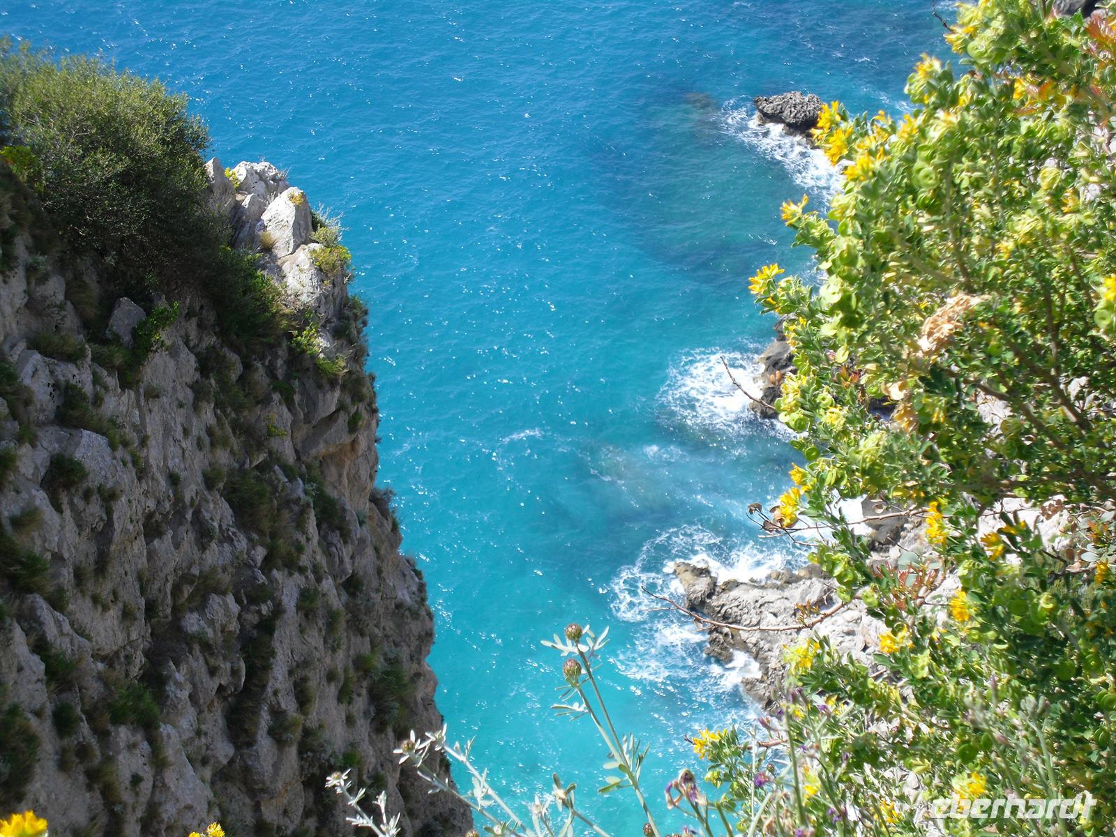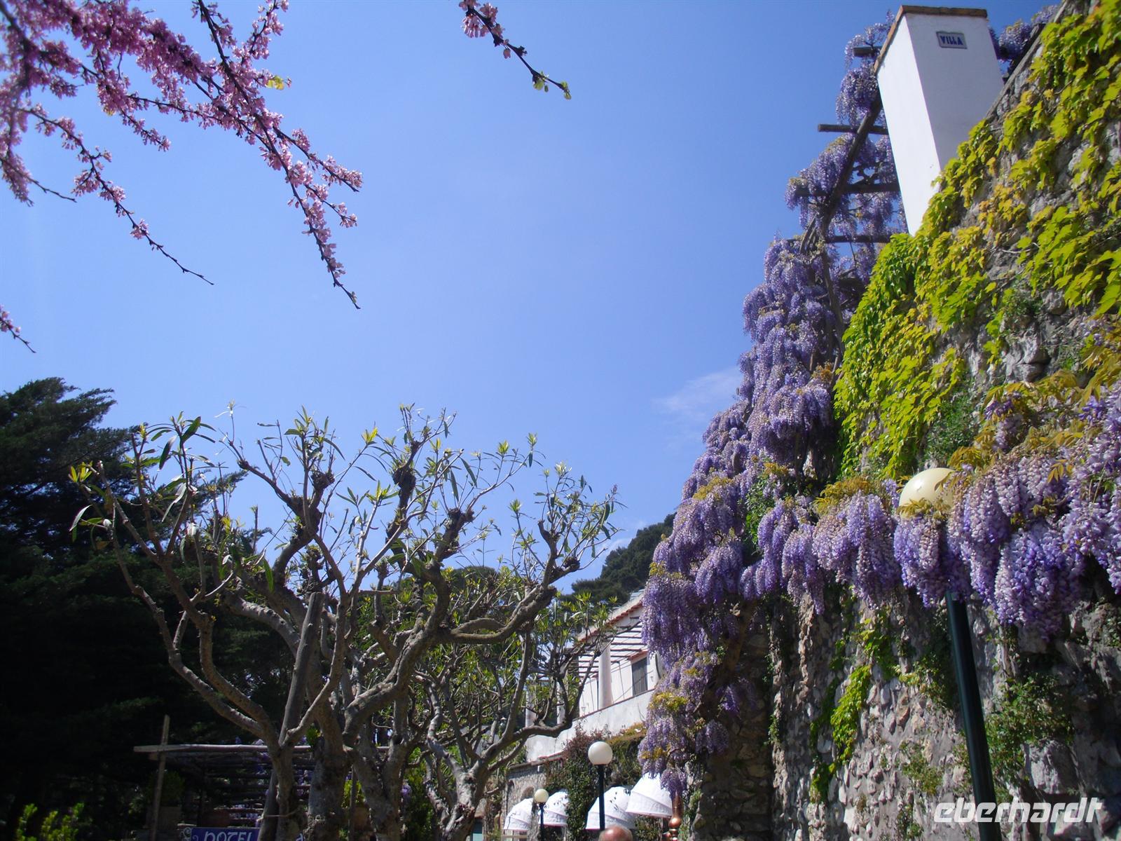 Der erste "Prominente", der auf die Insel ausstieg, war der Nachfolger des vergöttlichten Augustus, Kaiser Tiberius, der die Insel zu einer riesigen Privatvilla umbaute; Mauerreste sind übrigens zum Teil noch deutlich zu sehen. Capri ist heute für das Mittelmeergebiet ein Botanischer Garten, auf so engem Raum läßt sich sonst nirgends die Vielfalt der mittelmeerischen Pflanzenwelt beobachten. Rund 1.000 Arten sind es, davon 150, die nur auf der Insel Capri vorkommen! Für die Geologen sei erwähnt, dass Capri nur die Fortsetzung der amalfitanischen Halbinsel ist. Rund um die Insel sind über sechzig Höhlen und Grotten zu bewundern. Wir besuchen die beiden Inselorte, Capri und Anacapri - diese beiden Orte leben so lange man weiß in Fehde; sie hatten sich voneinander isoliert, erst die im letzten Jahrhundert geschaffene Straßenverbindung brachte eine Veränderung. Wir fahren in Minibussen auf den engen Strassen der Insel - sehr abenteuerlich! Am späten Nachmittag fahren mit der Fähre zurück auf das Festland nach Sorrent.