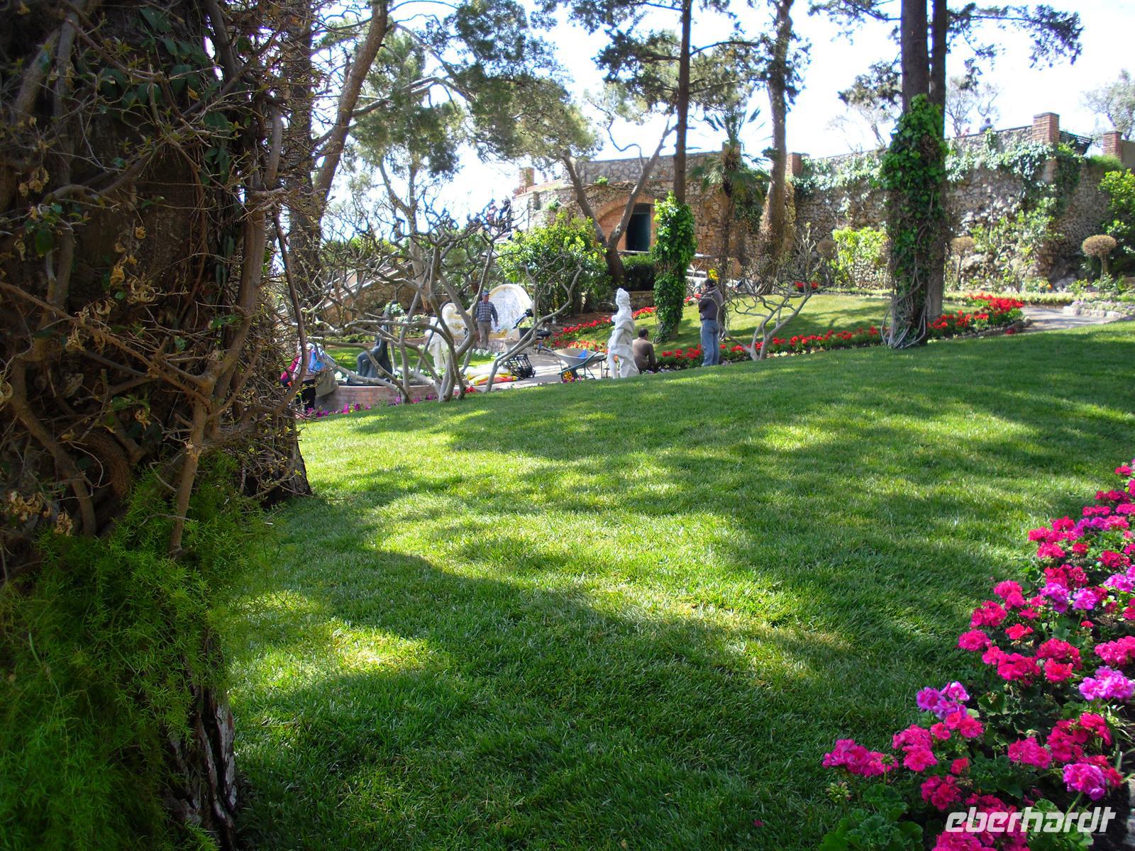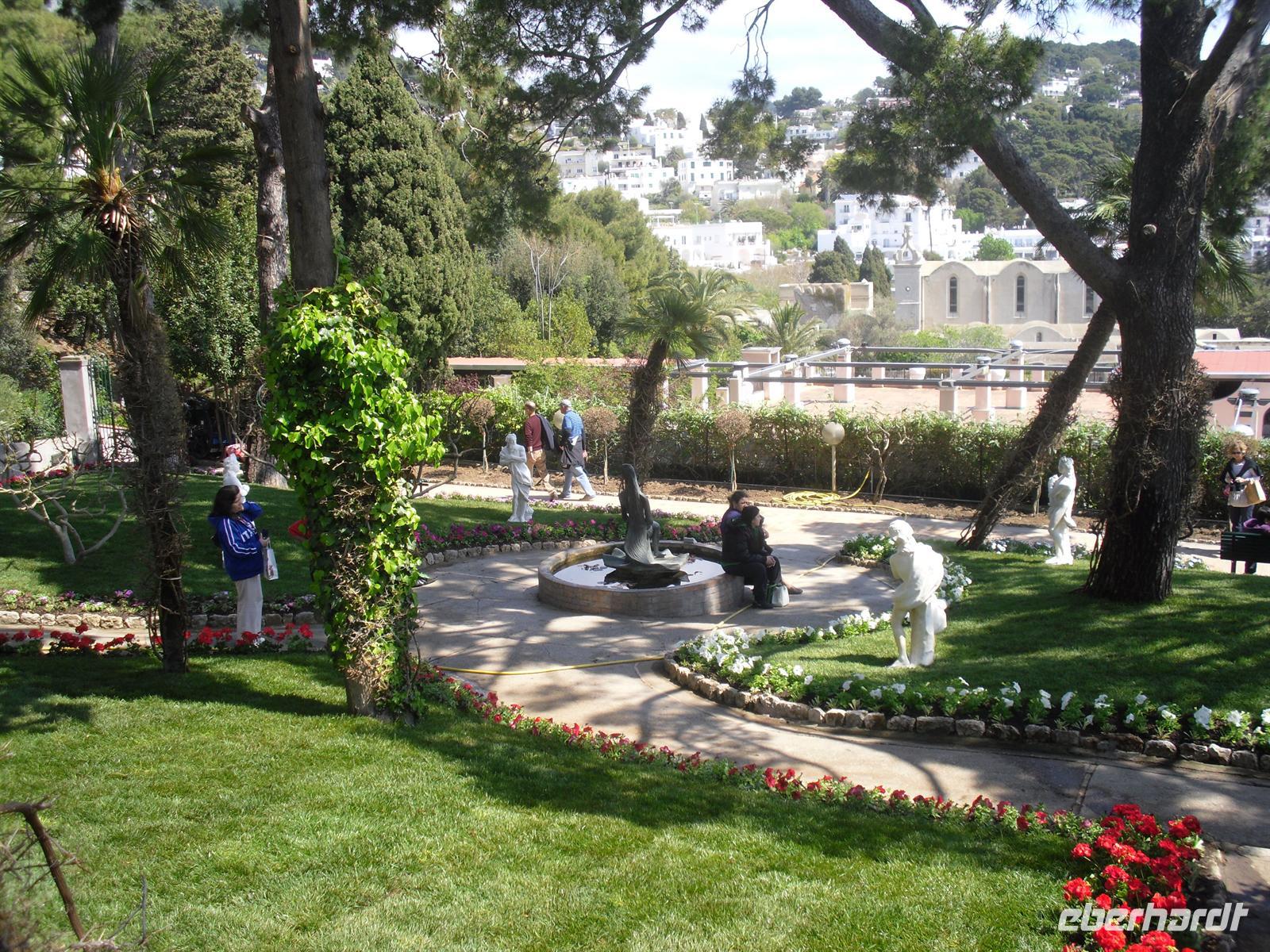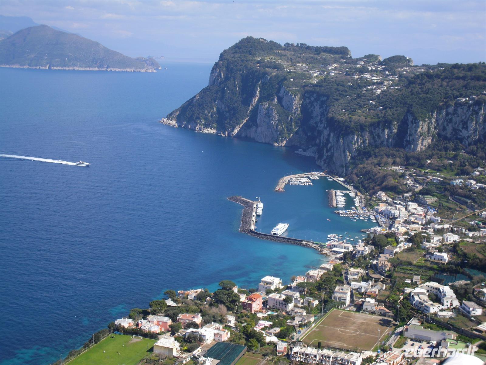 Der erste "Prominente", der auf die Insel ausstieg, war der Nachfolger des vergöttlichten Augustus, Kaiser Tiberius, der die Insel zu einer riesigen Privatvilla umbaute; Mauerreste sind übrigens zum Teil noch deutlich zu sehen. Capri ist heute für das Mittelmeergebiet ein Botanischer Garten, auf so engem Raum läßt sich sonst nirgends die Vielfalt der mittelmeerischen Pflanzenwelt beobachten. Rund 1.000 Arten sind es, davon 150, die nur auf der Insel Capri vorkommen! Für die Geologen sei erwähnt, dass Capri nur die Fortsetzung der amalfitanischen Halbinsel ist. Rund um die Insel sind über sechzig Höhlen und Grotten zu bewundern. Wir besuchen die beiden Inselorte, Capri und Anacapri - diese beiden Orte leben so lange man weiß in Fehde; sie hatten sich voneinander isoliert, erst die im letzten Jahrhundert geschaffene Straßenverbindung brachte eine Veränderung. Wir fahren in Minibussen auf den engen Strassen der Insel - sehr abenteuerlich! Am späten Nachmittag fahren mit der Fähre zurück auf das Festland nach Sorrent.