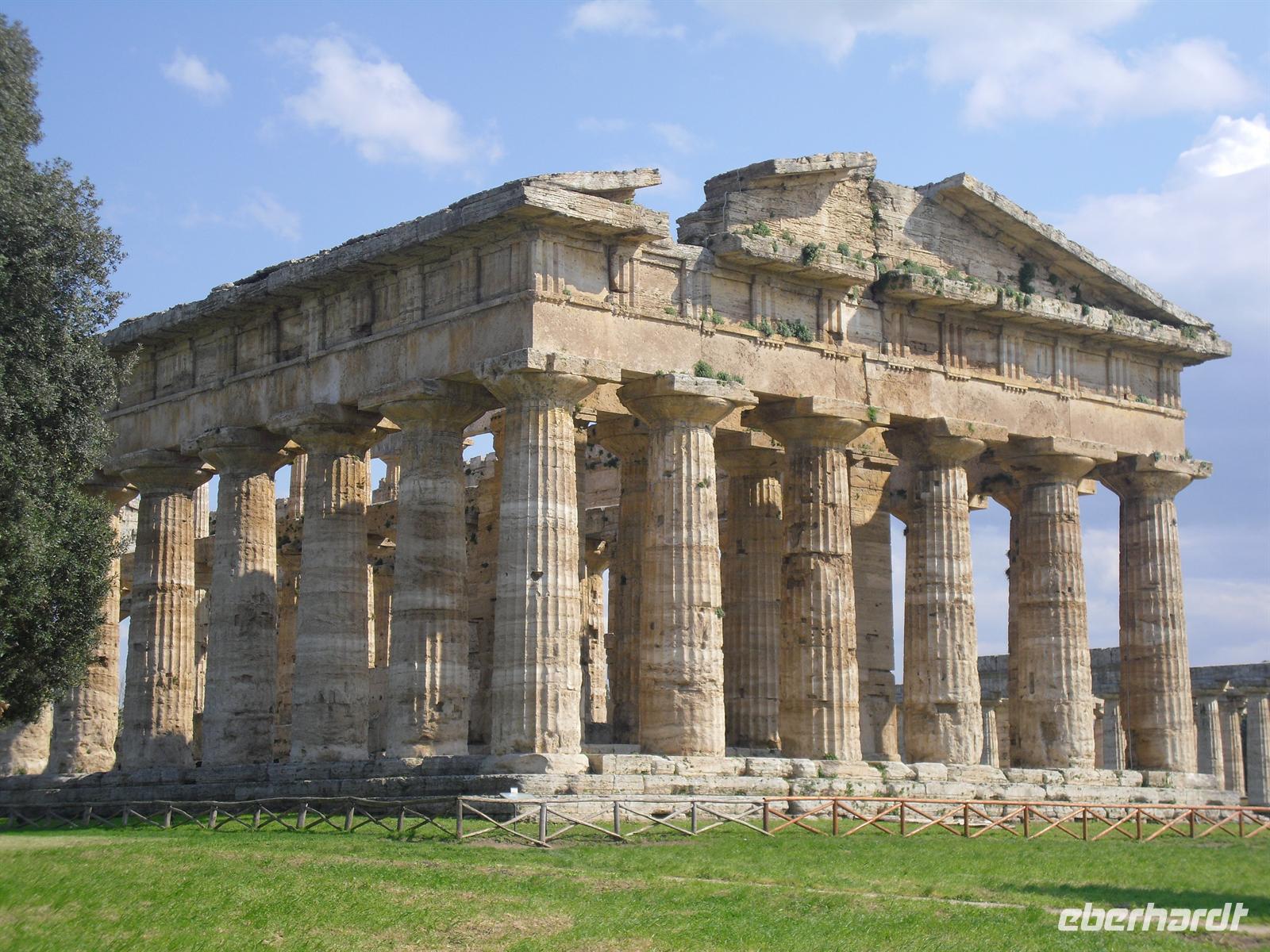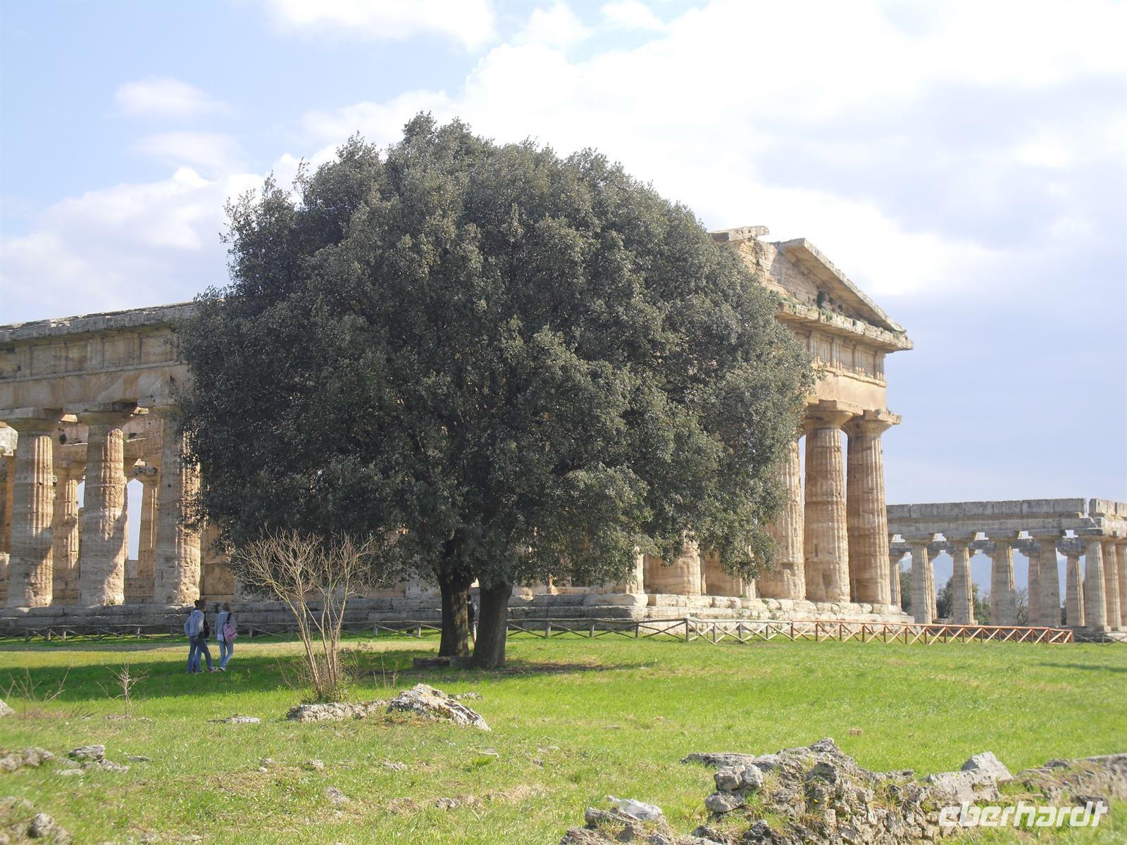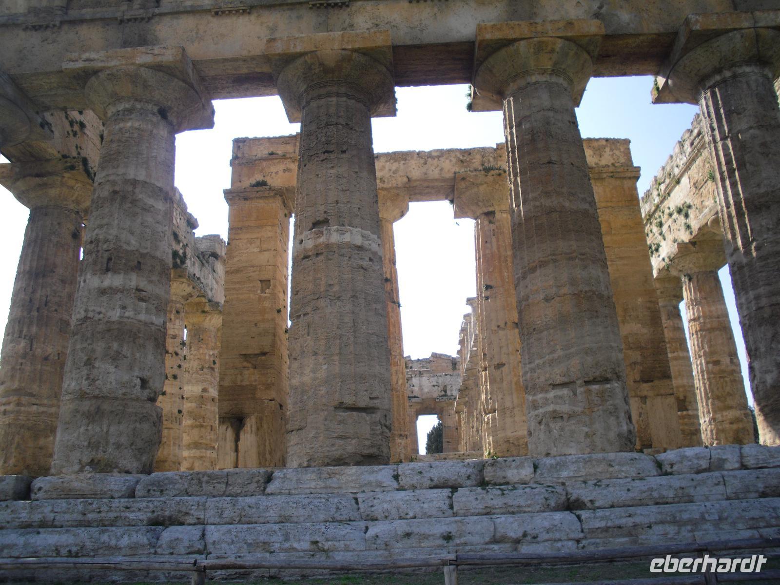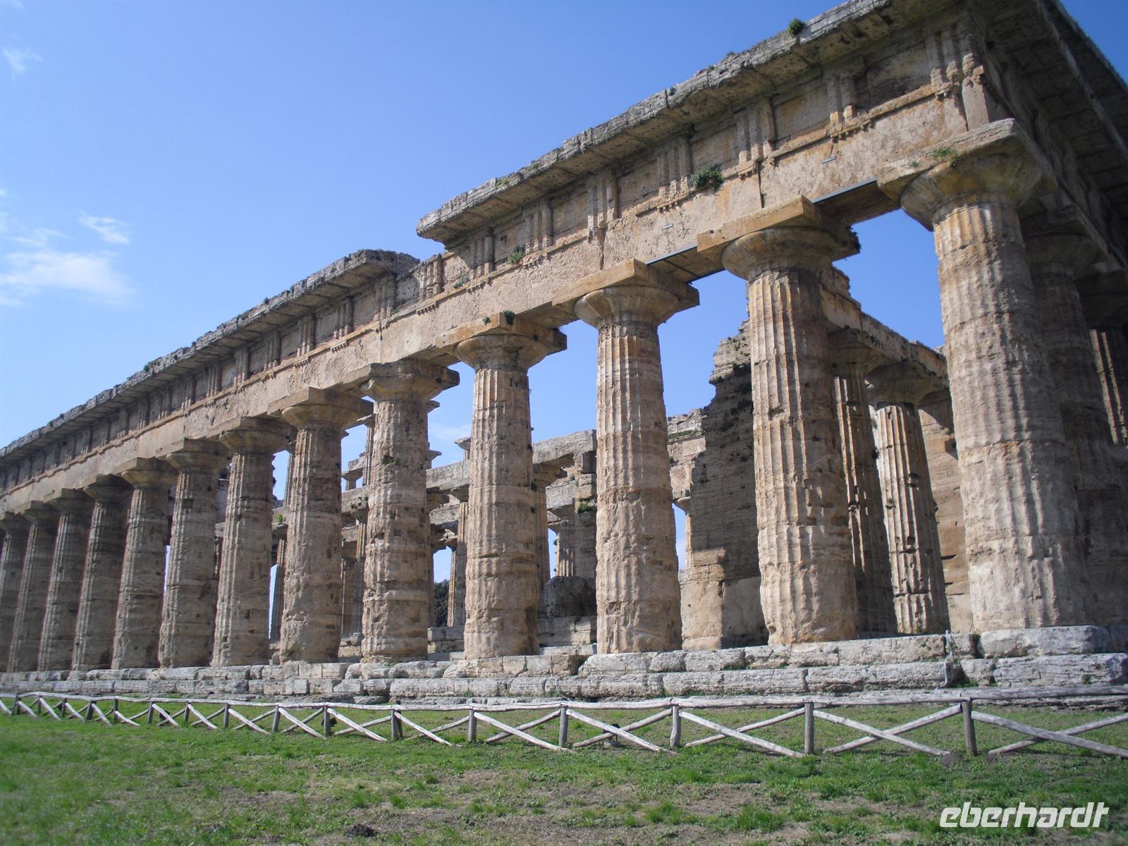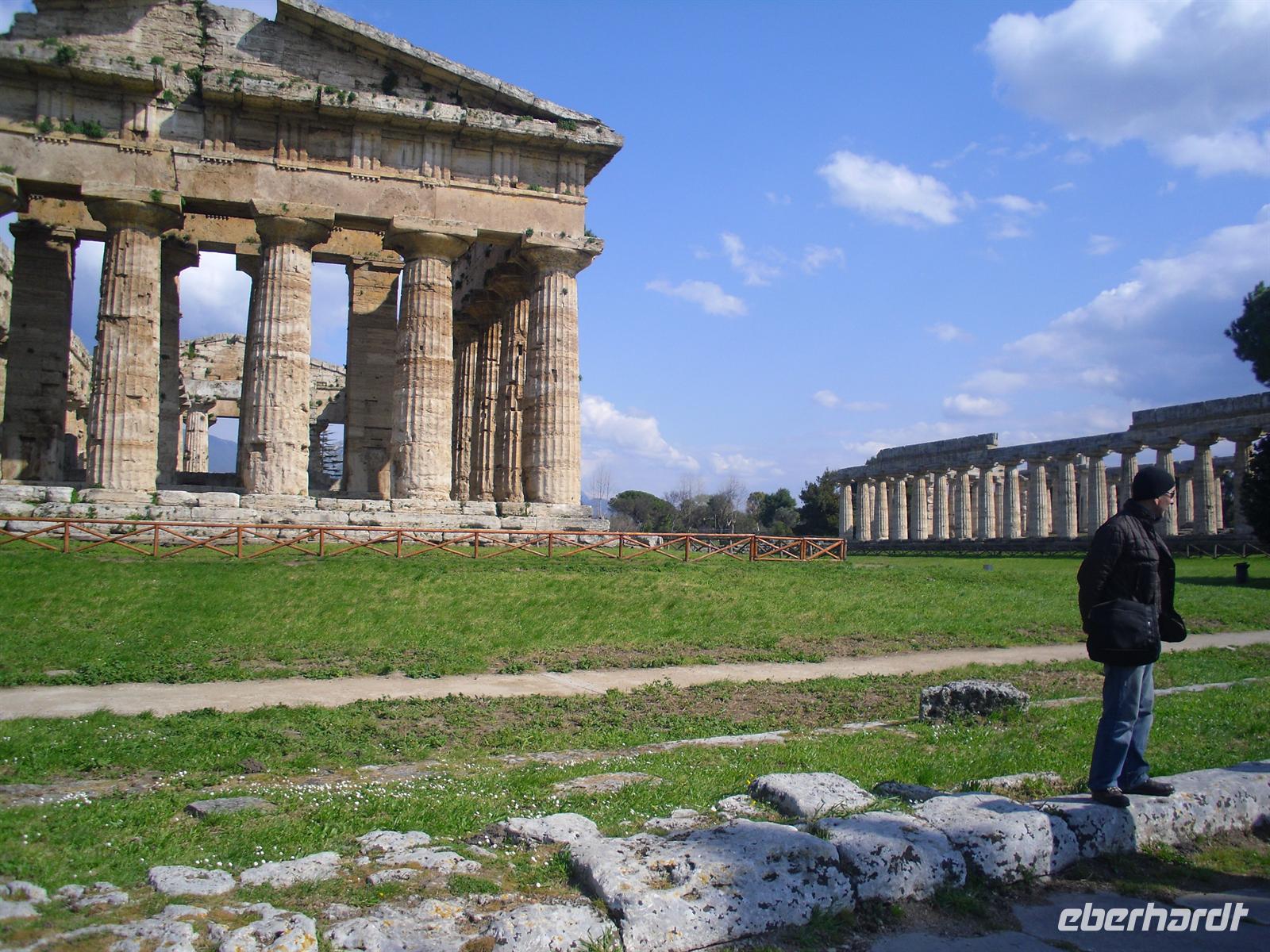 Hier können wir zuschauen, wie echter Büffelmozzarrella hergestellt wird bzw. erhalten wissenswerte Informationen zu diesem Prozess. Selbst eine Verkostung darf nicht fehlen! Die weißen in der Molke schwimmenden Frischkäse sind hier in der Ebene von Paestum ganz echter Mozzarella aus Büffelmilch, egal ob pflaumengroße „Bocconcini“ oder kiloschwer zu Zöpfen als „treccia“ verflochten. Büffel-Mozzarella ist fetter und saftiger, hat anders als das Konkurrenzprodukt aus Kuhmilch eine zarte Außenhaut mit etwas Biss. Kenner nennen das dann „croccante“. Geformt wird von Hand mit einem Griff wie Gurgelumdrehen (ital. „mozzare“), daher der Name. Genug kulinarisches für heute, Hauptanziehungspunkt heute ist natürlich Paestum - und dort die drei nahezu komplett erhaltenen griechischen Tempel nahe dem Meer. Das antike Paestum war eine der größten Griechenstädte Süditaliens, wichtige Hafenstadt im Handel mit Etrurien und damals ein sicherer Schlüssel zum Reichtum. Die Stadt wurde schließlich von den Lucaniern erobert, später wurde der Stadtstaat römische Kolonie und danach ländlicher; die Fernhandelswege hatten sich verlagert.