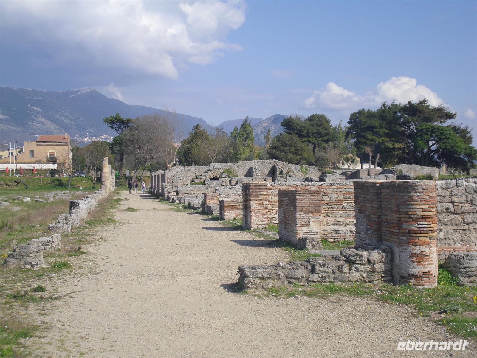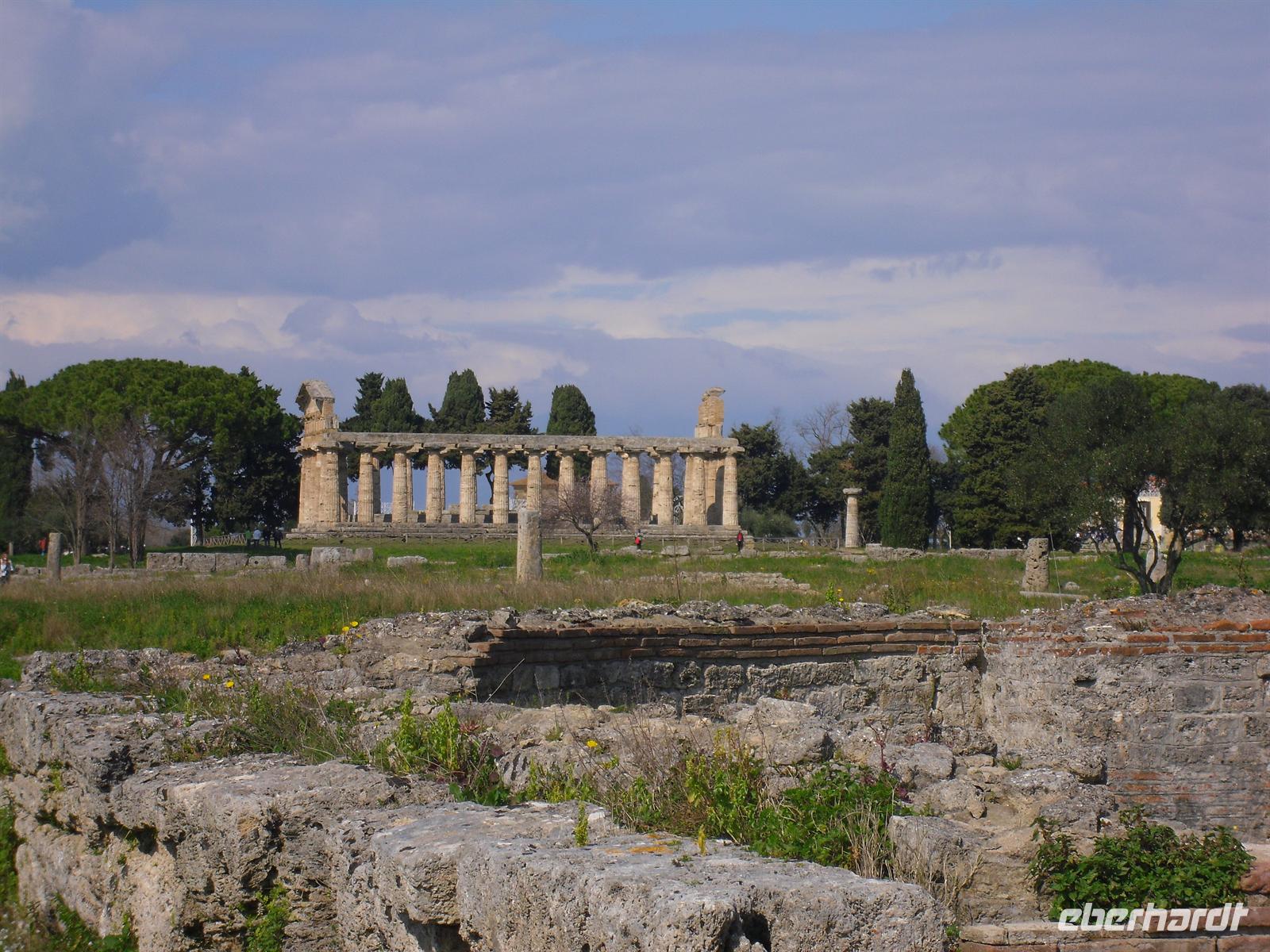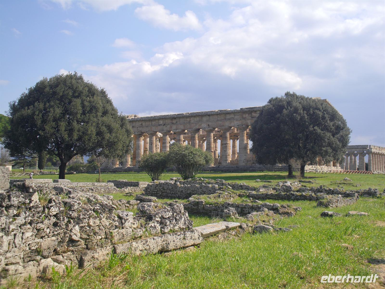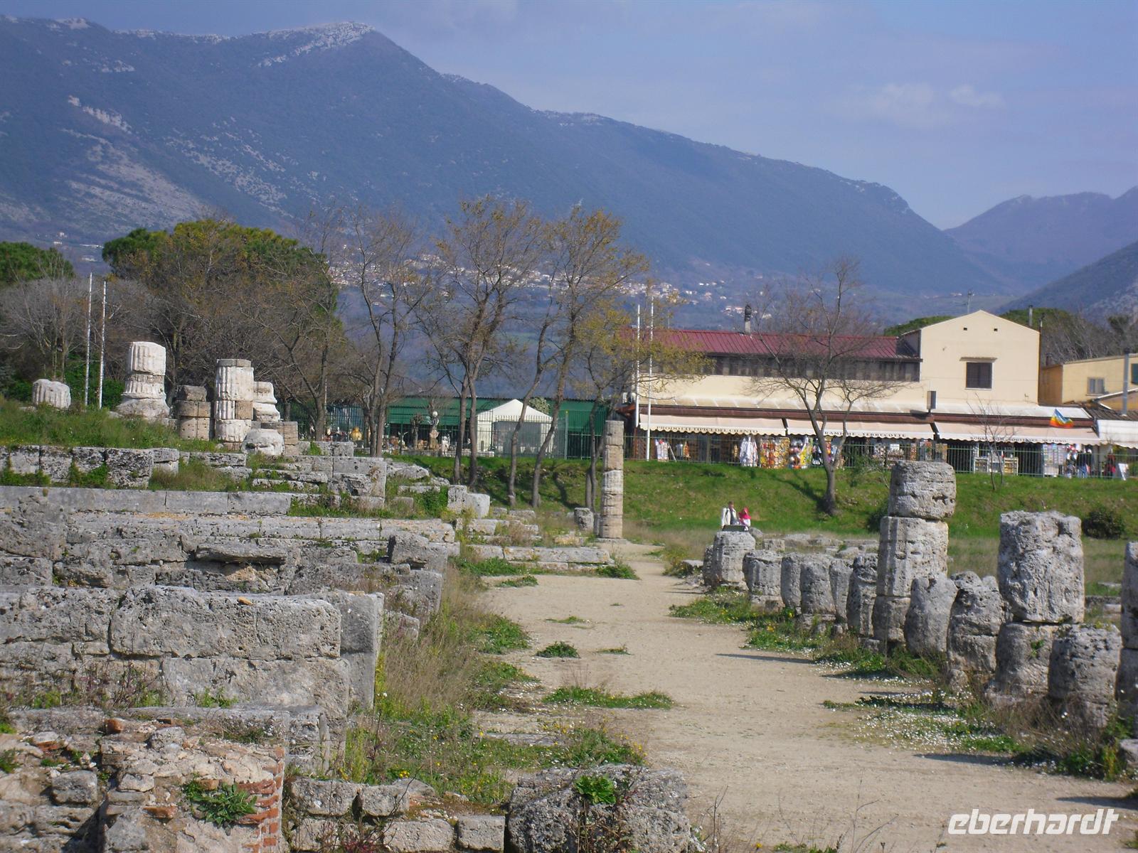 Hier können wir zuschauen, wie echter Büffelmozzarrella hergestellt wird bzw. erhalten wissenswerte Informationen zu diesem Prozess. Selbst eine Verkostung darf nicht fehlen! Die weißen in der Molke schwimmenden Frischkäse sind hier in der Ebene von Paestum ganz echter Mozzarella aus Büffelmilch, egal ob pflaumengroße „Bocconcini“ oder kiloschwer zu Zöpfen als „treccia“ verflochten. Büffel-Mozzarella ist fetter und saftiger, hat anders als das Konkurrenzprodukt aus Kuhmilch eine zarte Außenhaut mit etwas Biss. Kenner nennen das dann „croccante“. Geformt wird von Hand mit einem Griff wie Gurgelumdrehen (ital. „mozzare“), daher der Name. Genug kulinarisches für heute, Hauptanziehungspunkt heute ist natürlich Paestum - und dort die drei nahezu komplett erhaltenen griechischen Tempel nahe dem Meer. Das antike Paestum war eine der größten Griechenstädte Süditaliens, wichtige Hafenstadt im Handel mit Etrurien und damals ein sicherer Schlüssel zum Reichtum. Die Stadt wurde schließlich von den Lucaniern erobert, später wurde der Stadtstaat römische Kolonie und danach ländlicher; die Fernhandelswege hatten sich verlagert.