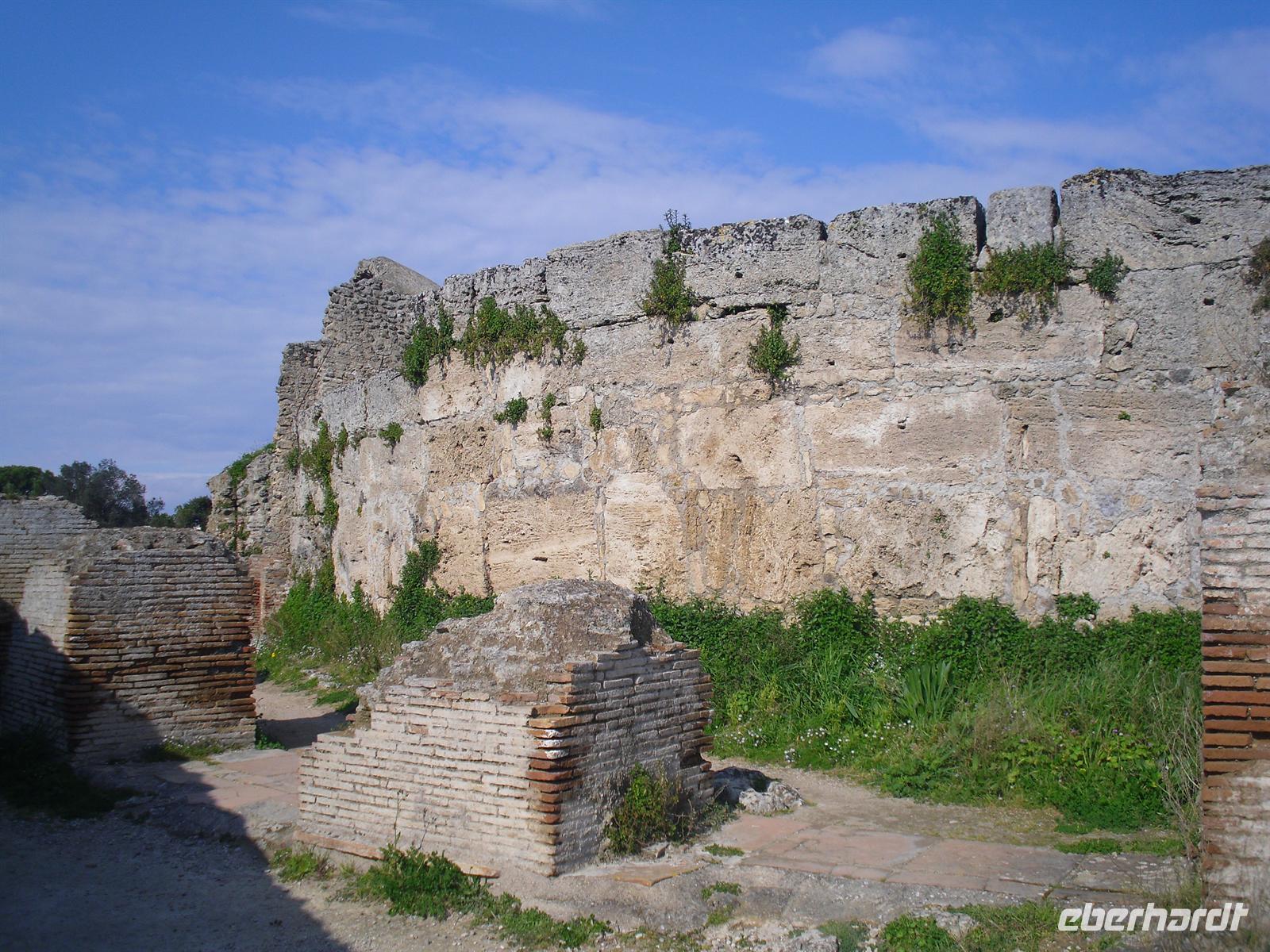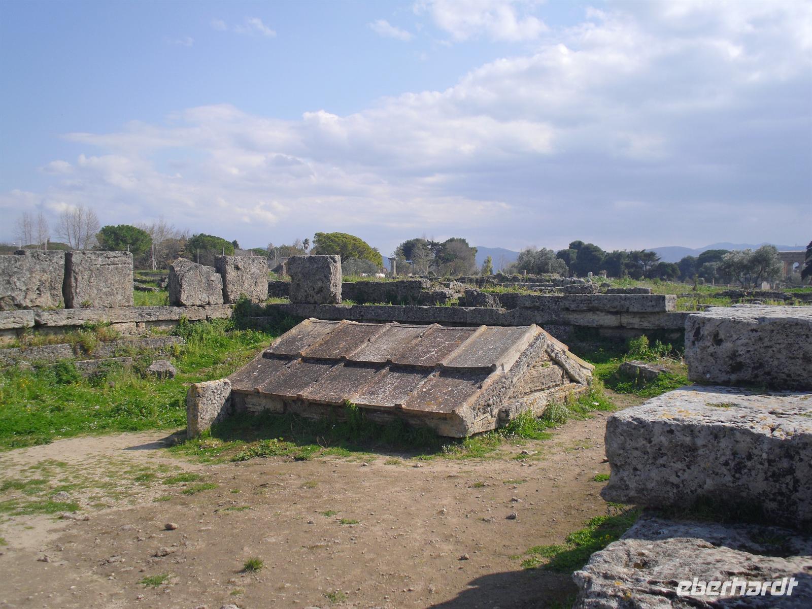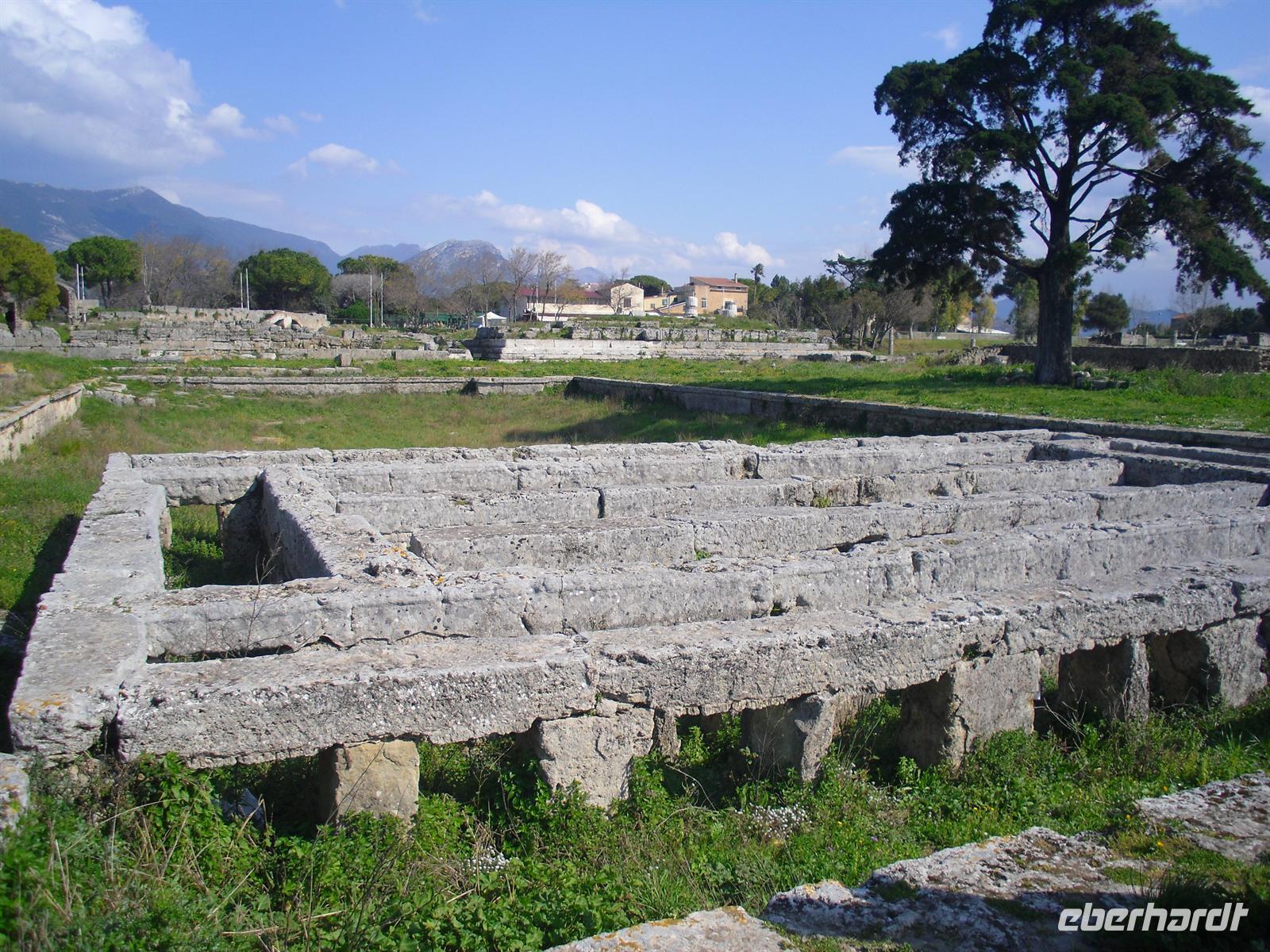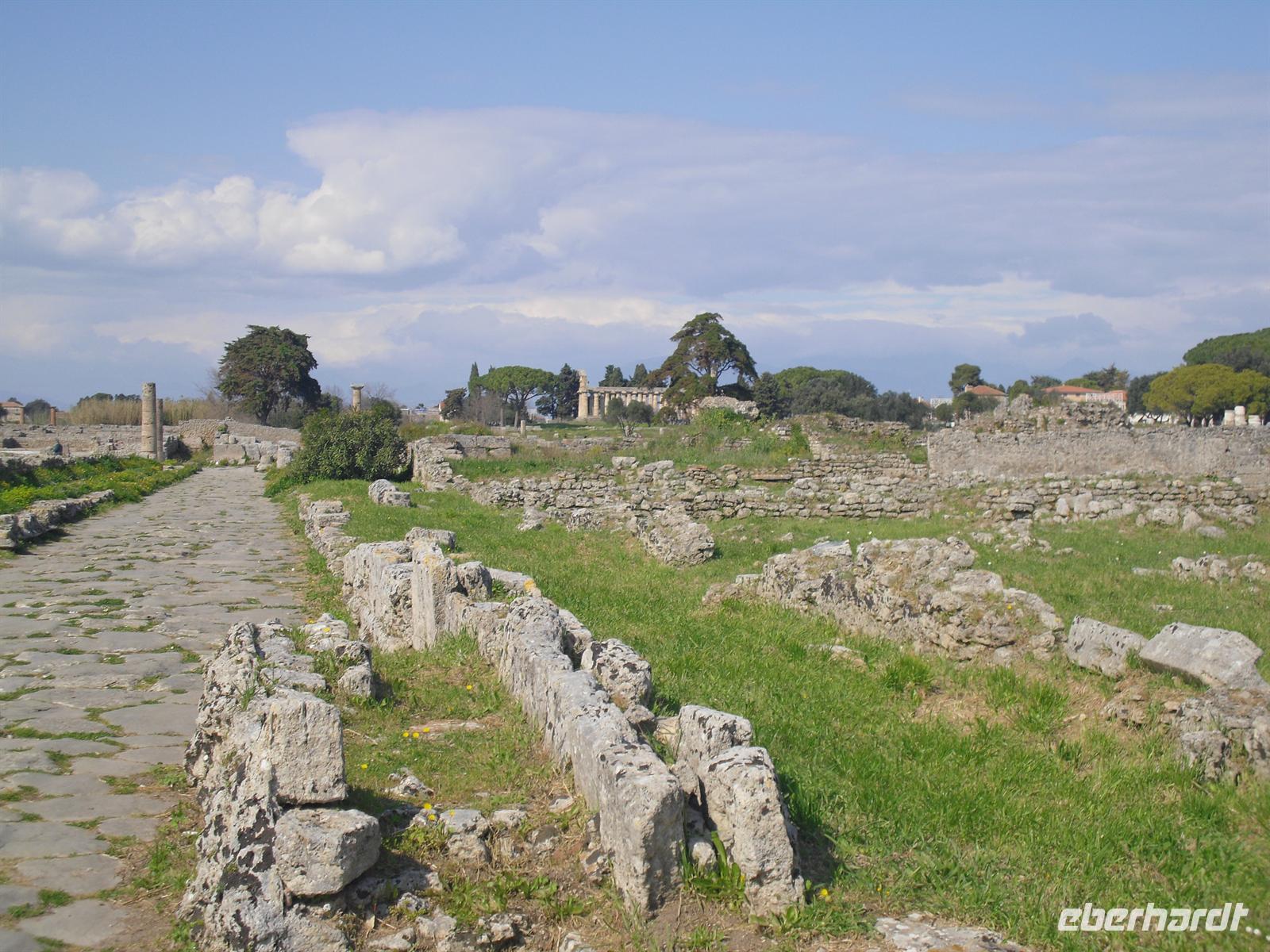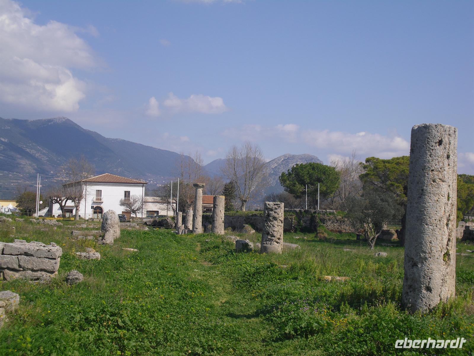 Hier können wir zuschauen, wie echter Büffelmozzarrella hergestellt wird bzw. erhalten wissenswerte Informationen zu diesem Prozess. Selbst eine Verkostung darf nicht fehlen! Die weißen in der Molke schwimmenden Frischkäse sind hier in der Ebene von Paestum ganz echter Mozzarella aus Büffelmilch, egal ob pflaumengroße „Bocconcini“ oder kiloschwer zu Zöpfen als „treccia“ verflochten. Büffel-Mozzarella ist fetter und saftiger, hat anders als das Konkurrenzprodukt aus Kuhmilch eine zarte Außenhaut mit etwas Biss. Kenner nennen das dann „croccante“. Geformt wird von Hand mit einem Griff wie Gurgelumdrehen (ital. „mozzare“), daher der Name. Genug kulinarisches für heute, Hauptanziehungspunkt heute ist natürlich Paestum - und dort die drei nahezu komplett erhaltenen griechischen Tempel nahe dem Meer. Das antike Paestum war eine der größten Griechenstädte Süditaliens, wichtige Hafenstadt im Handel mit Etrurien und damals ein sicherer Schlüssel zum Reichtum. Die Stadt wurde schließlich von den Lucaniern erobert, später wurde der Stadtstaat römische Kolonie und danach ländlicher; die Fernhandelswege hatten sich verlagert.
