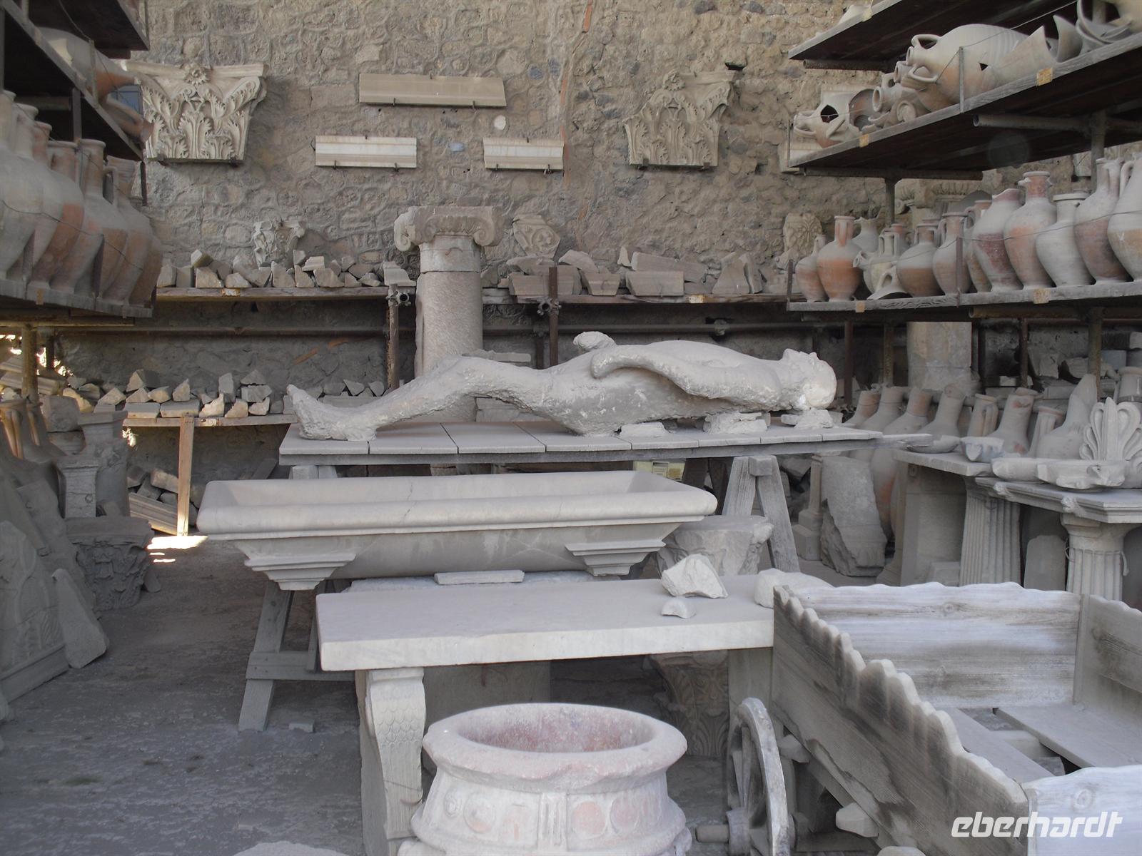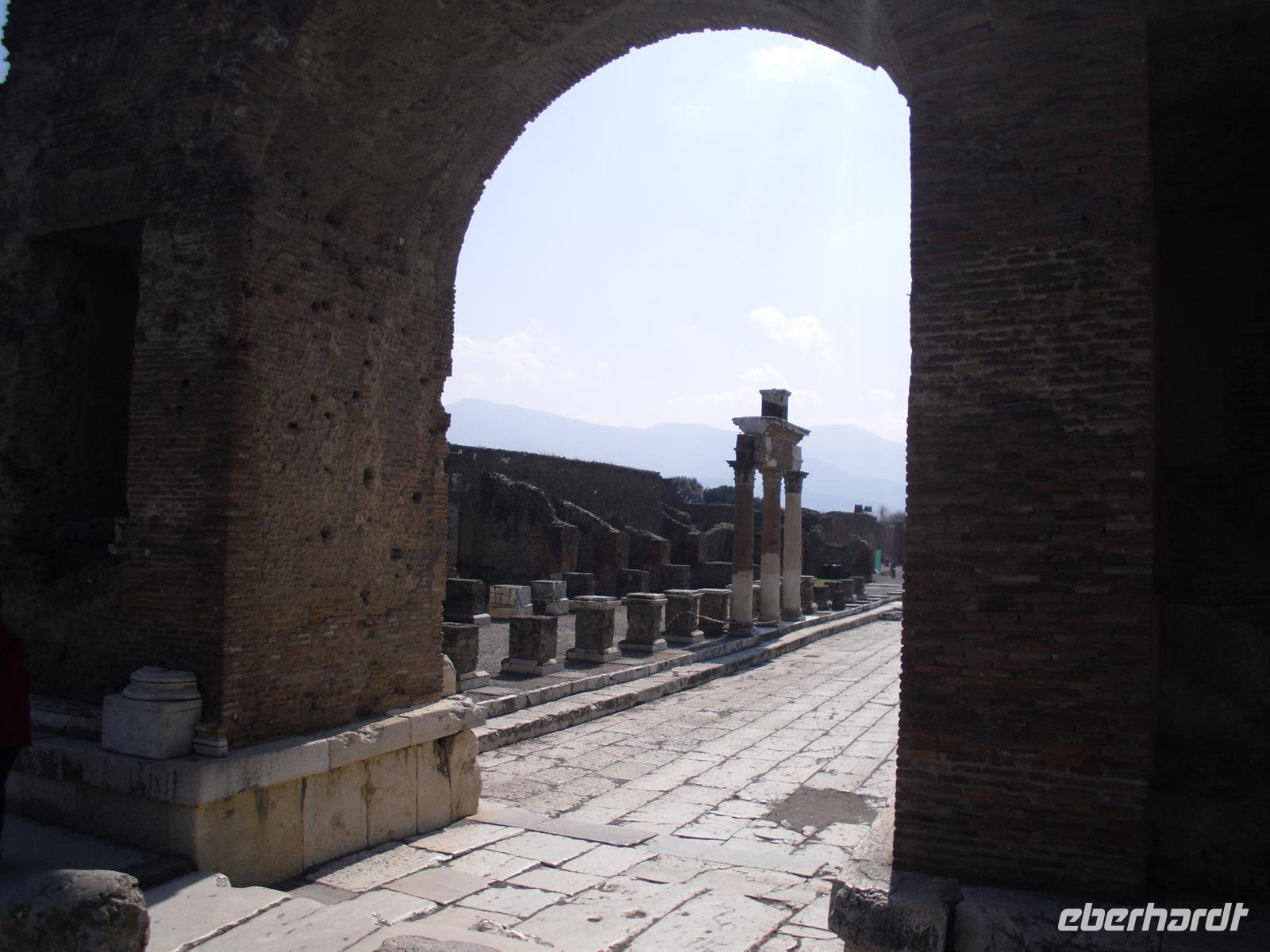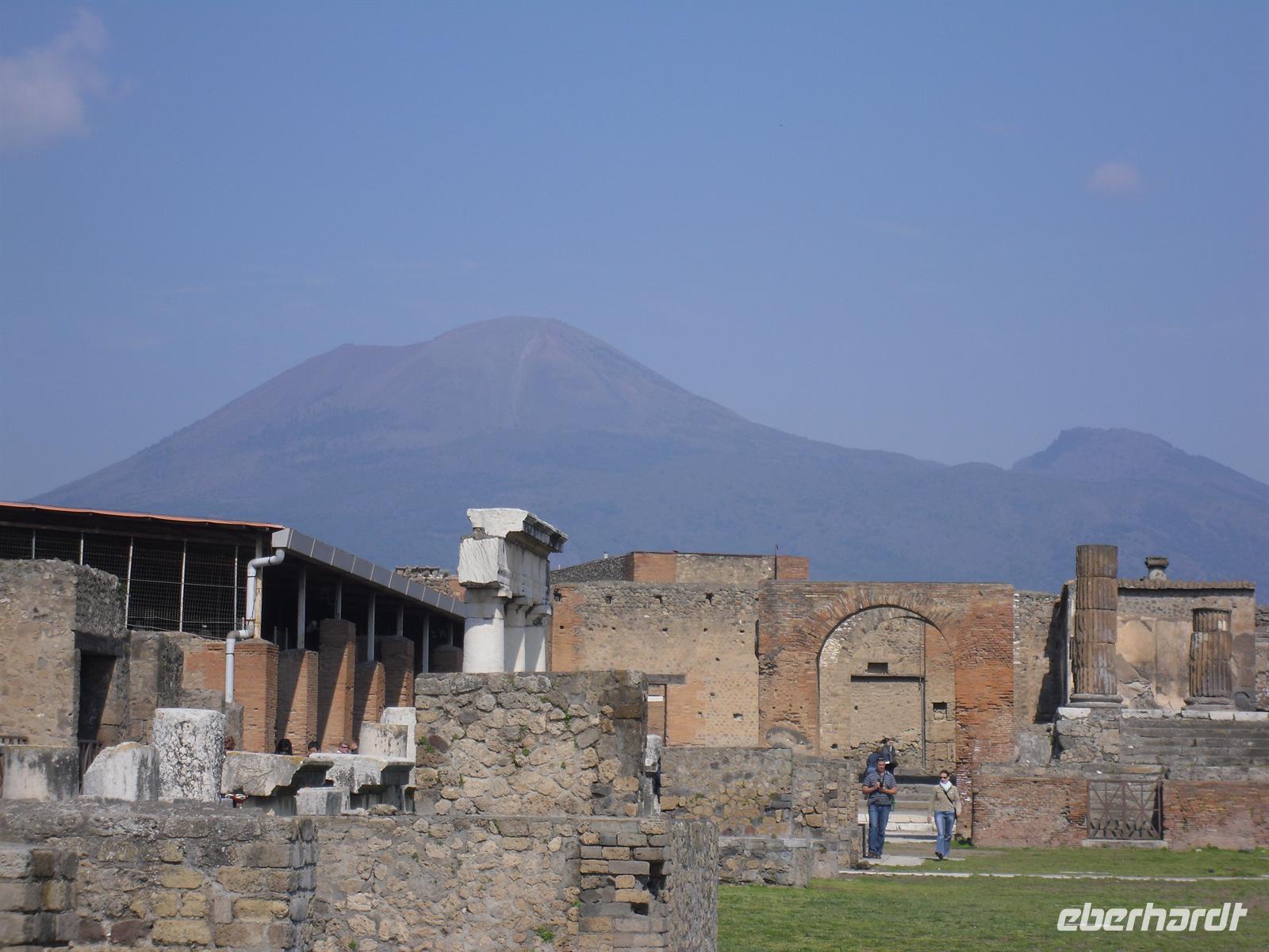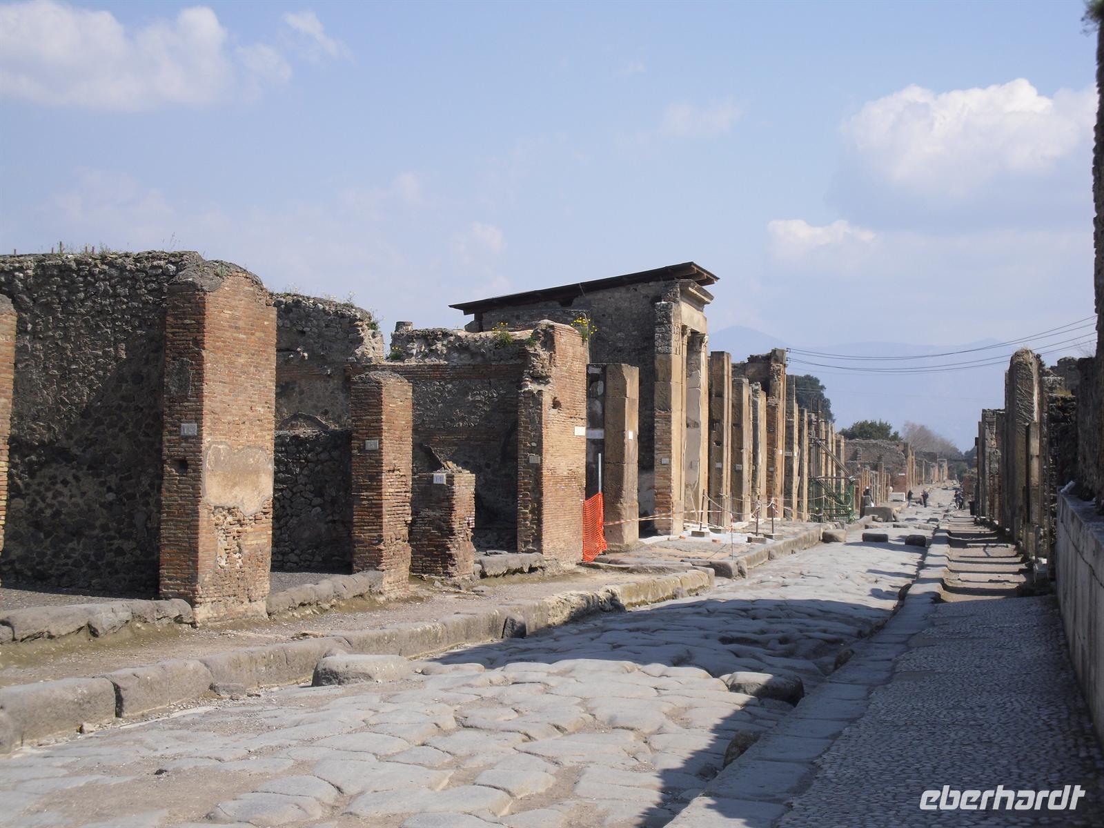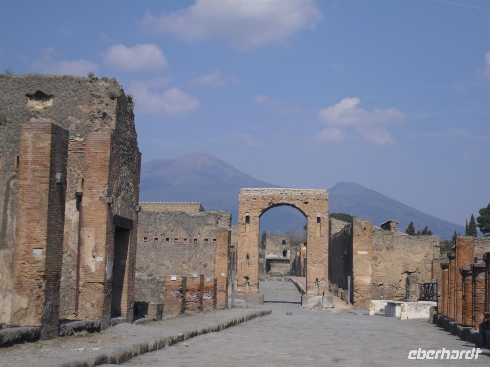 Die archäologische Zone von Pompei ist heute ein riesiges Freilichtmuseum römischer Lebensweise. Pompei ist eine Stadt, die innerhalb von Stunden von ihren Bewohnern verlassen wurde und dann bis zu ihrer Ausgrabung keine Veränderung mehr erfuhr. Mit der Katastrophe des Jahres 79 hatte niemand gerechnet. Das schwere Erdbeben 16 Jahre zuvor signalisierte nach heutigen Erkenntnissen wahrscheinlich das Ende einer langen Ruhephase des Vulkans, denn auch in späterer Zeit waren Ausbruchsperioden fast immer von Erdbeben begleitet oder vorangekündigt. Das ausgegrabene Pompei zeigt deutliche Spuren des Erdbebens und überall in der Stadt weisen Mörtelhaufen und Baumaterial auf den noch andauernden Wiederaufbau hin. Es ist für uns heute unvorstellbar, aber man muss sich vorstellen, dass im Jahre 79 der obere Teil des Vesuvs unter dem Druck der aufsteigenden Gase regelrecht explodierte. Über dem Berg stand eine riesige, wie eine Pinie geformte Aschenwolke, die dann auf die Umgebung, besonders auf Pompei niederregnete. Der Untergang Pompeis erfolgte keineswegs innerhalb von Minuten, sondern dauerte Stunden und Tage, so dass mit Sicherheit der größte Teil der Einwohner zumindest das nackte Leben retten konnte. Schließlich erstickten hochgiftige Gase und die sich meterhoch auftürmenden heißen Vulkanaschen alles Leben. Was jetzt noch an lebenden Wesen zurückgeblieben war, wurde von der Asche wie von einer Gussform eingehüllt, Fleisch und Knochen verbrannten und wurden von ätzenden, scharfen Mineralsalzen zerfressen - ein Hohlraum entstand.
