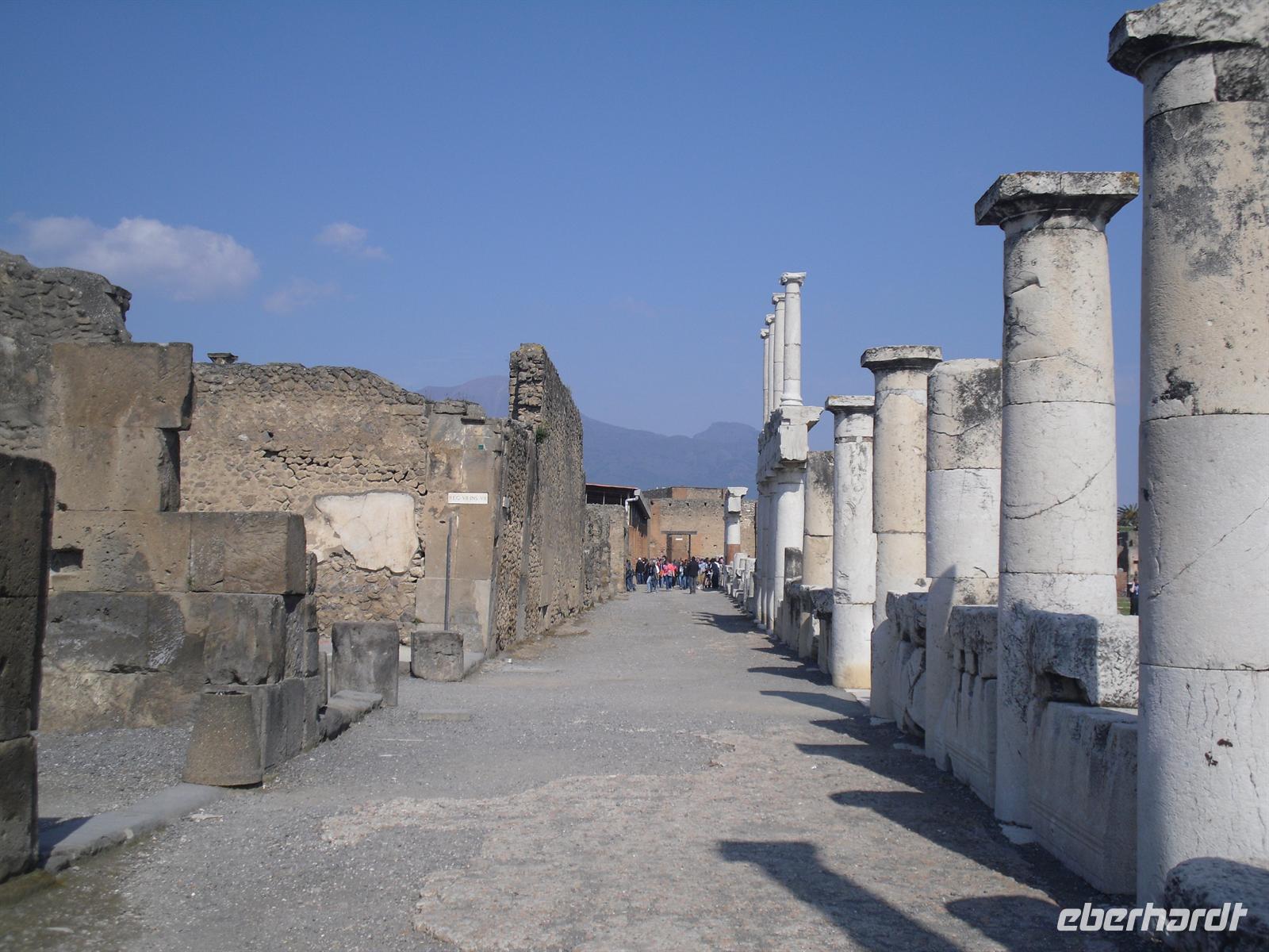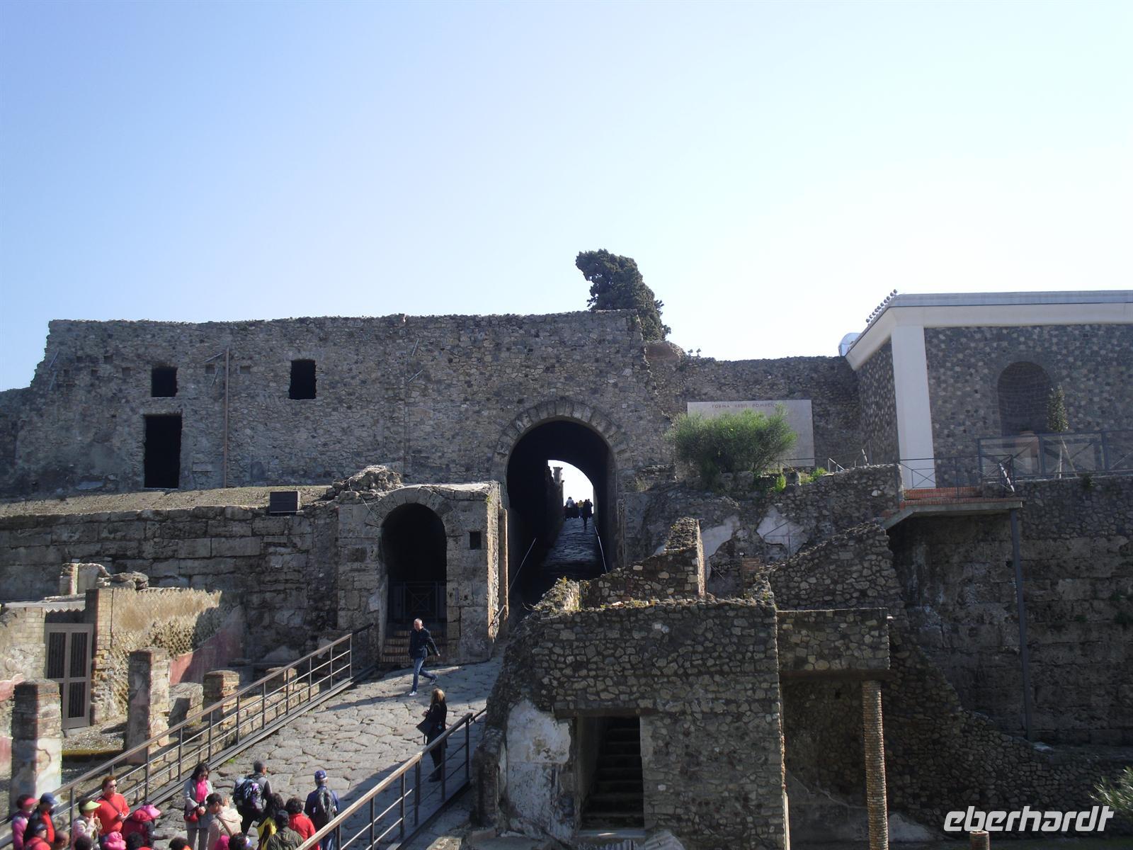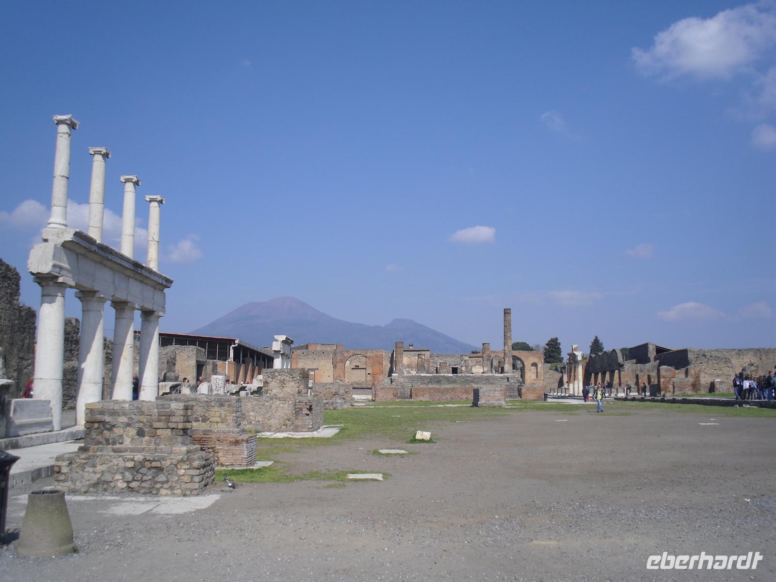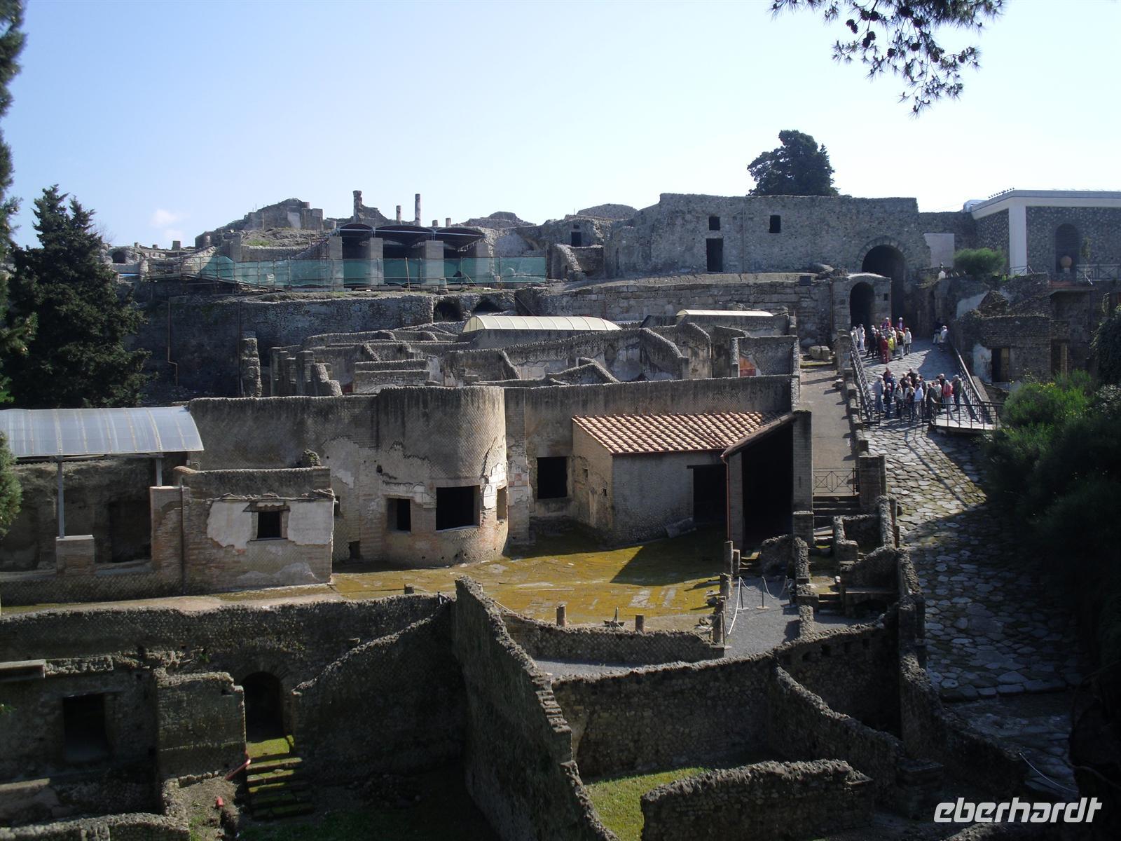 Die archäologische Zone von Pompei ist heute ein riesiges Freilichtmuseum römischer Lebensweise. Pompei ist eine Stadt, die innerhalb von Stunden von ihren Bewohnern verlassen wurde und dann bis zu ihrer Ausgrabung keine Veränderung mehr erfuhr. Mit der Katastrophe des Jahres 79 hatte niemand gerechnet. Das schwere Erdbeben 16 Jahre zuvor signalisierte nach heutigen Erkenntnissen wahrscheinlich das Ende einer langen Ruhephase des Vulkans, denn auch in späterer Zeit waren Ausbruchsperioden fast immer von Erdbeben begleitet oder vorangekündigt. Das ausgegrabene Pompei zeigt deutliche Spuren des Erdbebens und überall in der Stadt weisen Mörtelhaufen und Baumaterial auf den noch andauernden Wiederaufbau hin. Es ist für uns heute unvorstellbar, aber man muss sich vorstellen, dass im Jahre 79 der obere Teil des Vesuvs unter dem Druck der aufsteigenden Gase regelrecht explodierte. Über dem Berg stand eine riesige, wie eine Pinie geformte Aschenwolke, die dann auf die Umgebung, besonders auf Pompei niederregnete. Der Untergang Pompeis erfolgte keineswegs innerhalb von Minuten, sondern dauerte Stunden und Tage, so dass mit Sicherheit der größte Teil der Einwohner zumindest das nackte Leben retten konnte. Schließlich erstickten hochgiftige Gase und die sich meterhoch auftürmenden heißen Vulkanaschen alles Leben. Was jetzt noch an lebenden Wesen zurückgeblieben war, wurde von der Asche wie von einer Gussform eingehüllt, Fleisch und Knochen verbrannten und wurden von ätzenden, scharfen Mineralsalzen zerfressen - ein Hohlraum entstand.