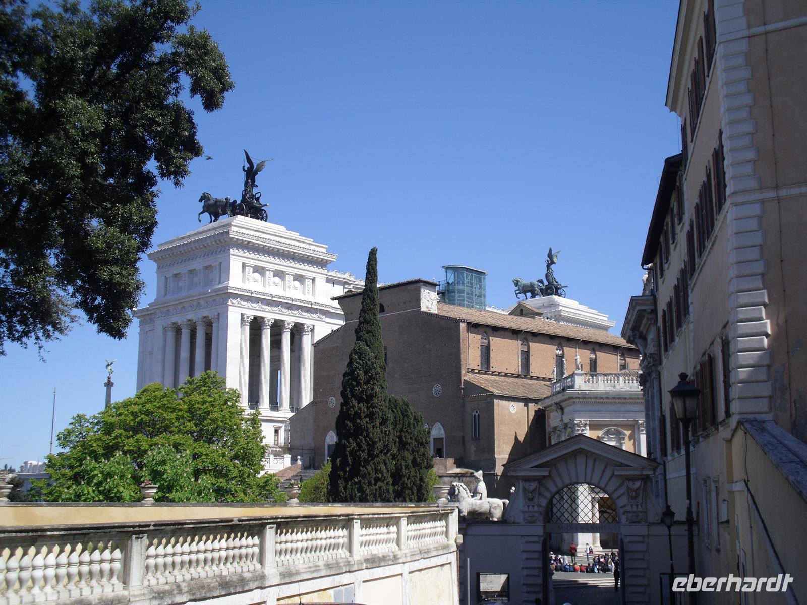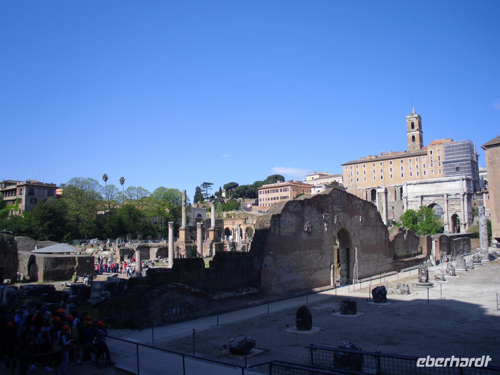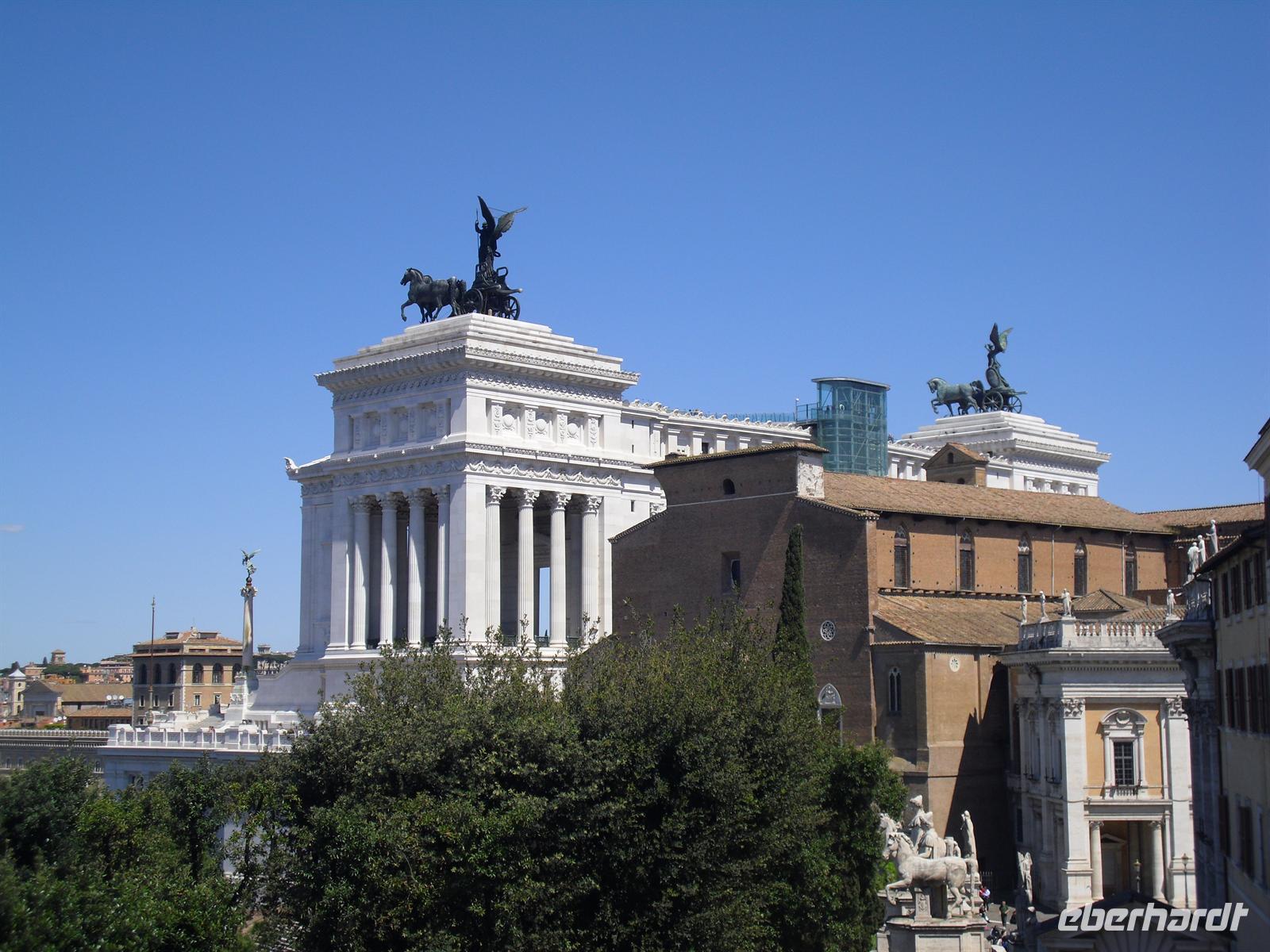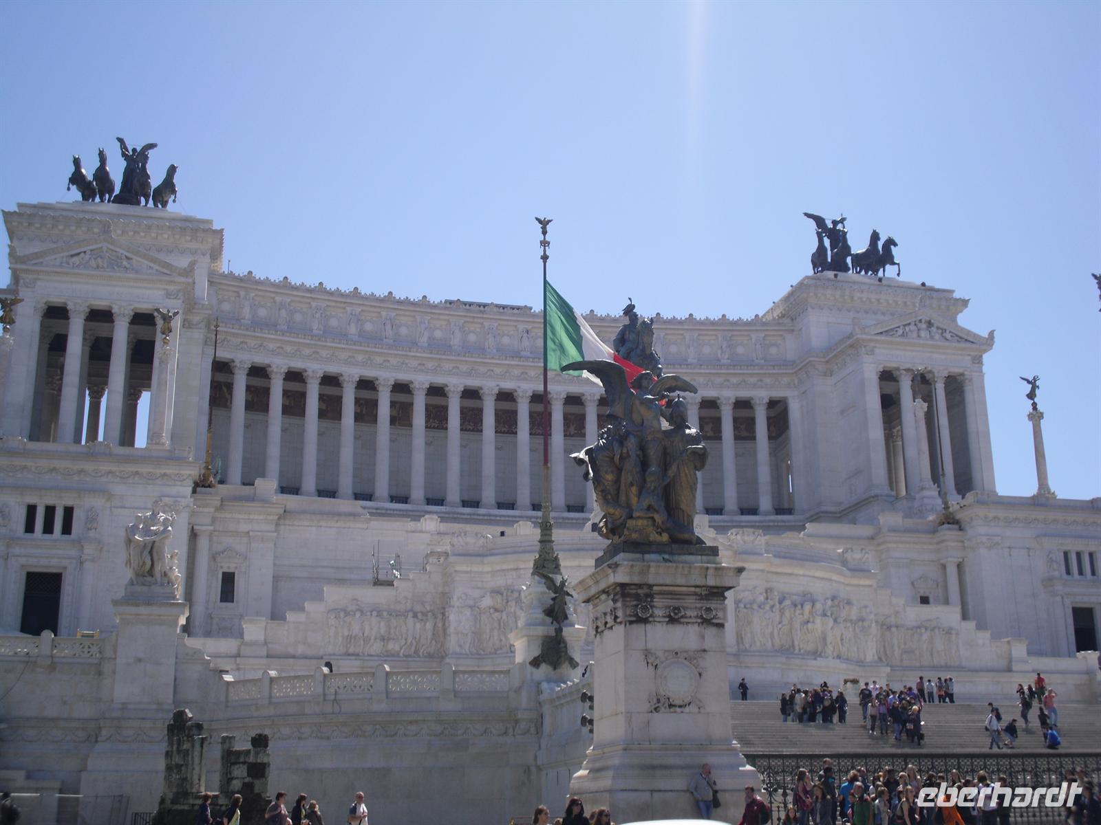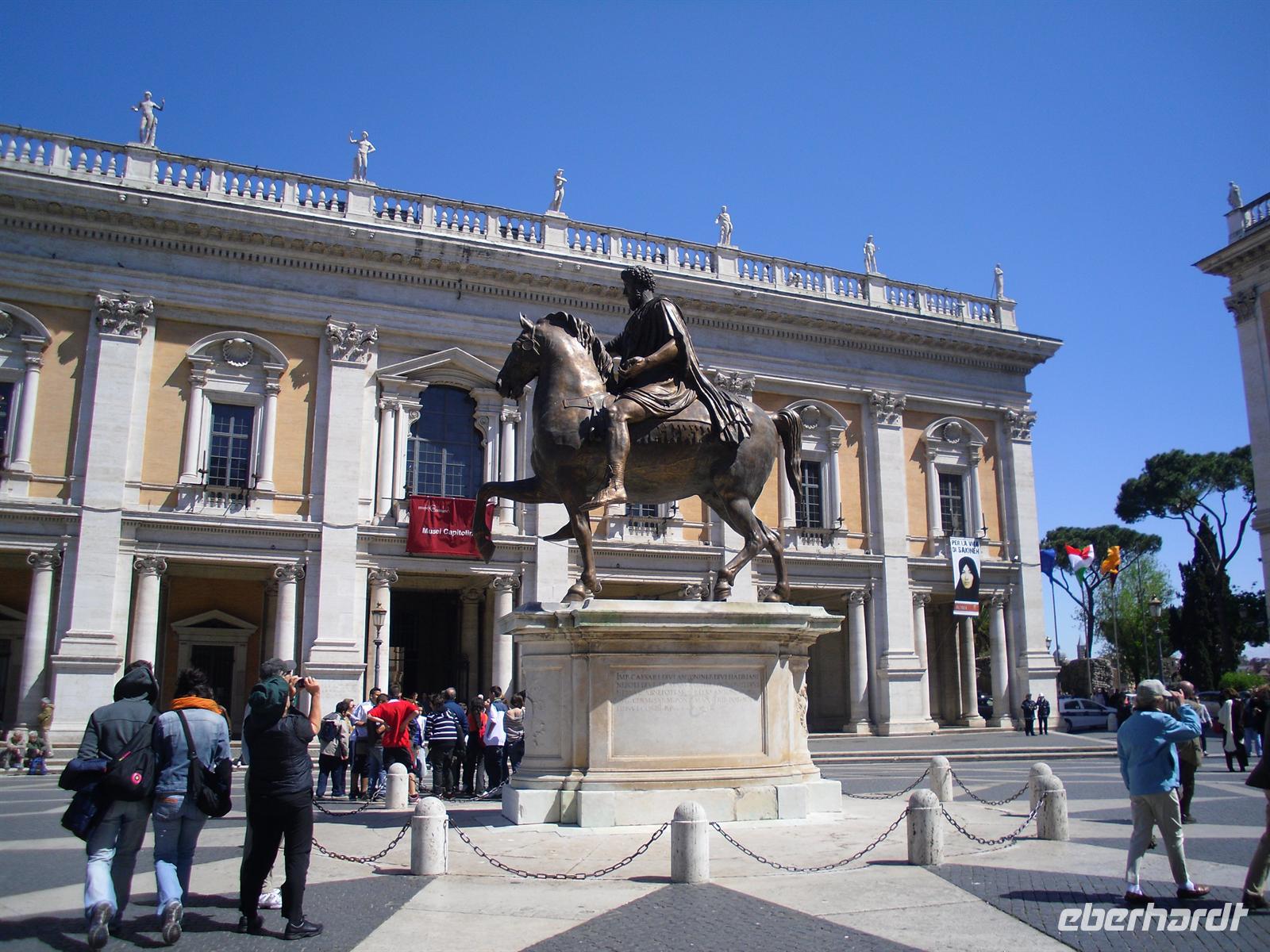 Das Kolosseum sehen wir von außen, ansonsten würde das unseren zeitlichen Rahmen sprengen; Kaiser Vespasian begann den Bau 72 n. Chr., sein Sohn Titus weihte die Arena nach nur achtjähriger Bauzeit mit hunderttägigen Festspielen ein. Unzählige Tiere und Gladiatoren wurden geopfert. Sehr lebendig sind allerdings noch die Legionäre, mit denen man hier gegen ein Entgeld für ein Foto posieren kann. Weiter spazieren wir durch das Forum Romanum. Von den Kaiserforen wurde nicht nur Rom, sondern das ganze Römische Reich regiert. Hier lag für fast 1.000 Jahre das Zentrum der Antike. Der Etruskerkönig Priscus hatte im 6. Jh. v. Chr. den Sumpf zwischen Kapitol, Palatin und Esquilin entwässert und als „Cloaca Maxima“, die erste große Kläranlage der Antike, dem Tiber zugeführt. Das Forum Romanum, ursprünglich als Vestaheiligtum gedacht, entwickelte sich vom Viehmarkt zur politischen Arena. Anschließend spazieren wir zum Kapitolshügel hinauf - hier standen einst die Tempel Jupiters und Junos. Michelangelo gestaltete im Jahr 1536 den trapezförmigen Kapitolsplatz, der vom Palazzo dei Senatori, dem Palazzo dei Conservatori und dem Palazzo Nuovo gerahmt wird. Den Piedestal, wo Kaiser Mark Aurel seit 1538 mit erhobener Hand grüßte, schmückt heute eine Kopie. Vor Umweltschäden bewahrt steht das originale Reiterstandbild aus dem 2. Jh. in den Kapitolinischen Museen.